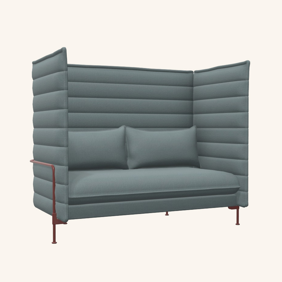 Seat and backrest in fabric (blue). Legs in metal (red).