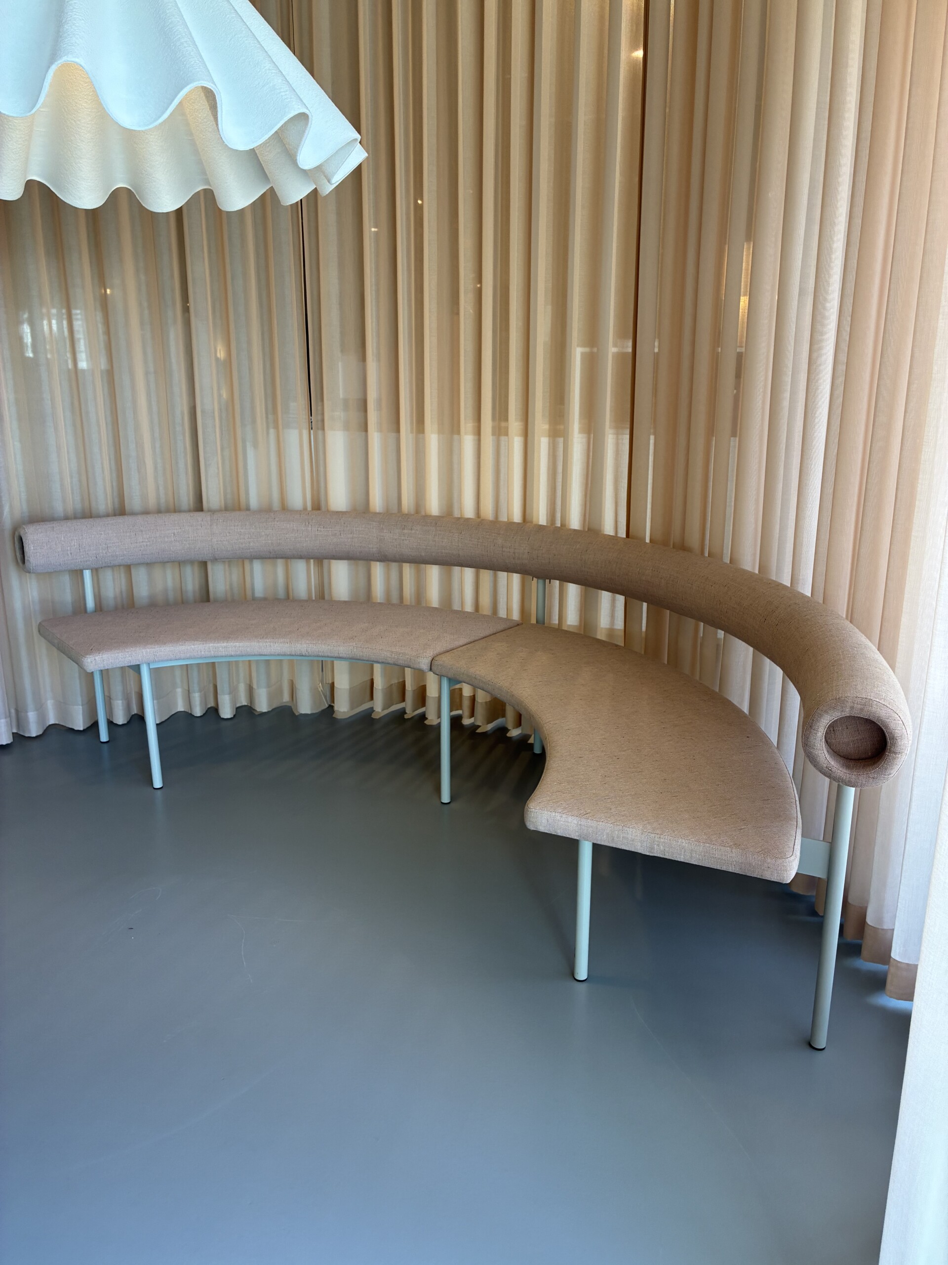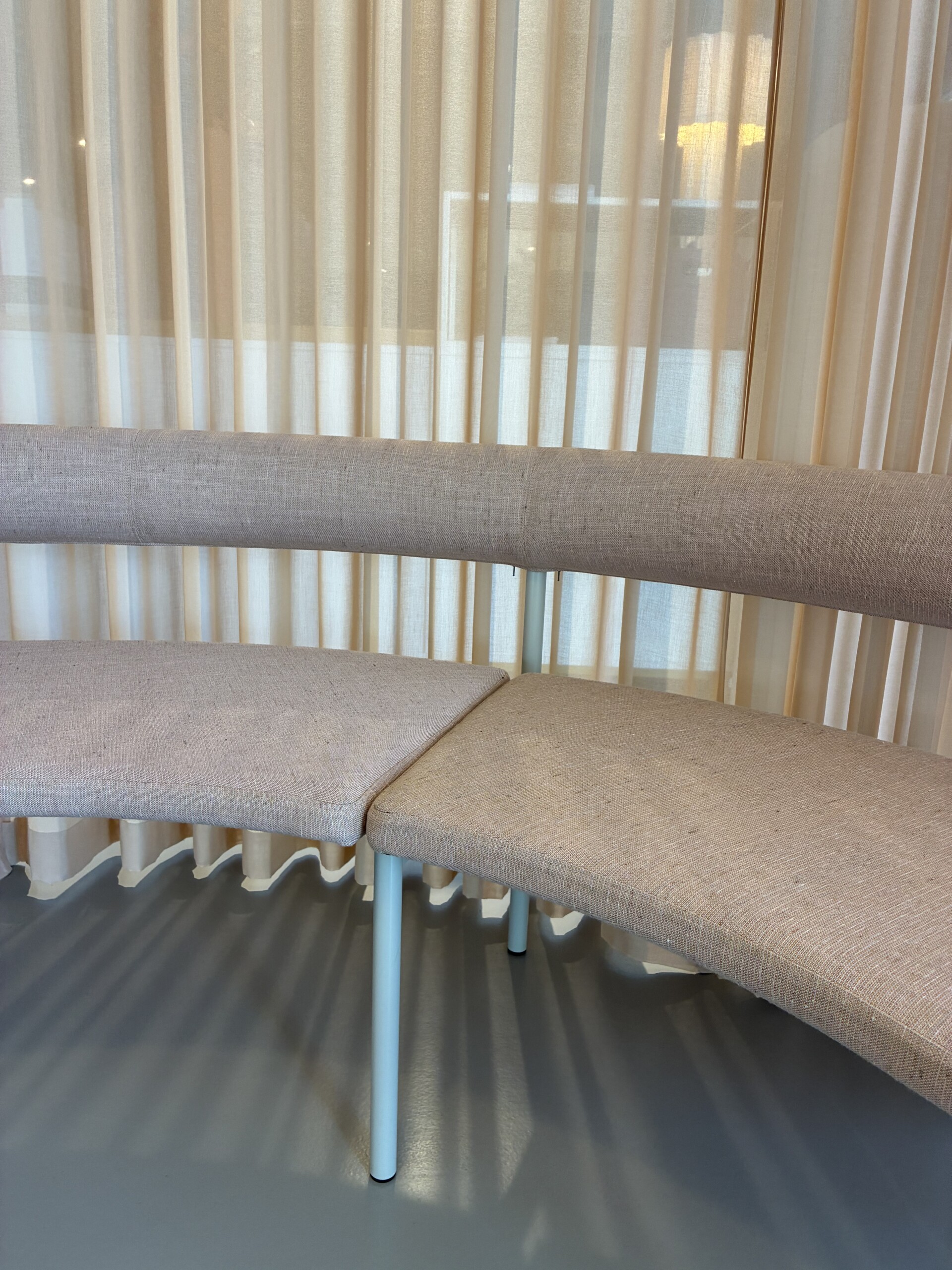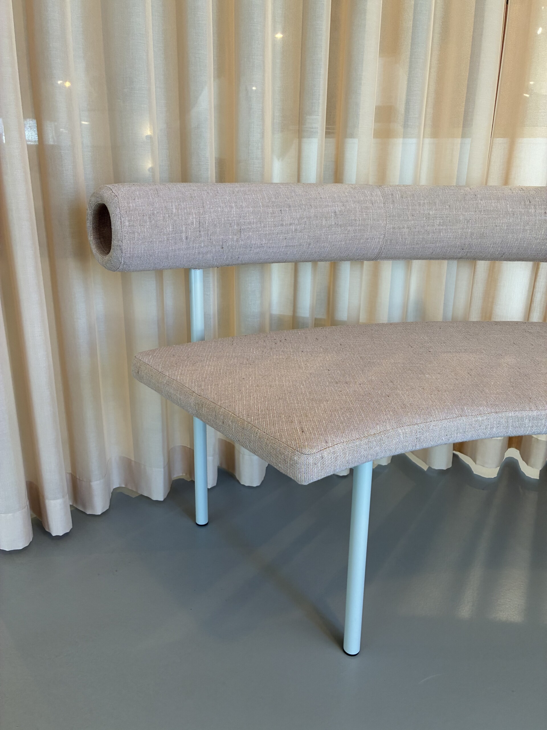 Seat and backrest in fabric (pink). Legs in metal (grey).