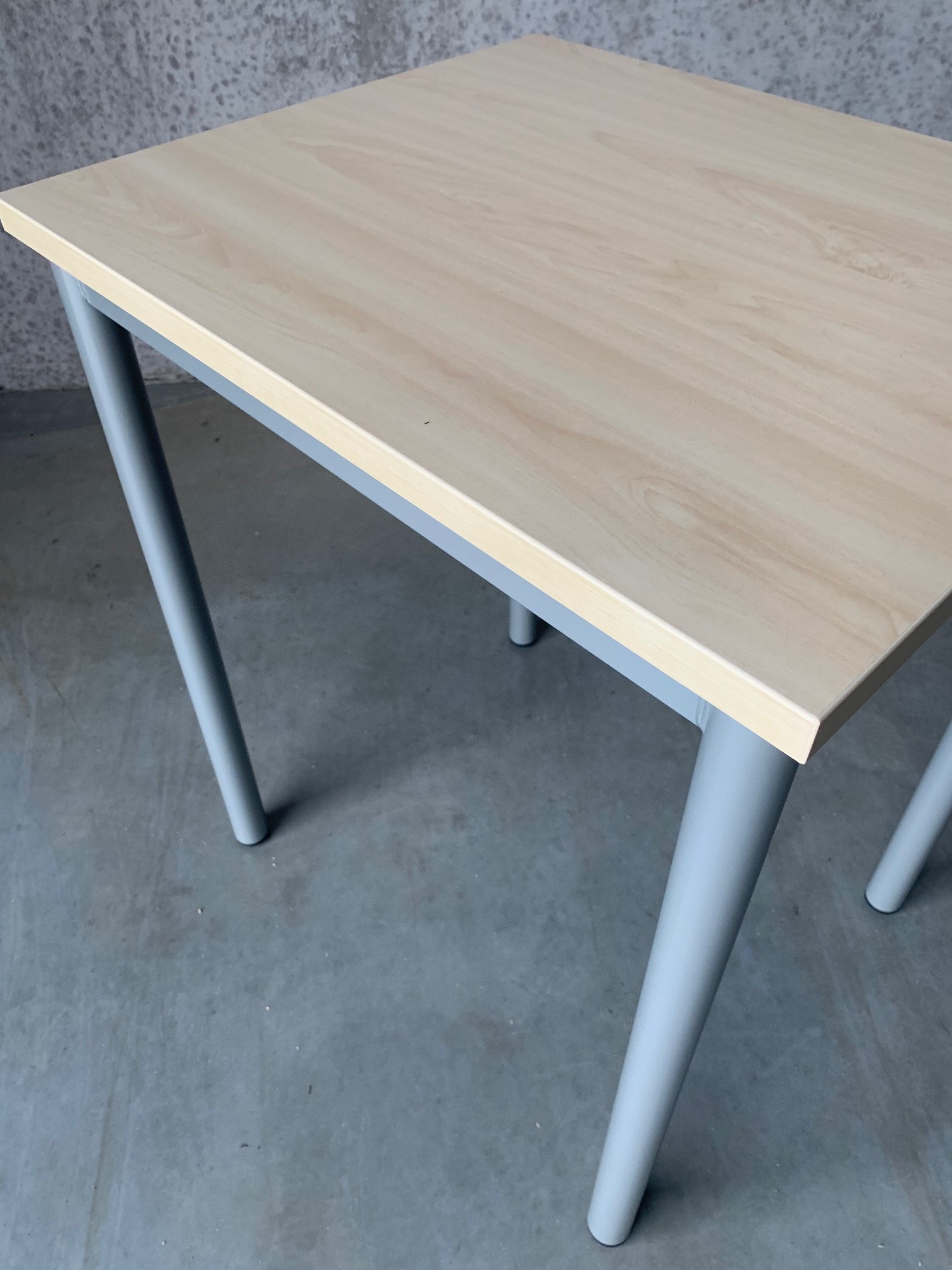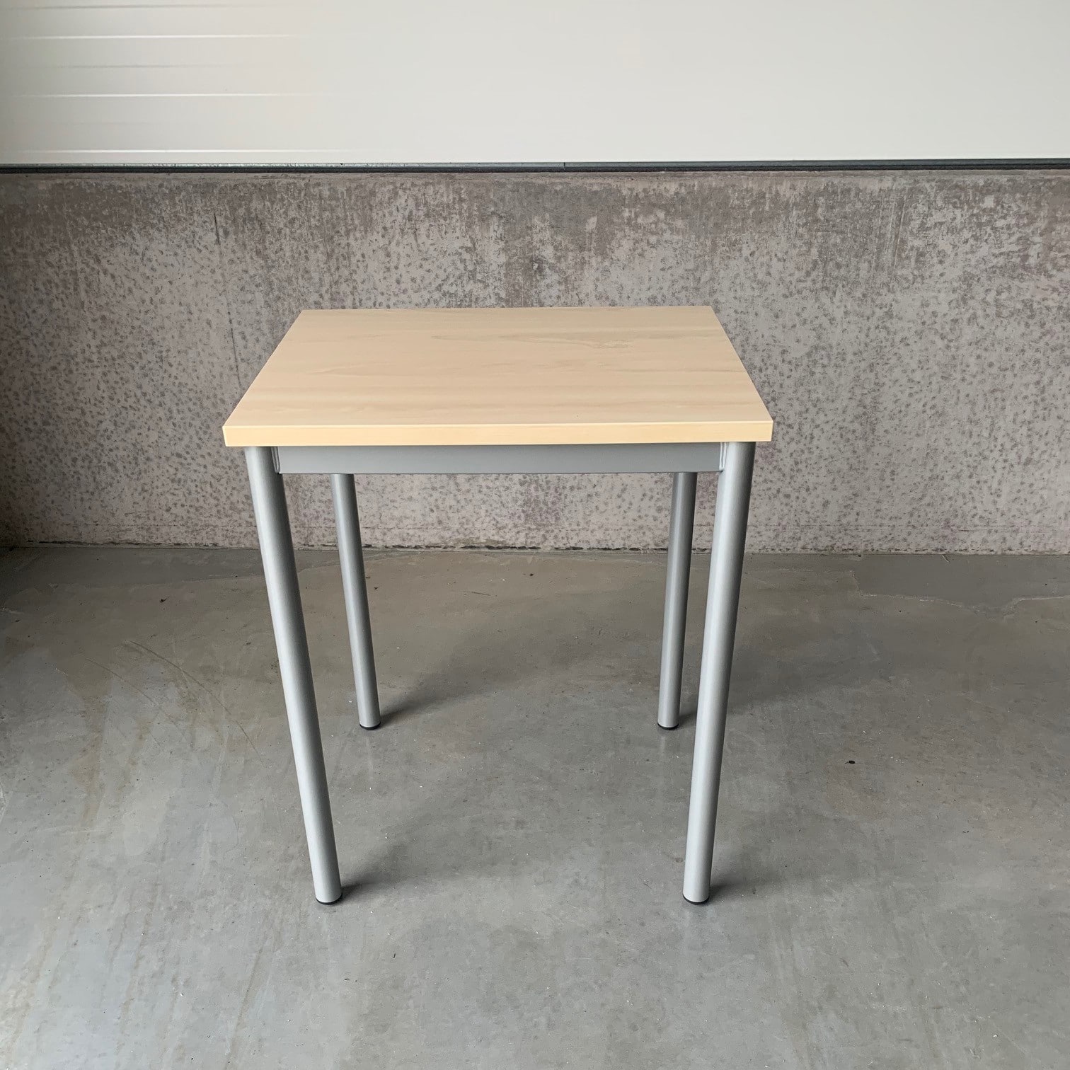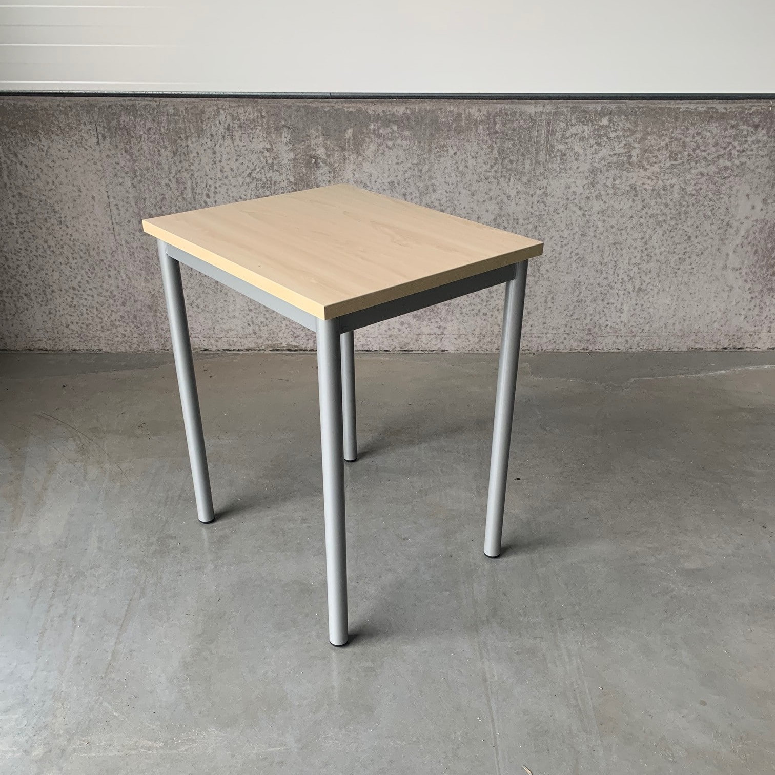 Table top in laminat (birch). Base in metal (silver).