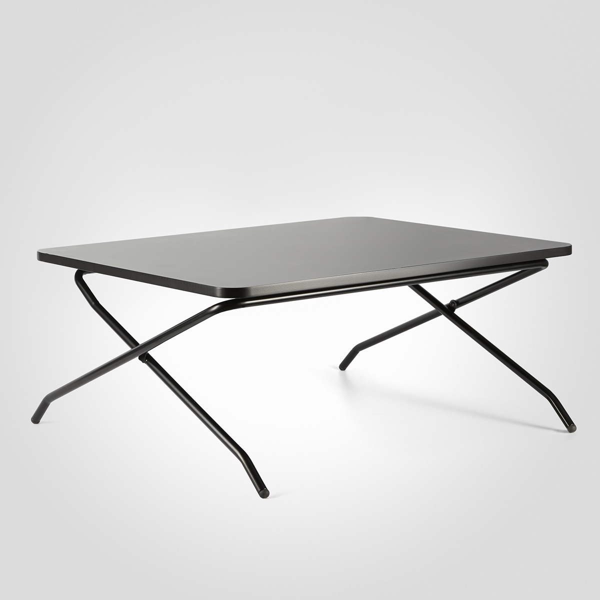 Table top in laminat (black). Base in metal (black). Adjustable height.
