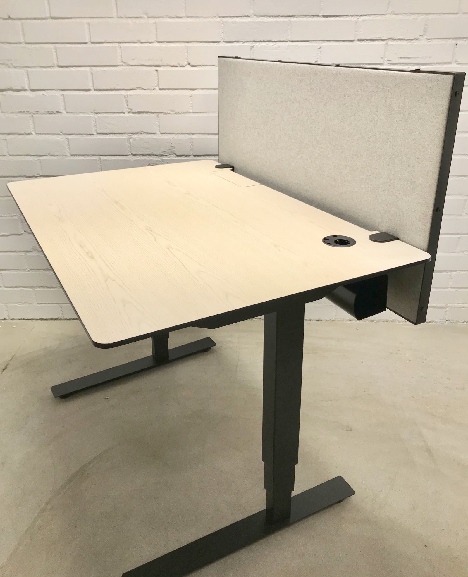 Table top in laminat (ash). Base in metal (black). Adjustable height.