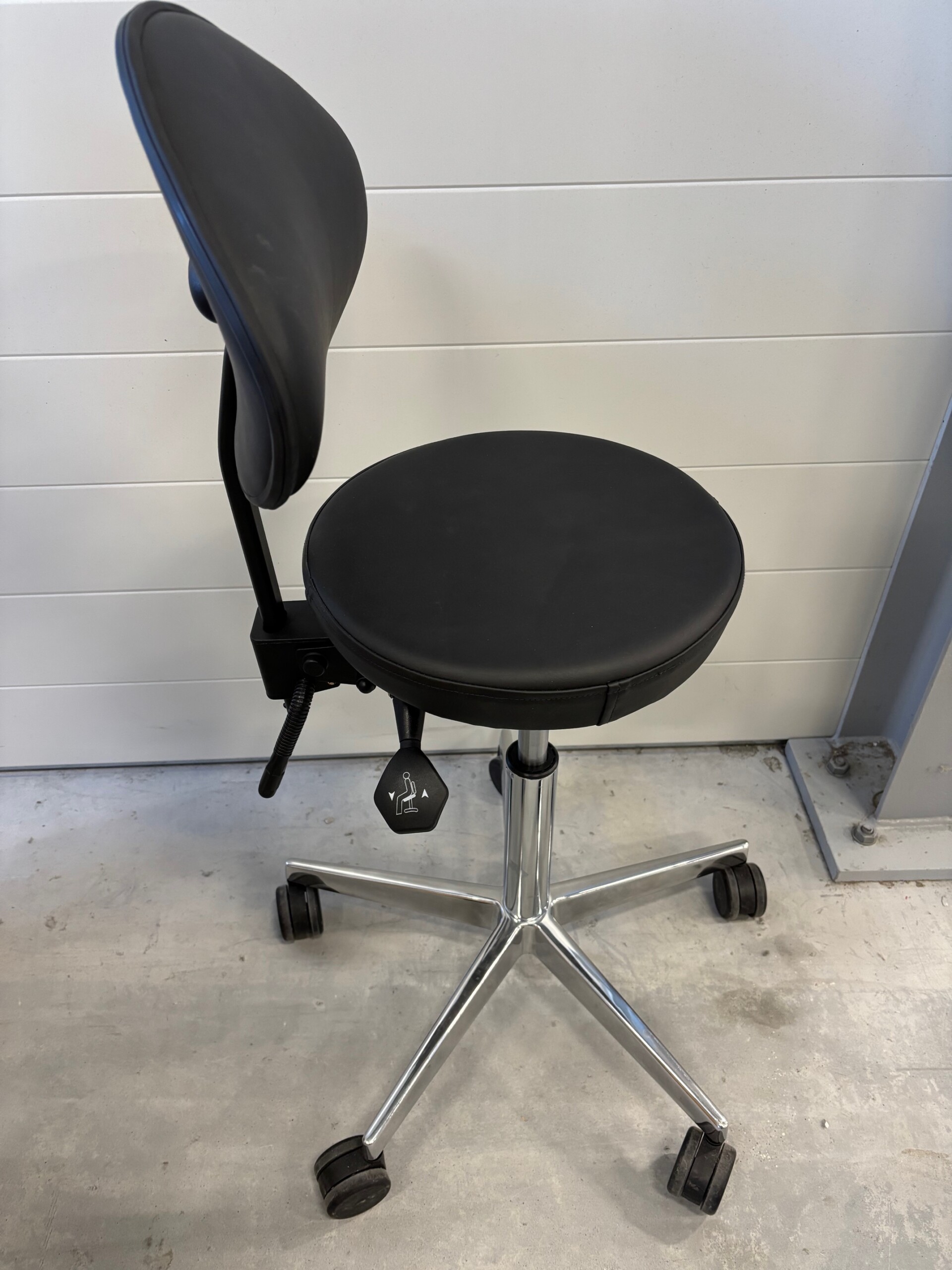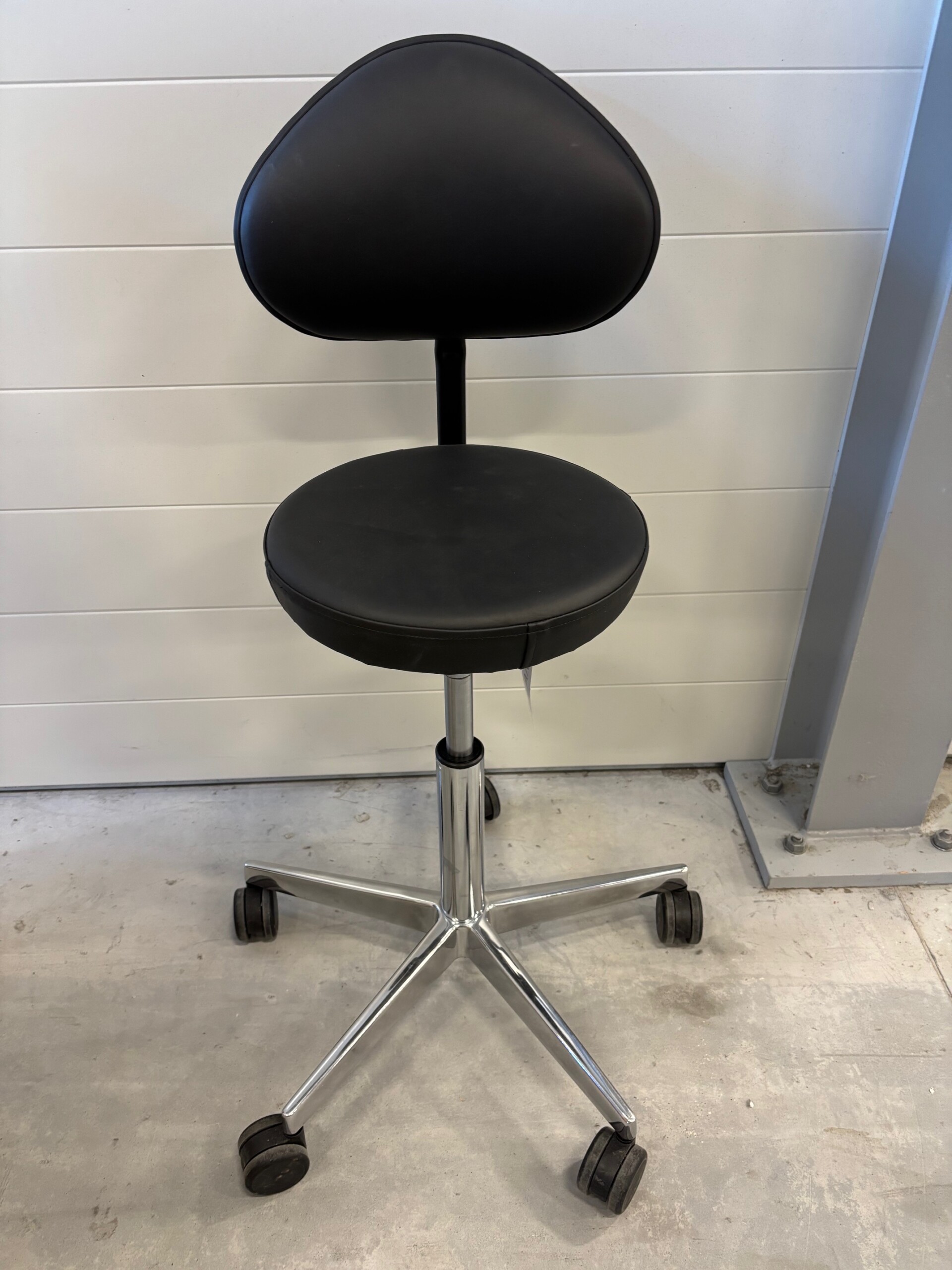 Seat and backrest in artificial leather (black). Star base in metal (aluminium). Adjustable height.