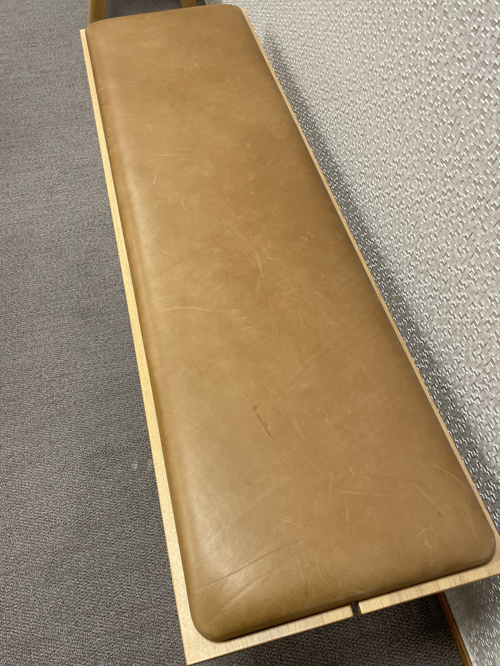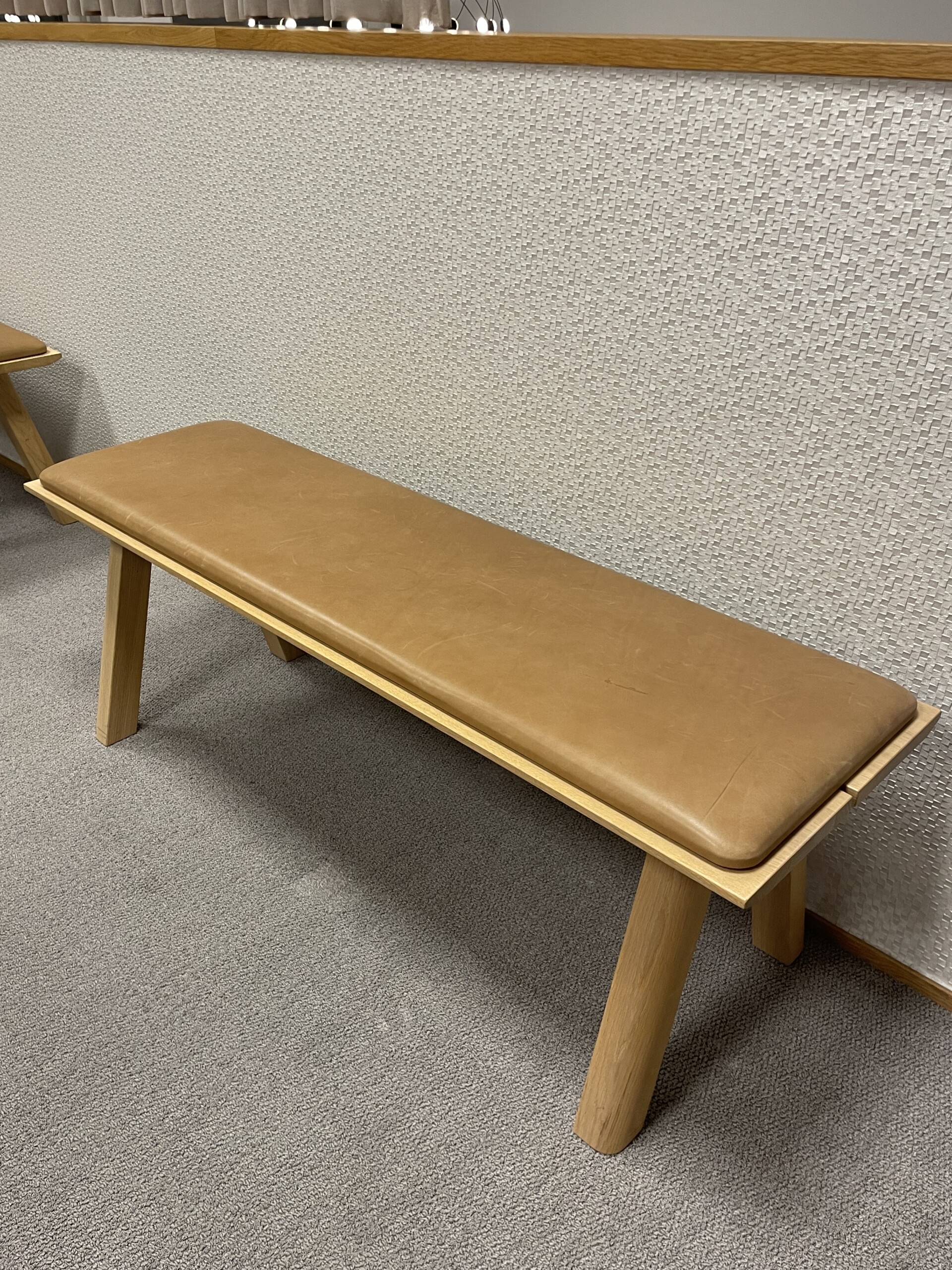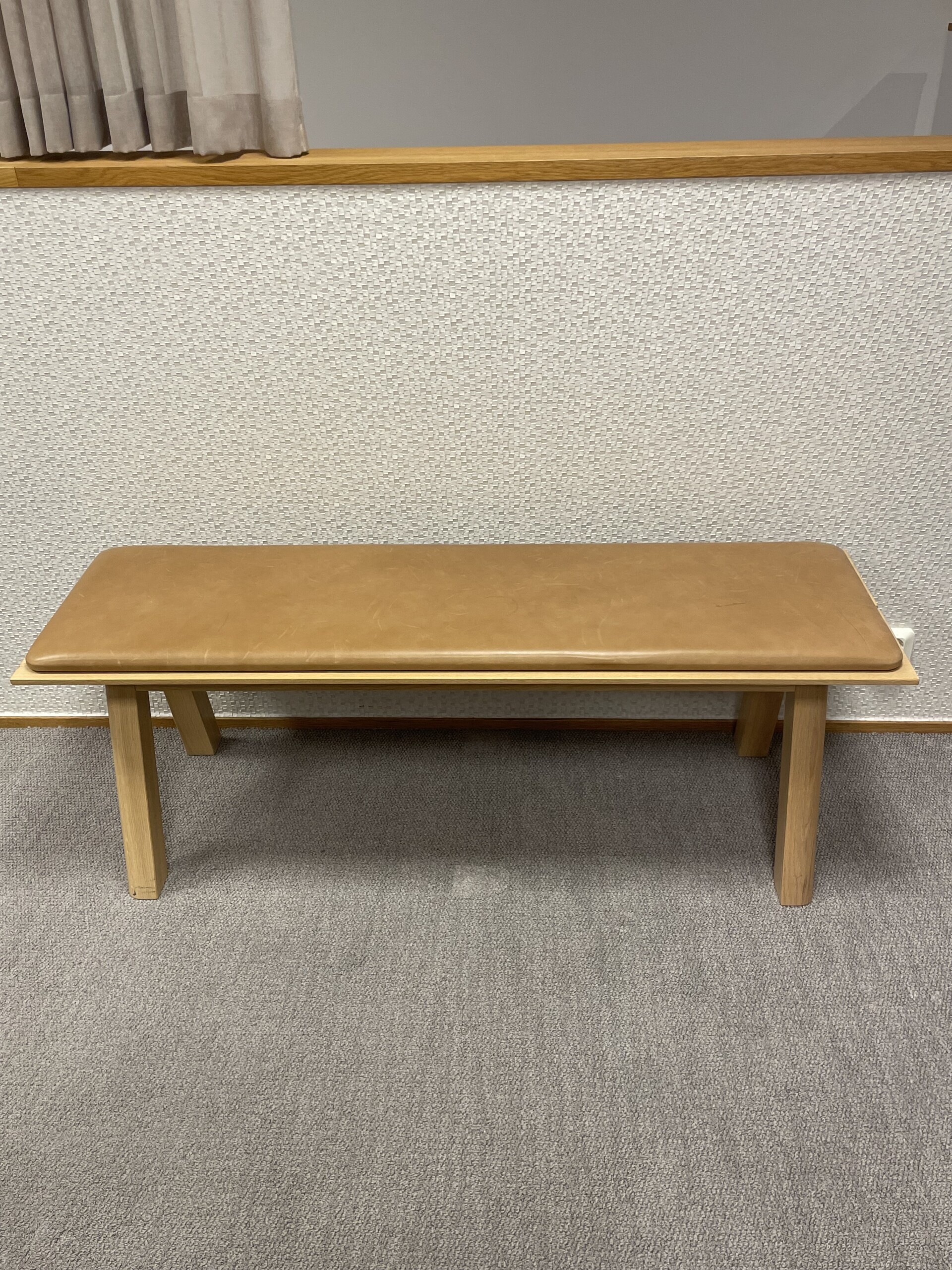 Seat in leather (brown). Legs in wood (oak).