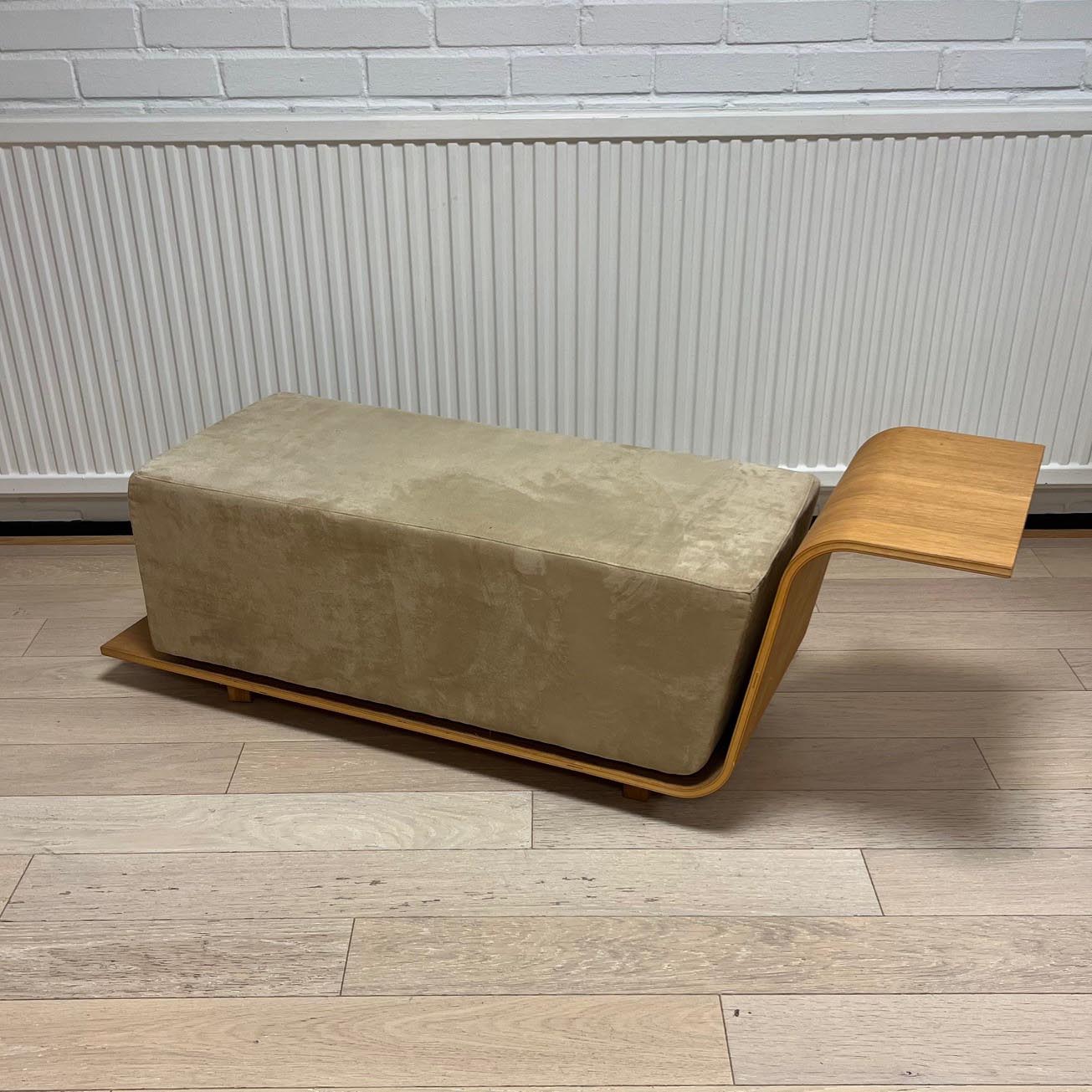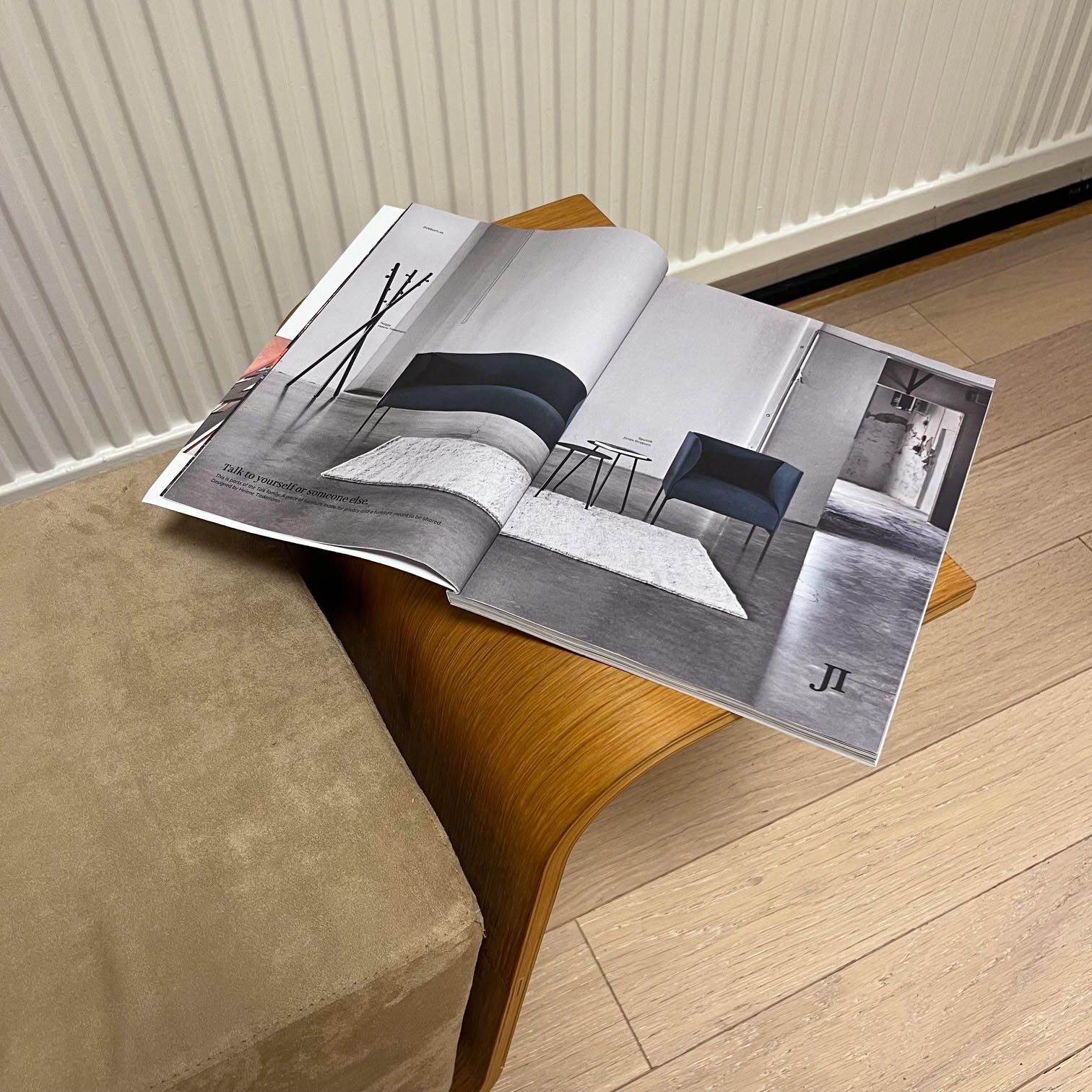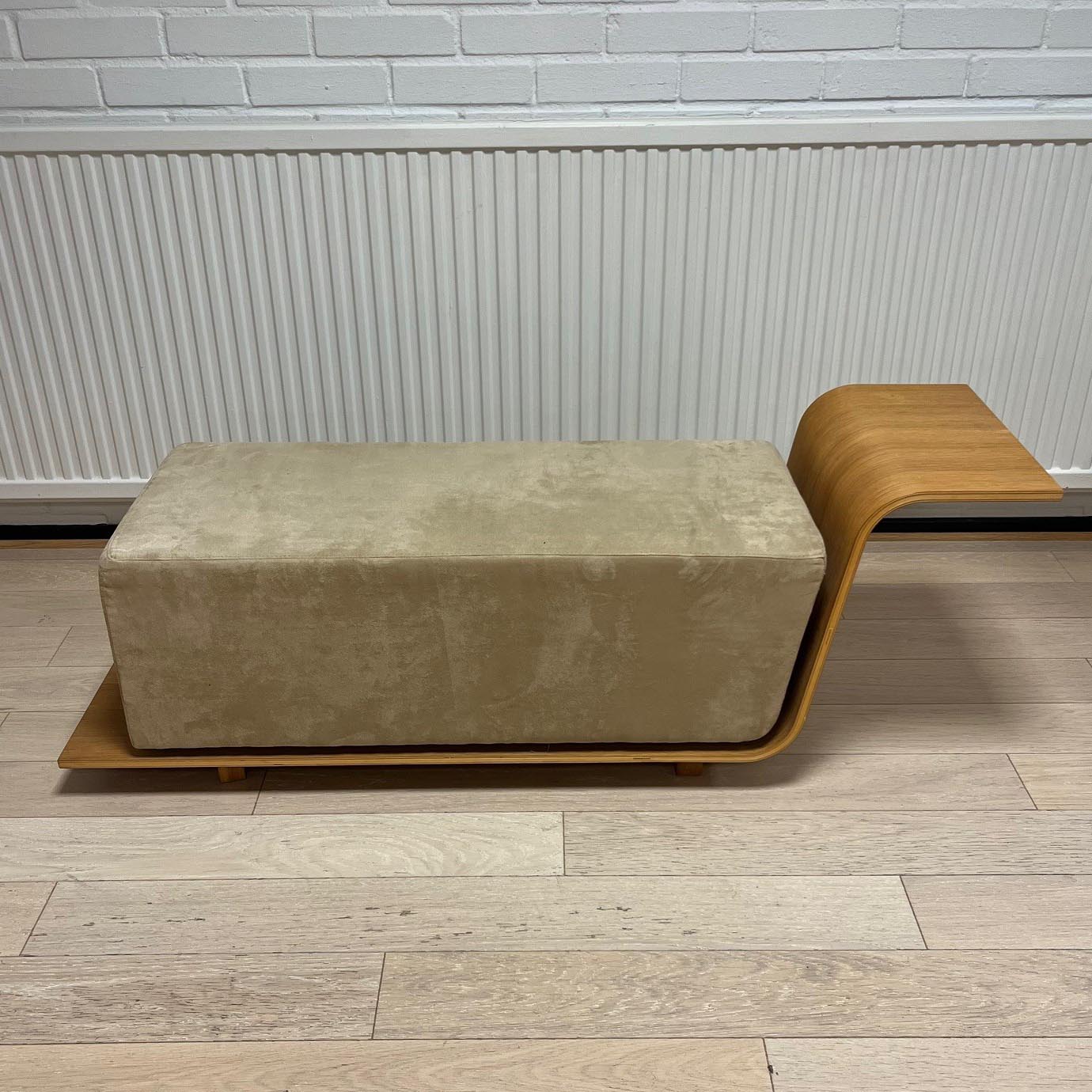 Seat in fabric (beige). Legs in wood (walnut).
