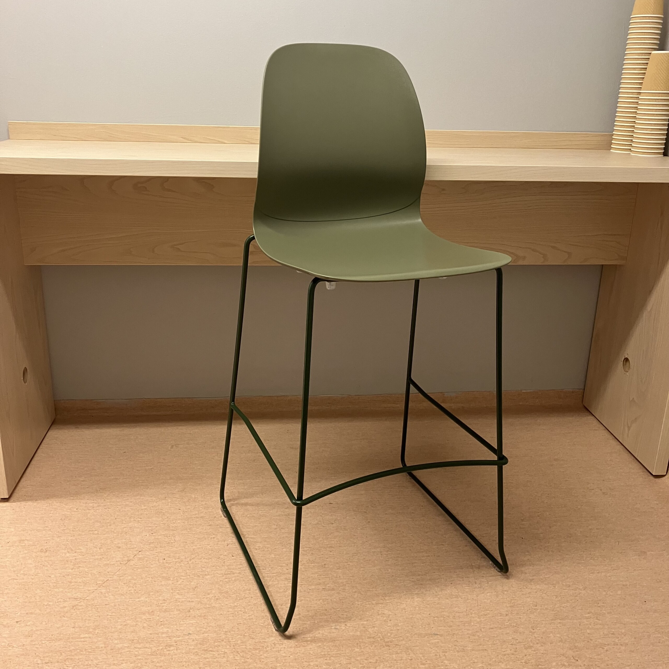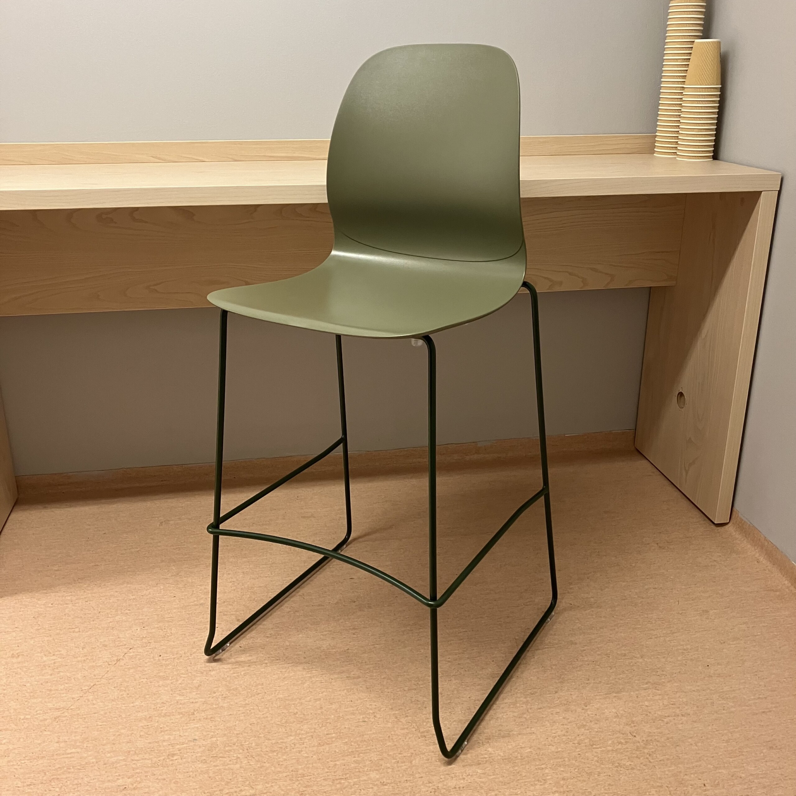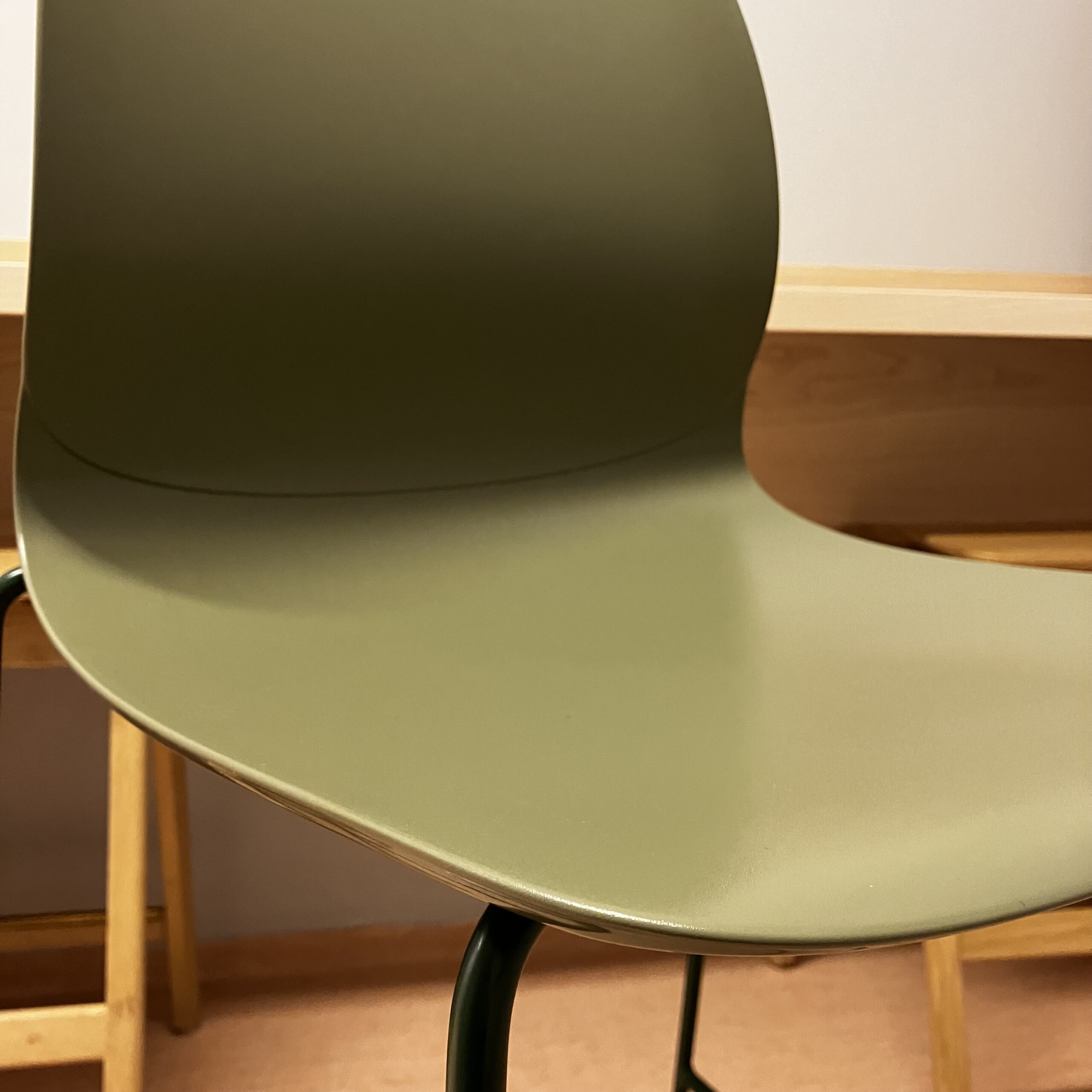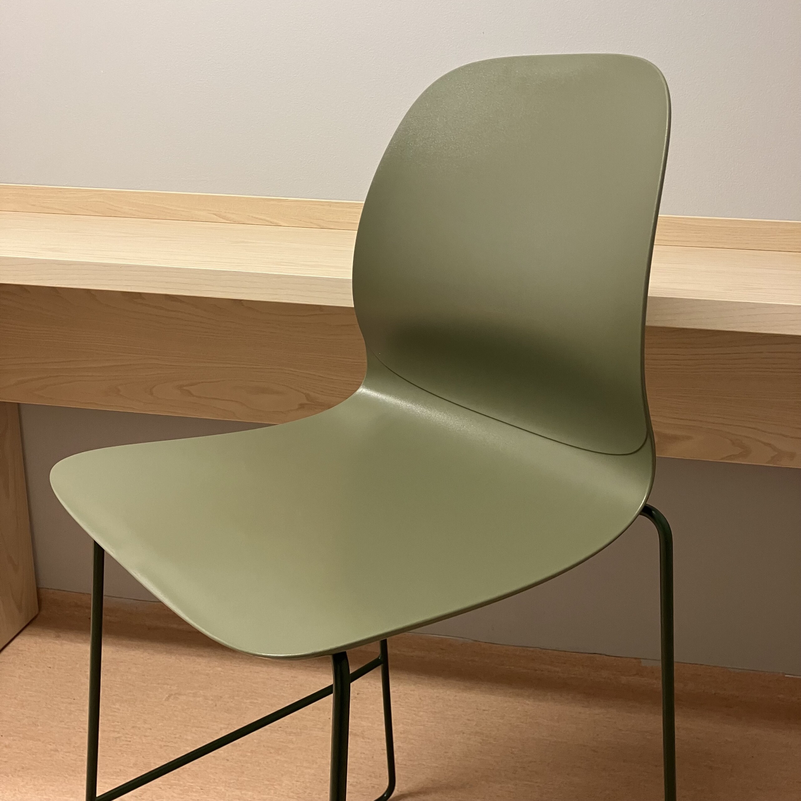 Seat and backrest in plastic (green). Sledgebase in metal (green).