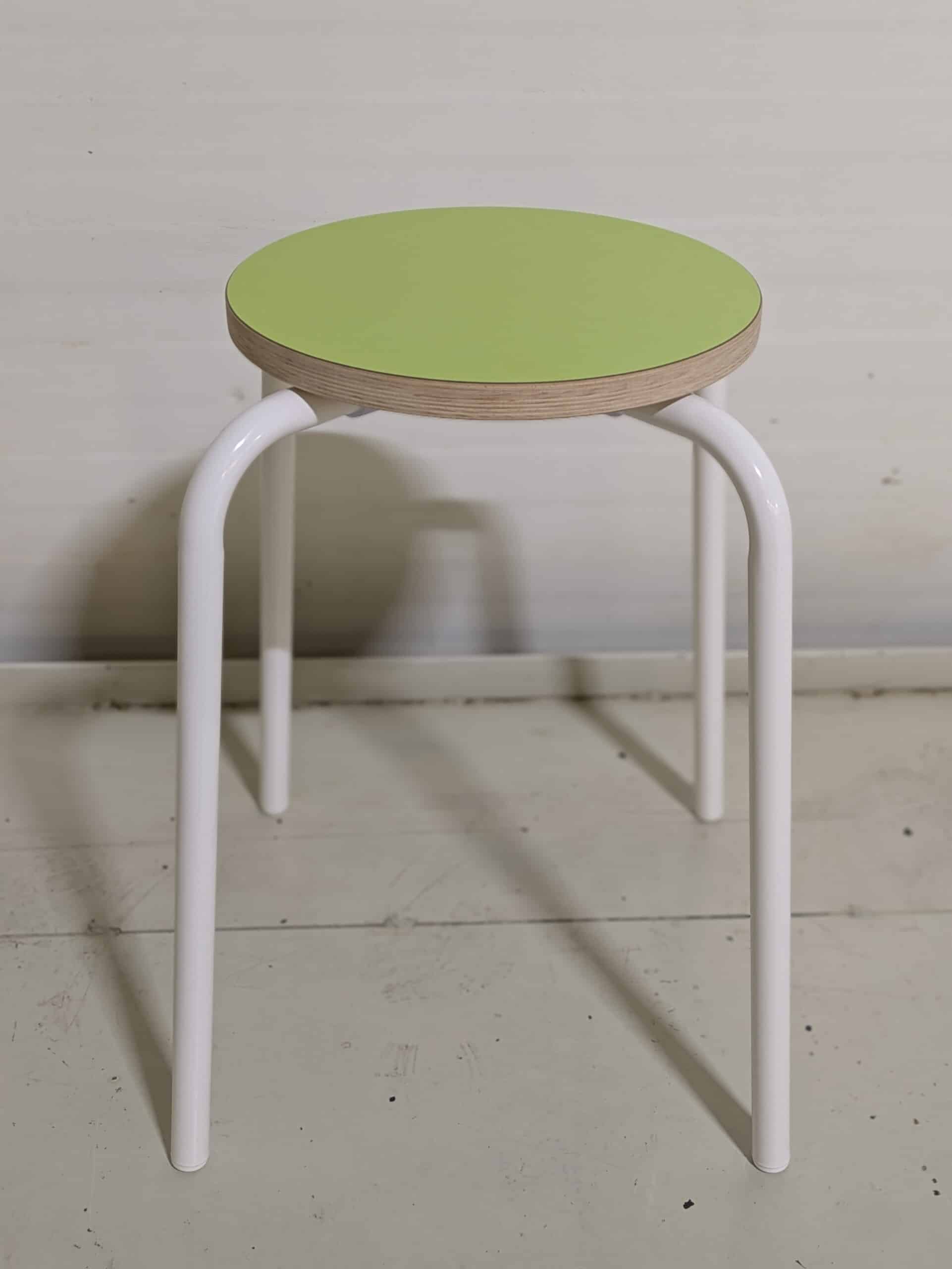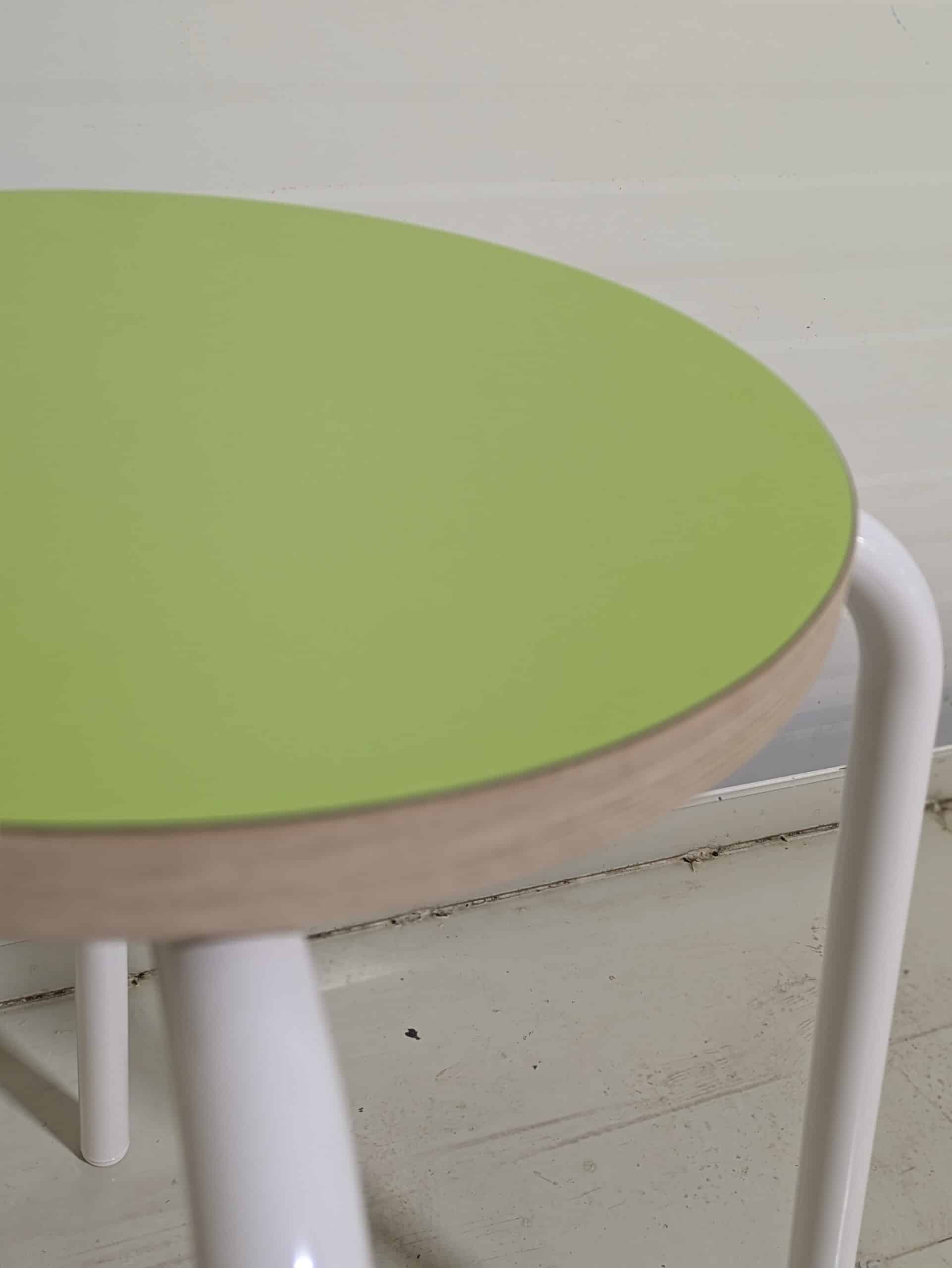 Seat in laminat (green). Legs in metal (white).