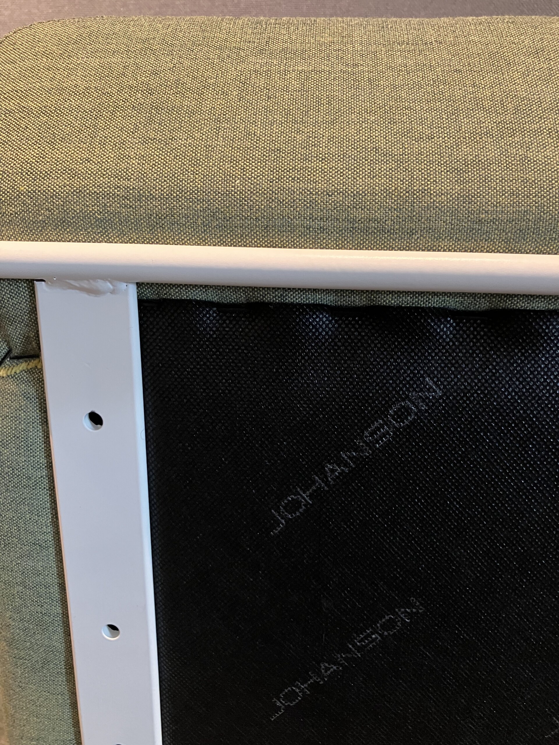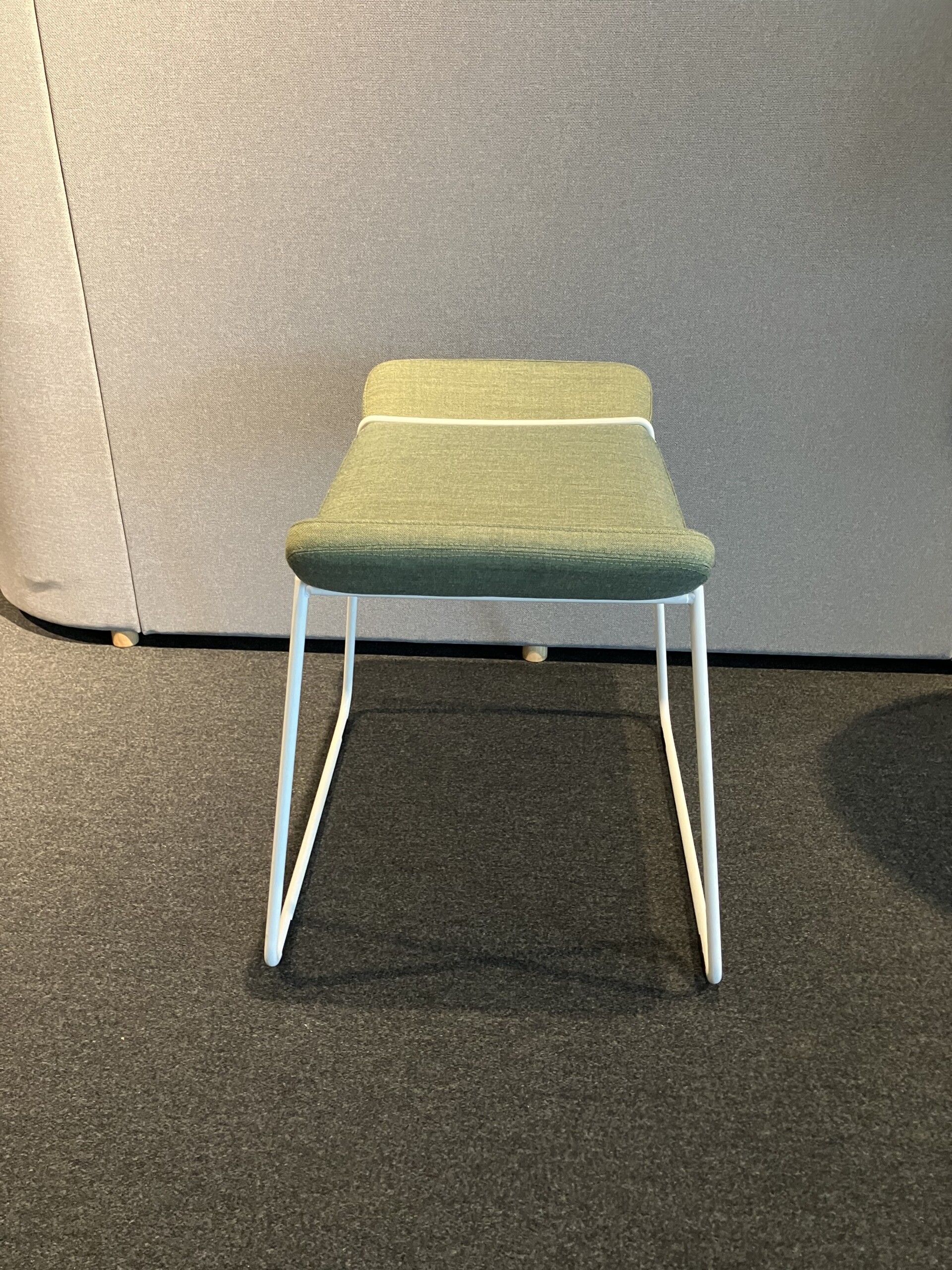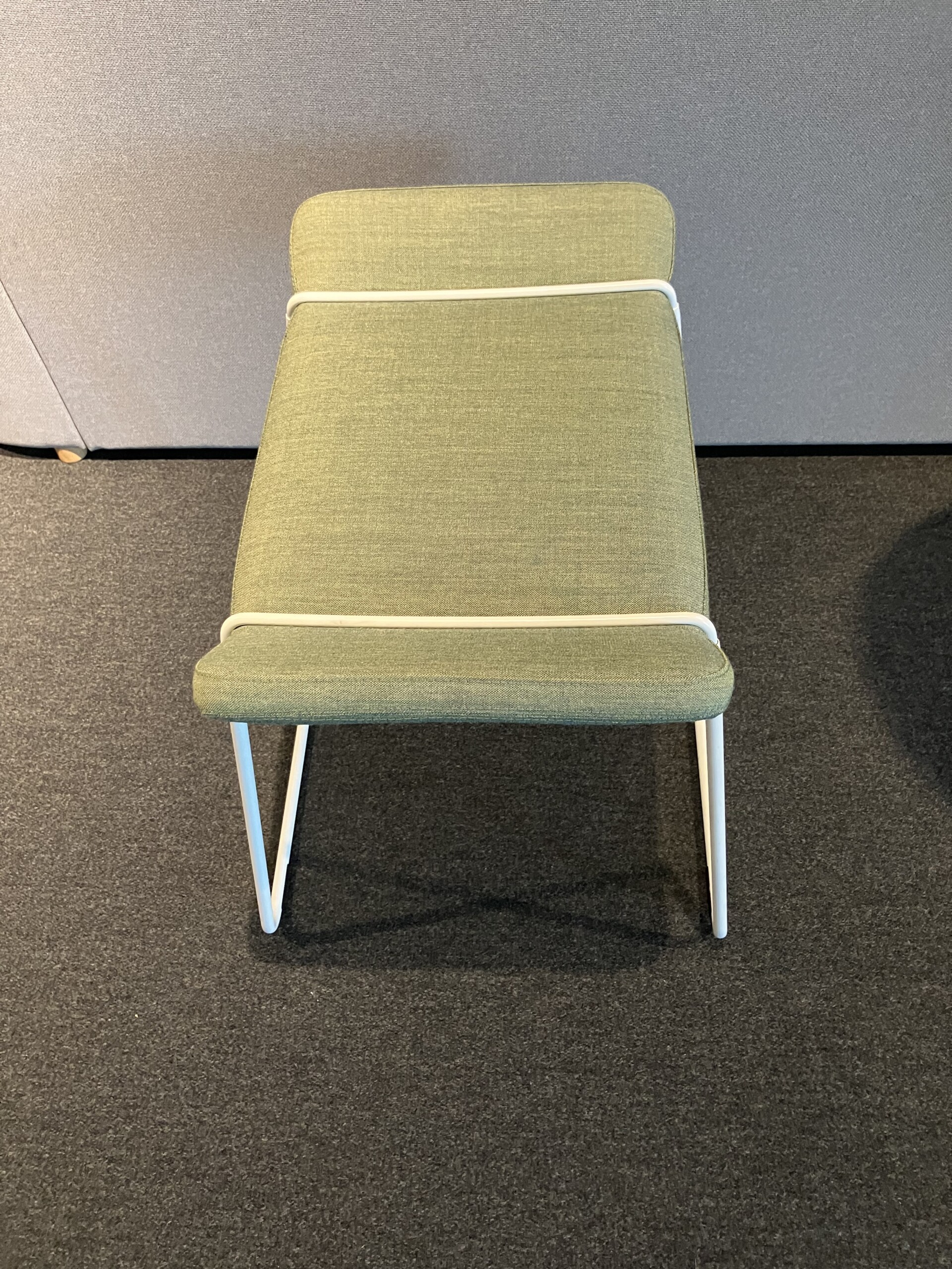 Seat in fabric (green). Sledgebase in metal (white).