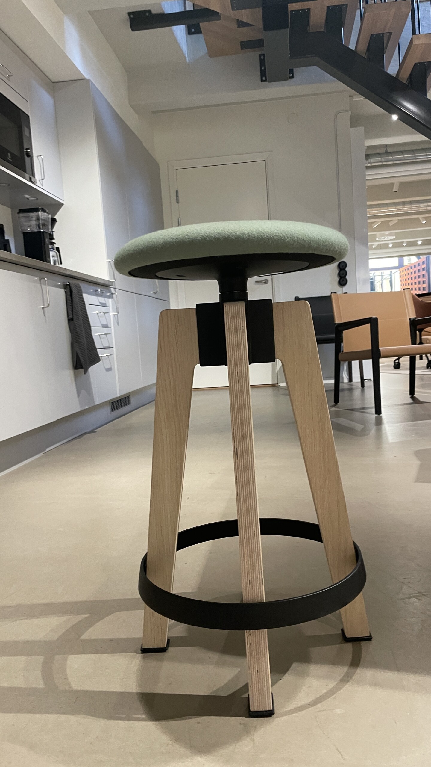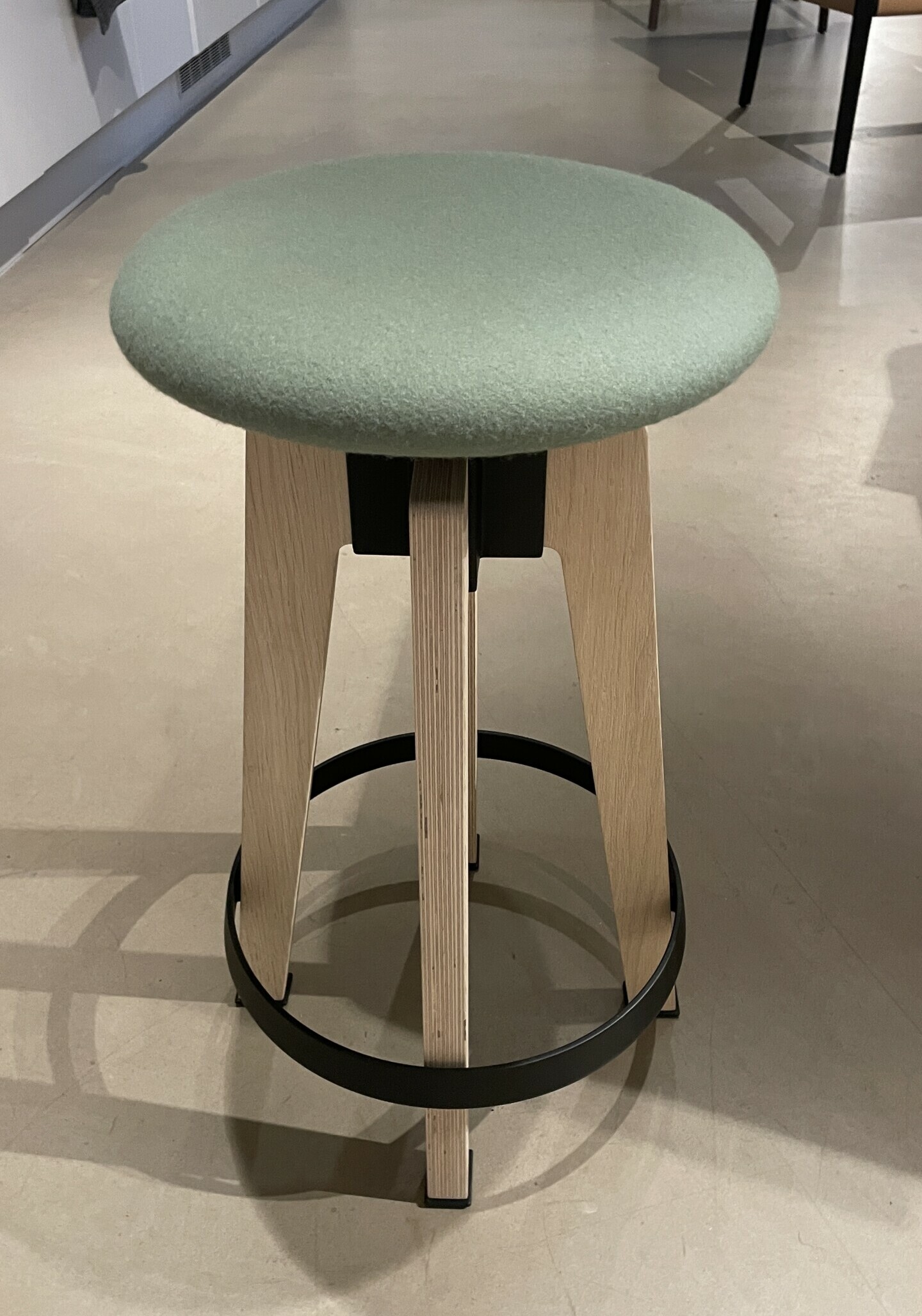 Seat in fabric (green). Legs in wood (oak).