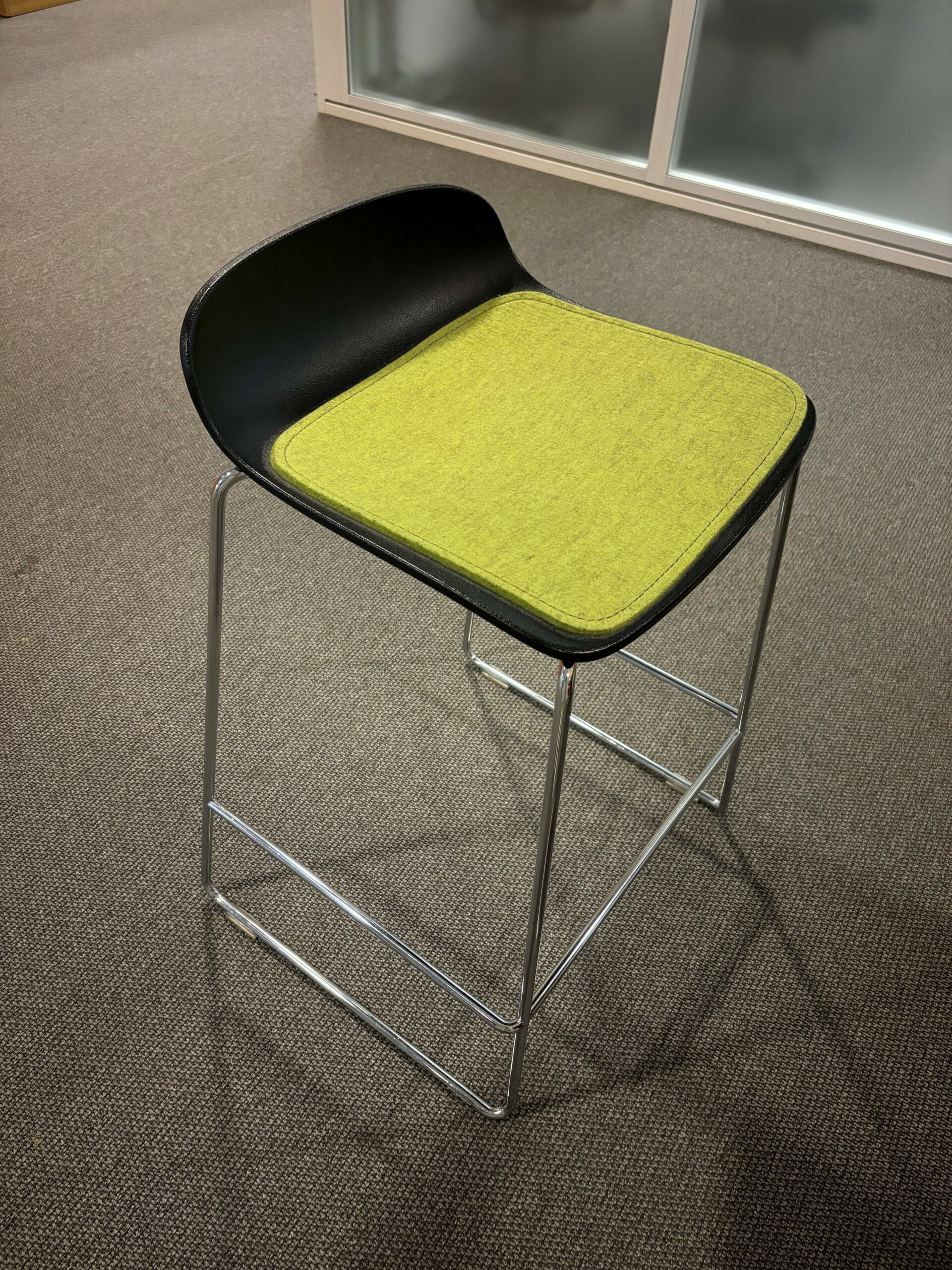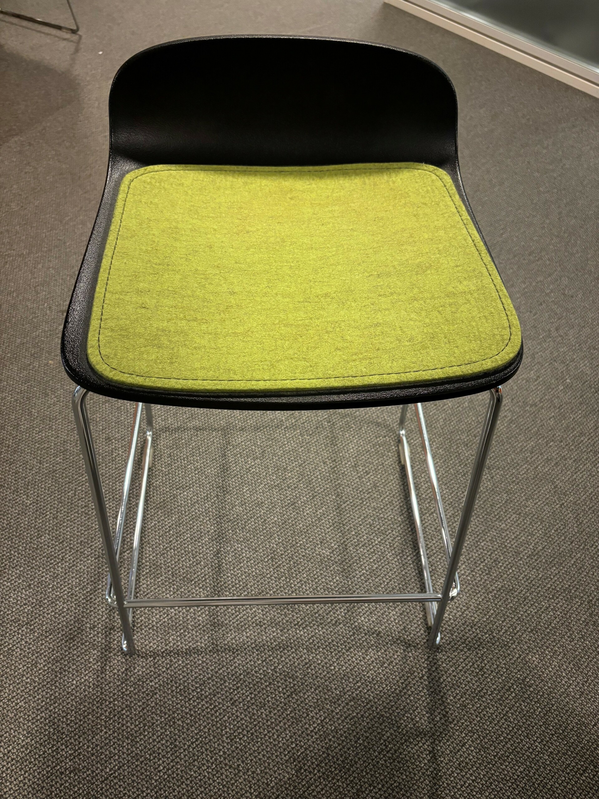 Seat in fabric (green). Backrest in wood (black). Sledgebase in metal (chrome).