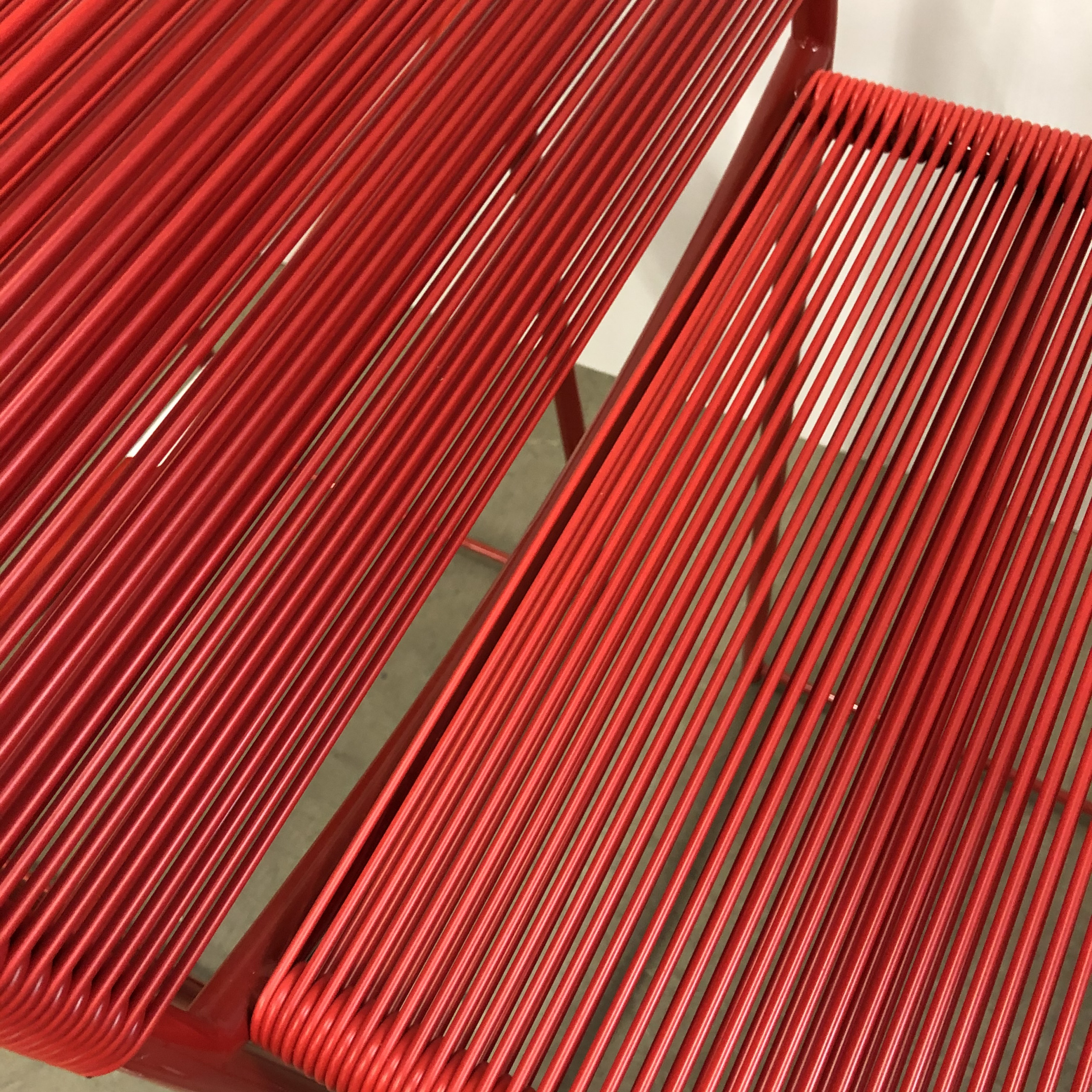 Seat and backrest in plastic (red). Sledgebase in metal (red).