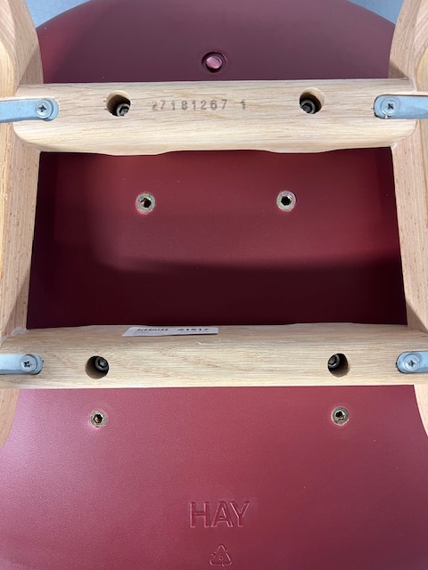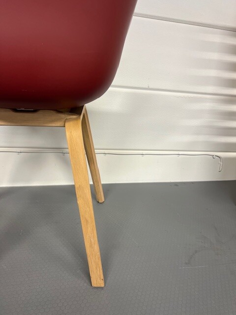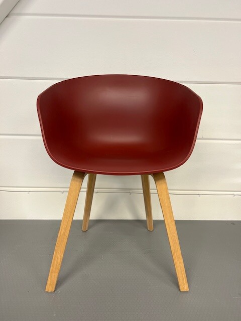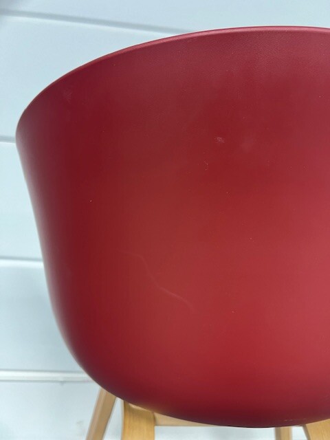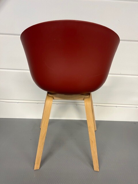 Seat and backrest in plastic (red). Legs in wood (oak).