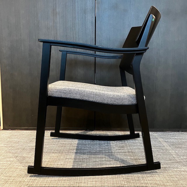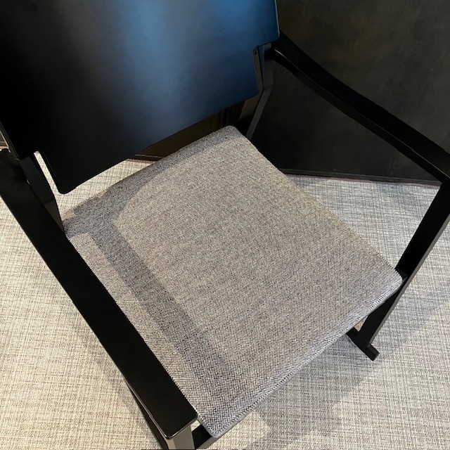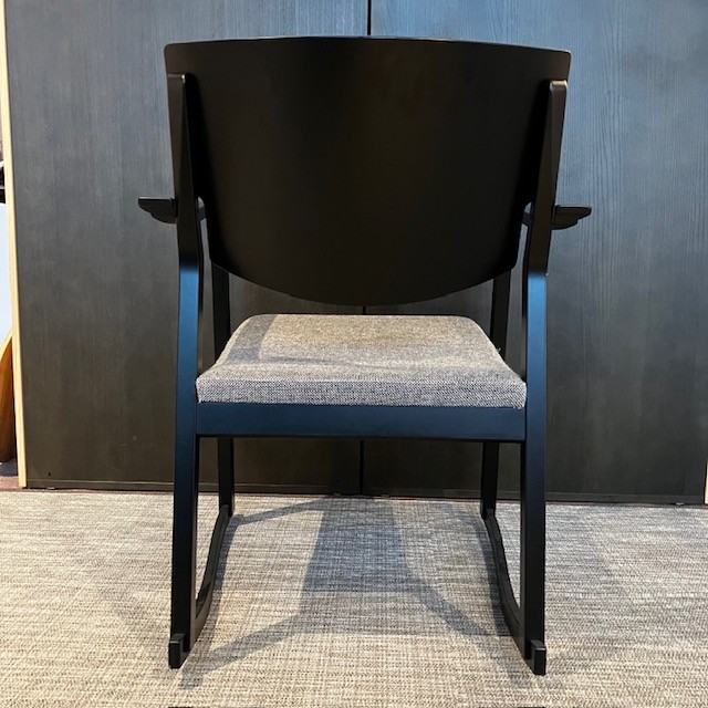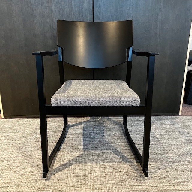 Seat in fabric (grey). Backrest in wood (black). Sledgebase in wood (black).
