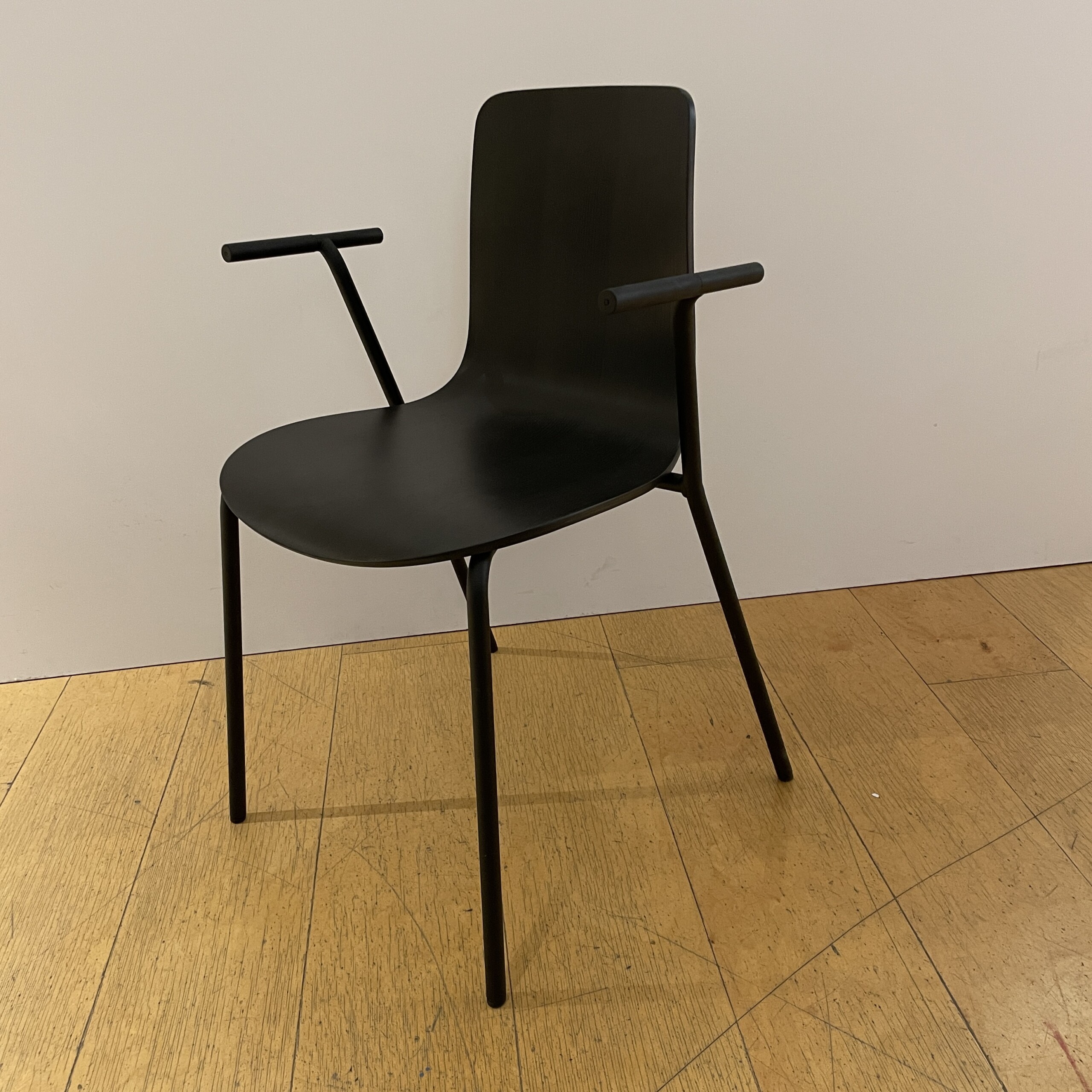 Seat and backrest in wood (black). Legs in metal (black).