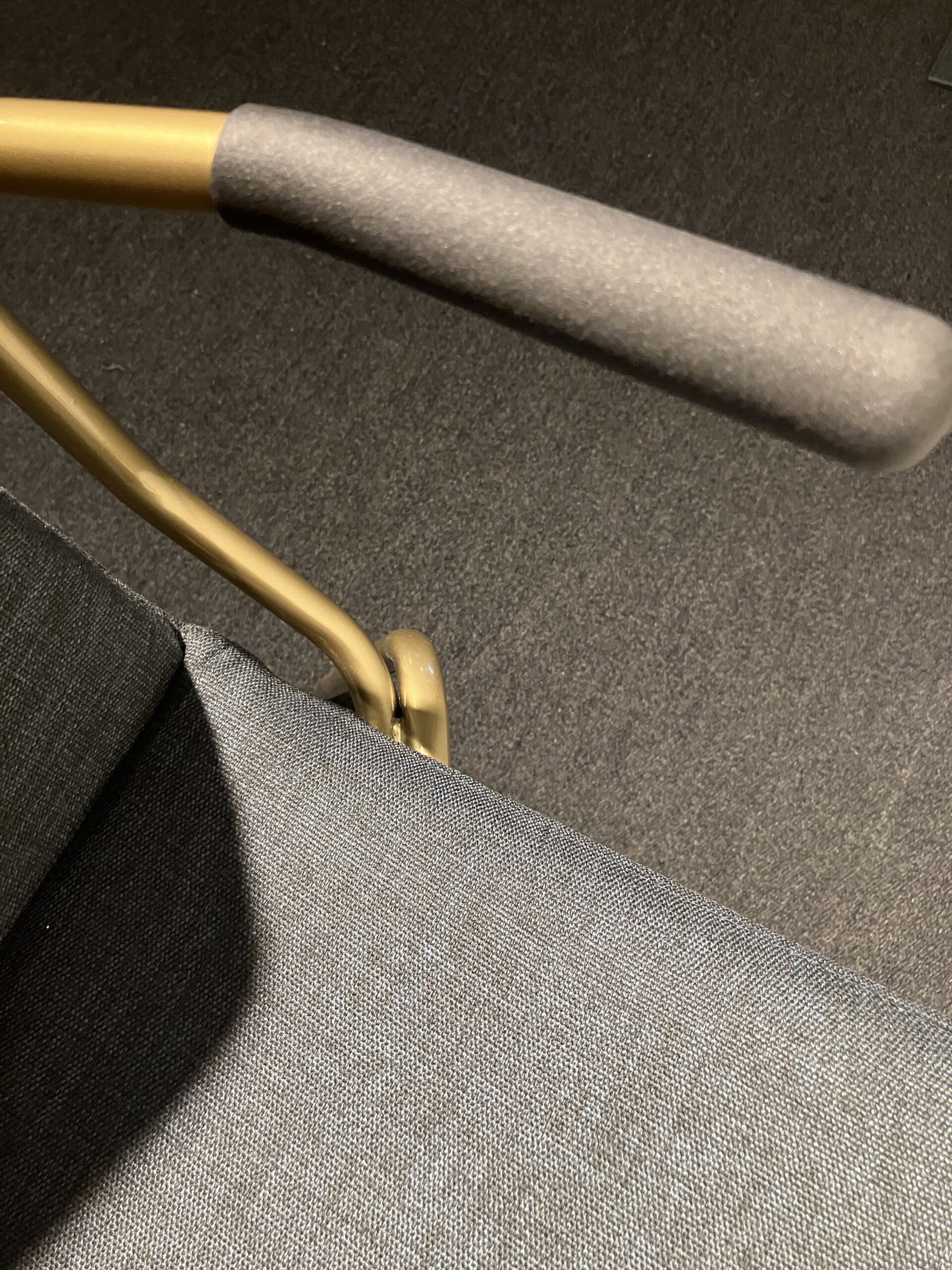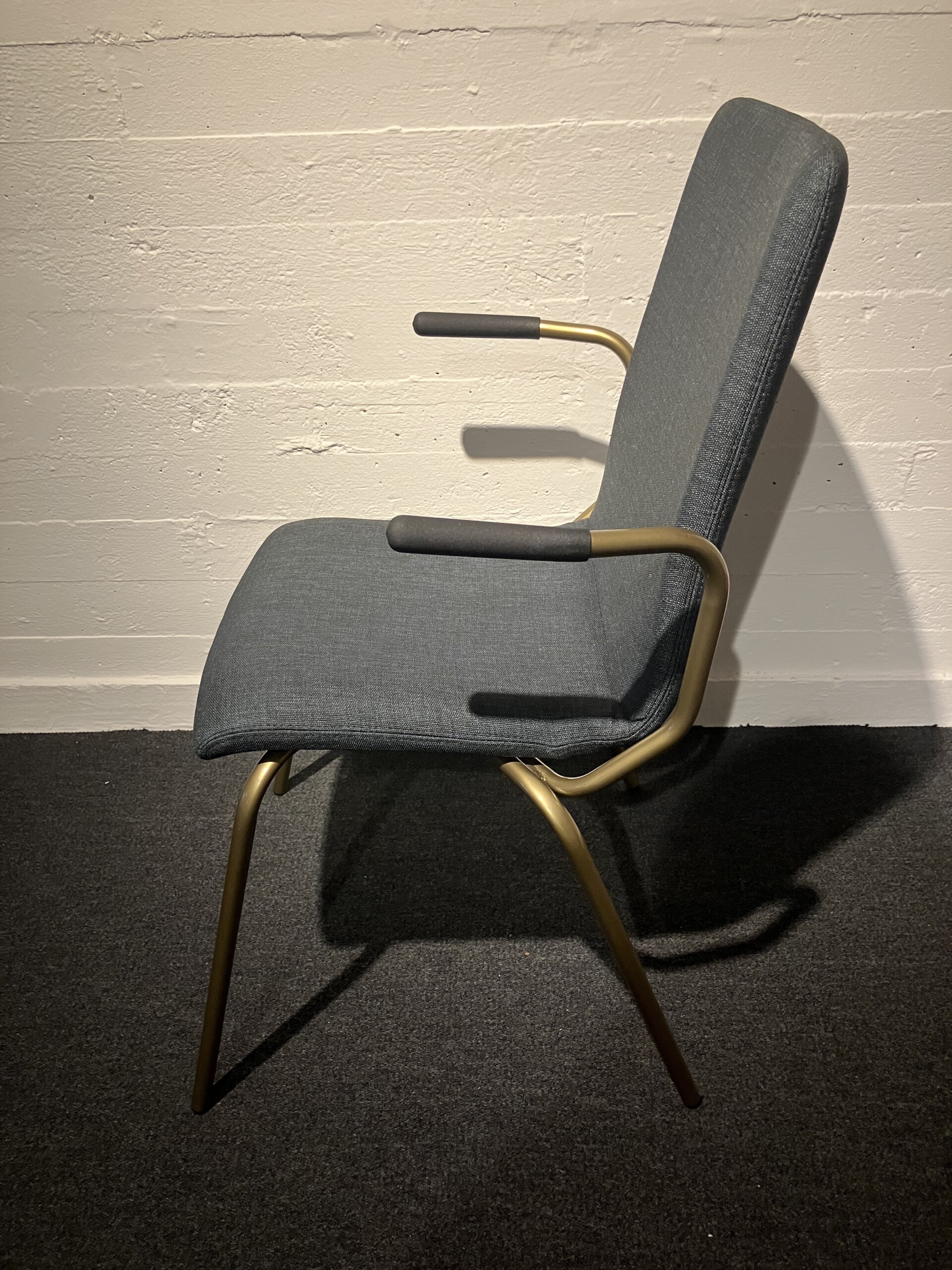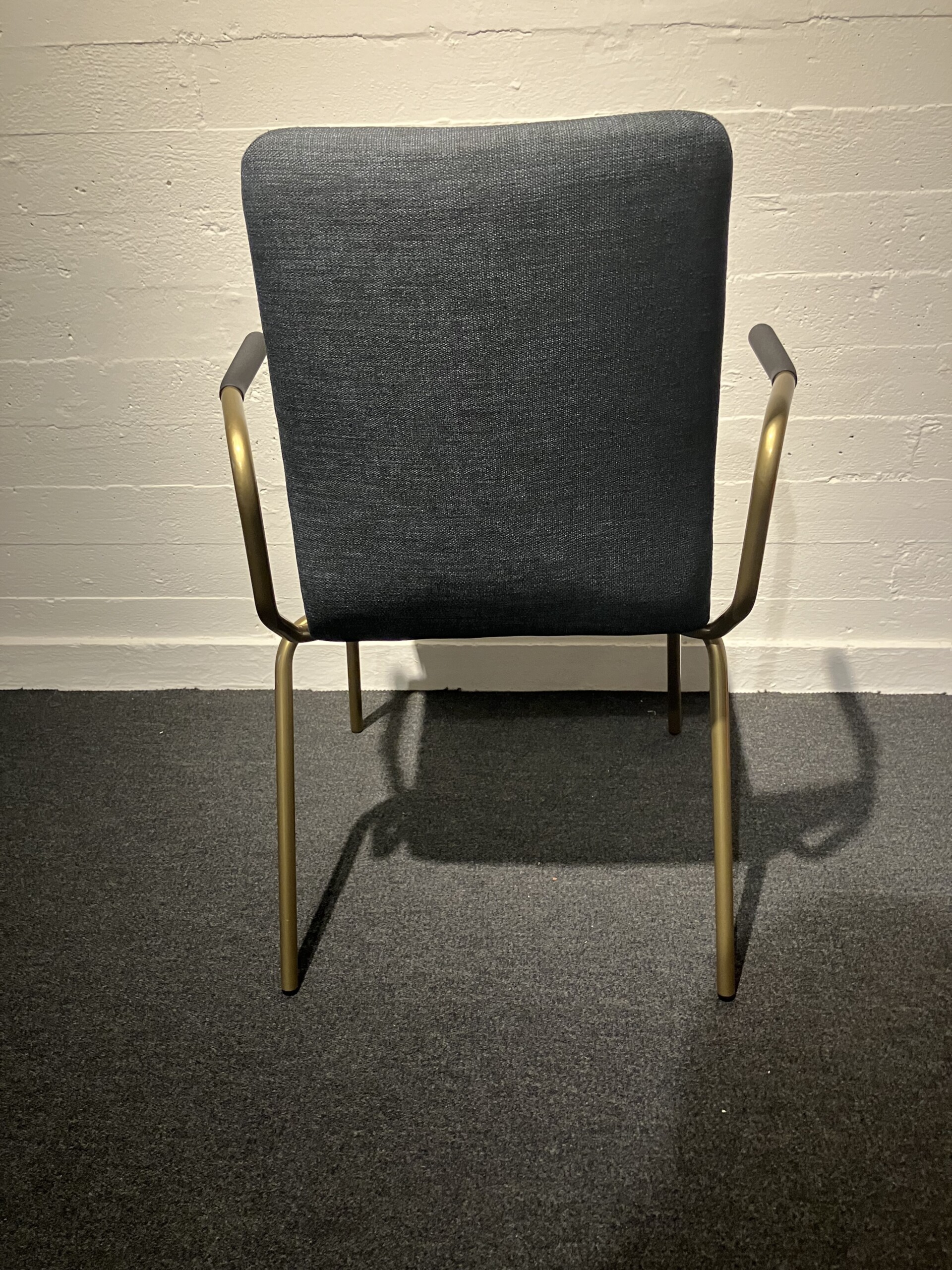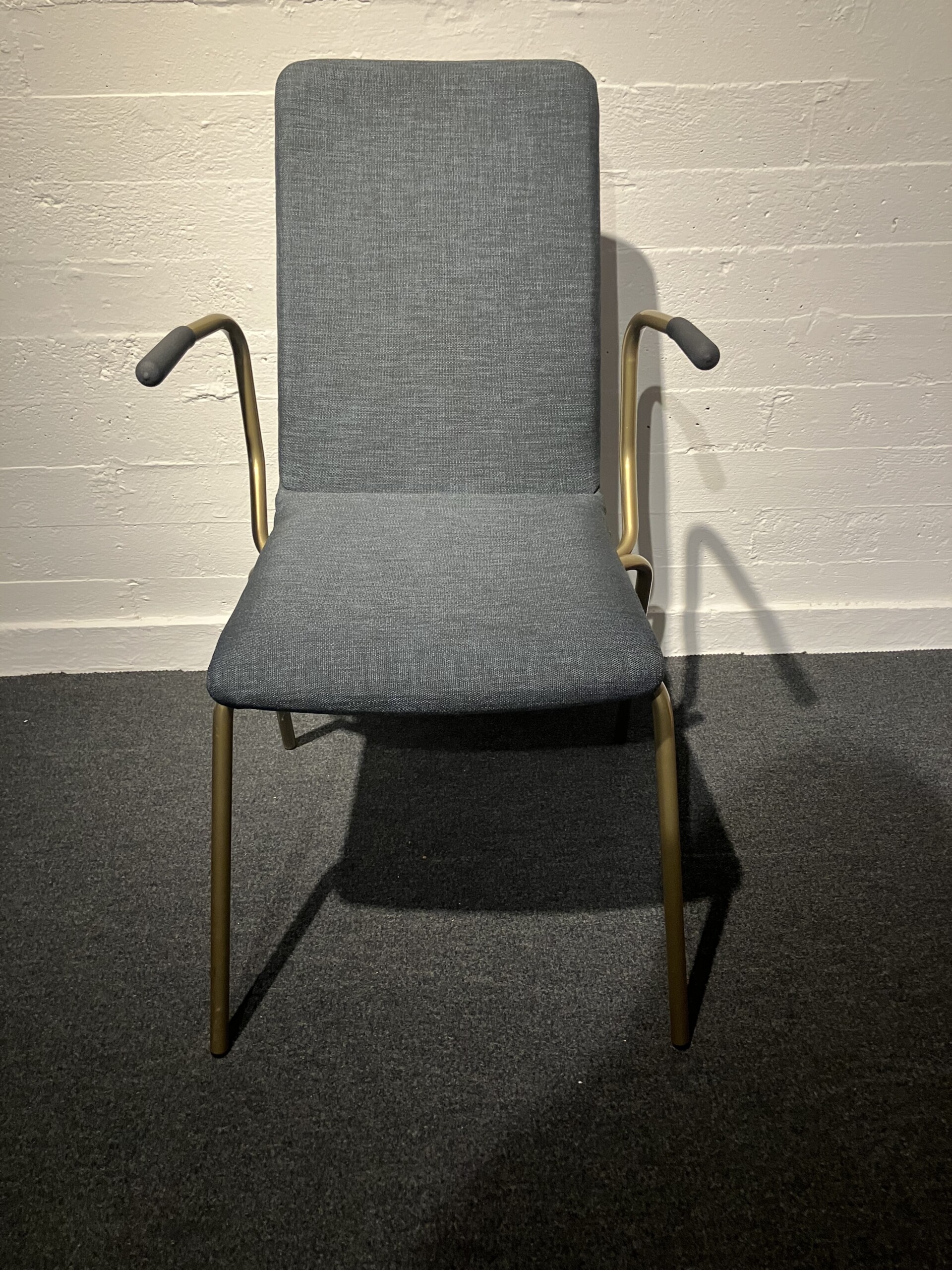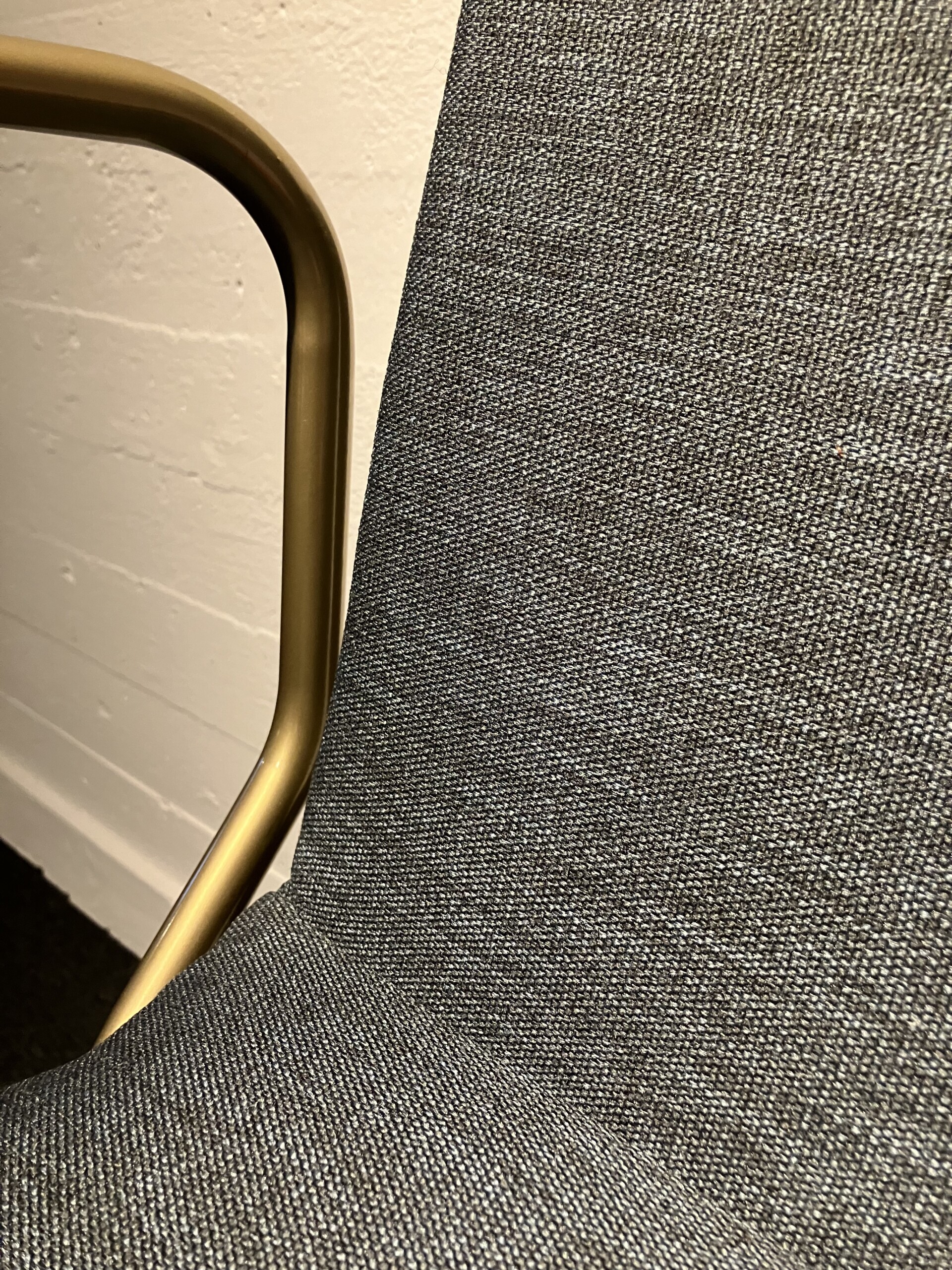 Seat and backrest in fabric (grey). Legs in metal (mässing).