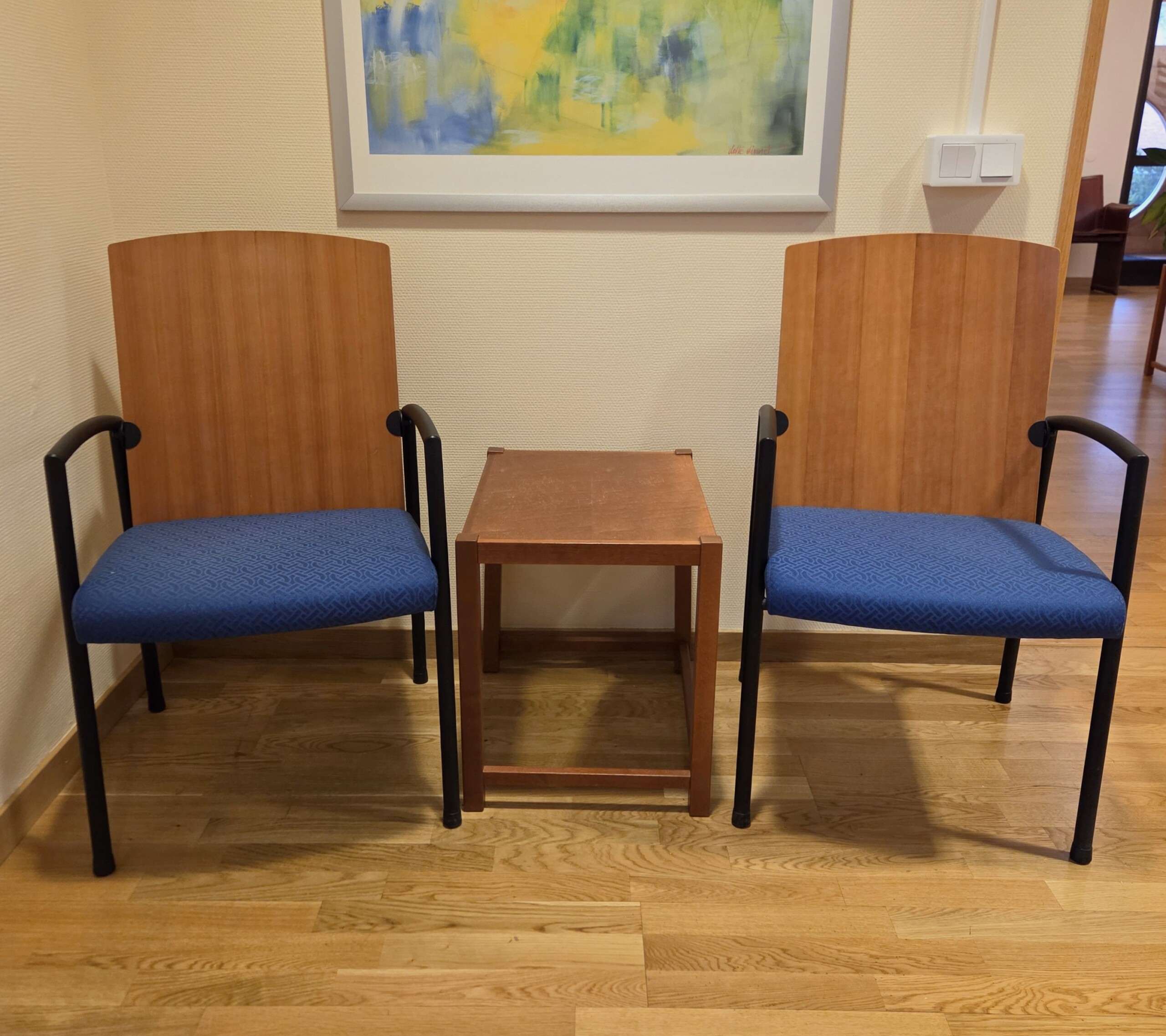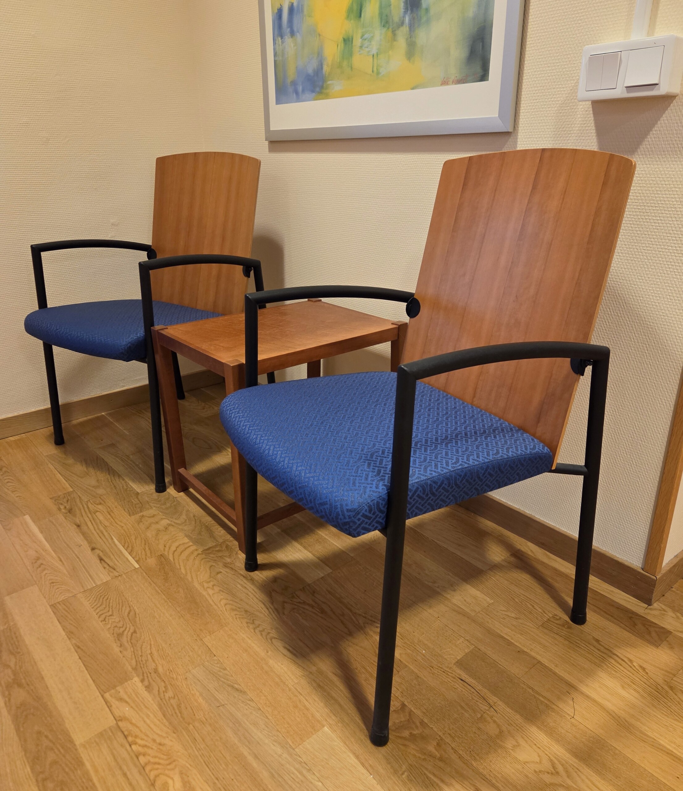 Seat in fabric (blue). Backrest in wood. Legs in metal (black).