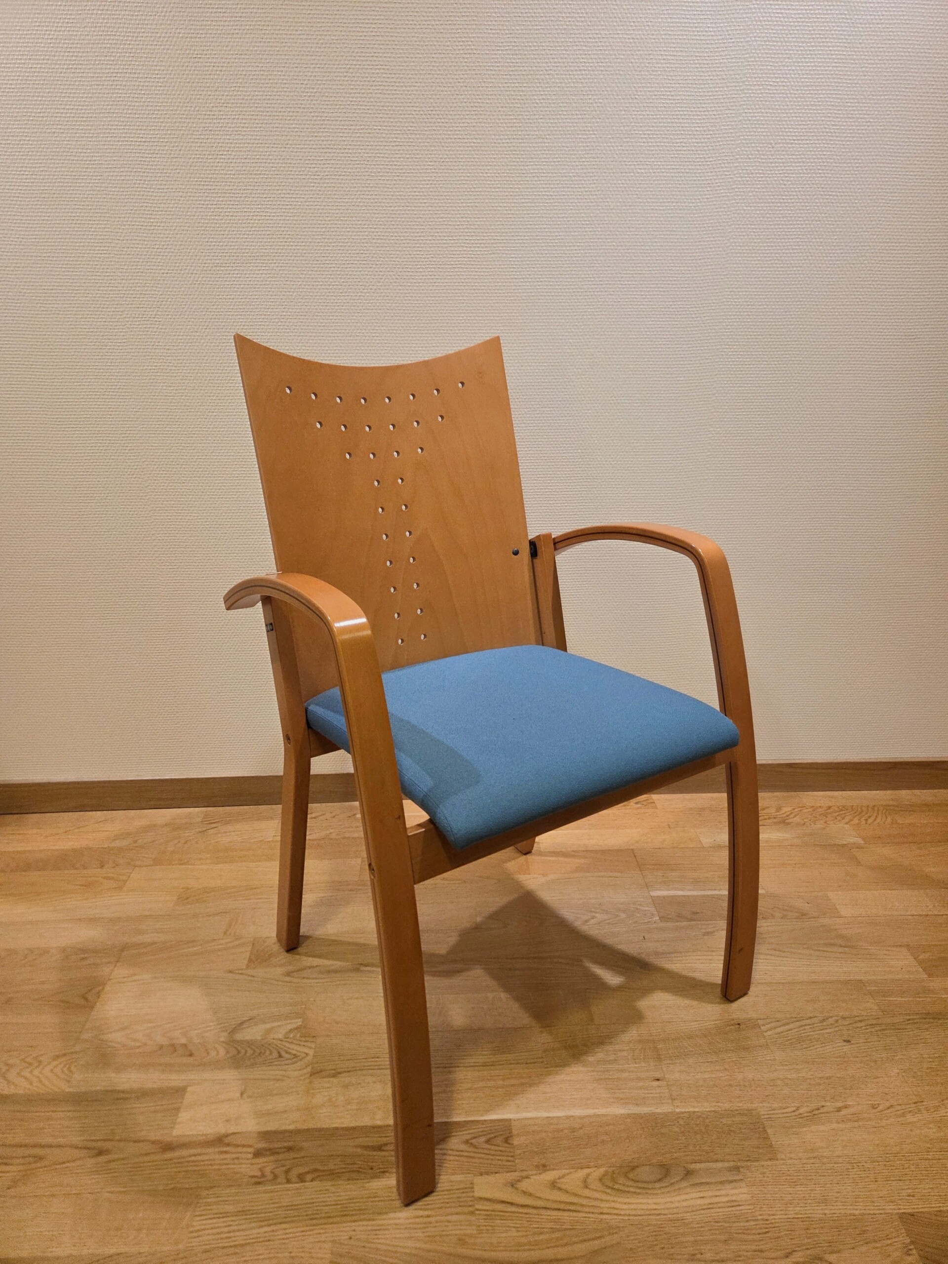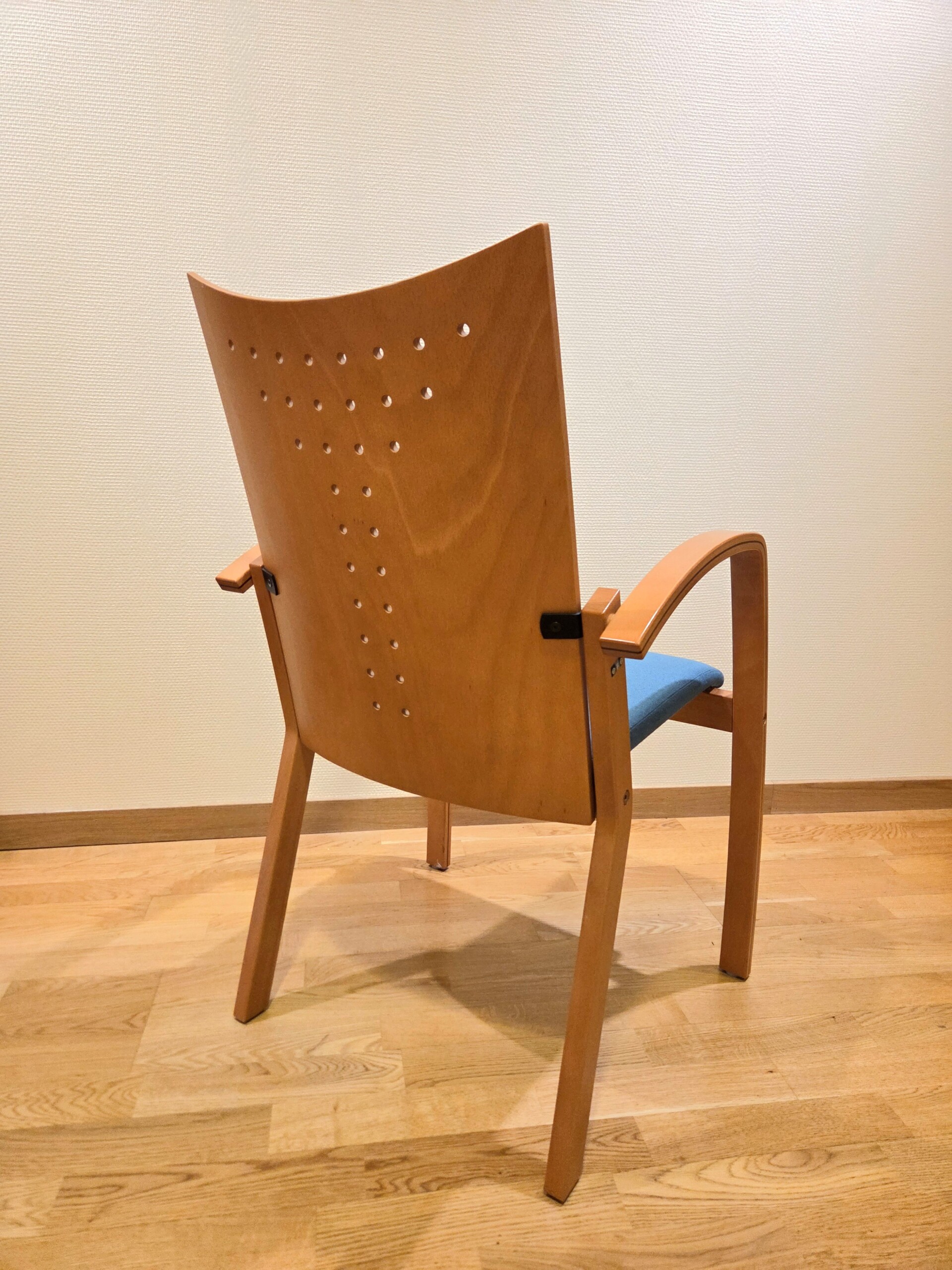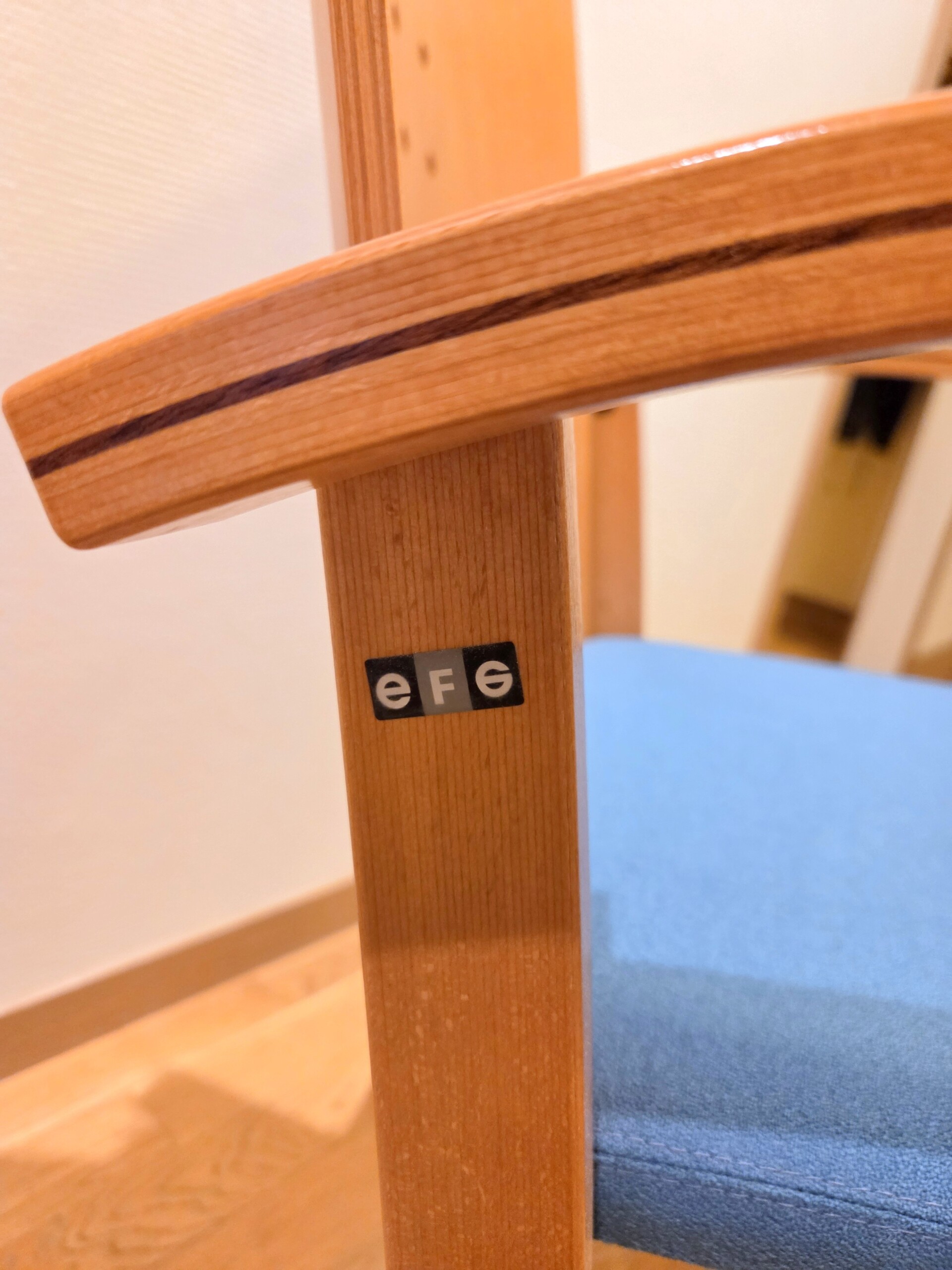 Seat in fabric (blue). Backrest in wood. Legs in wood.