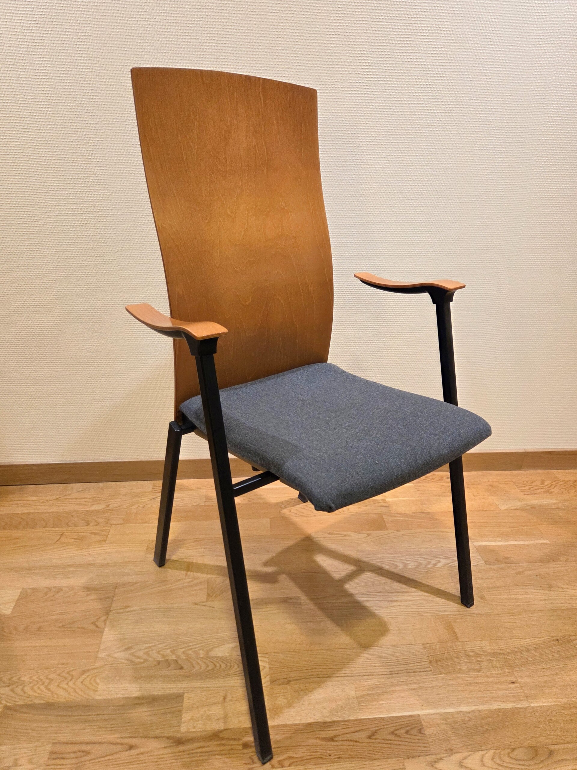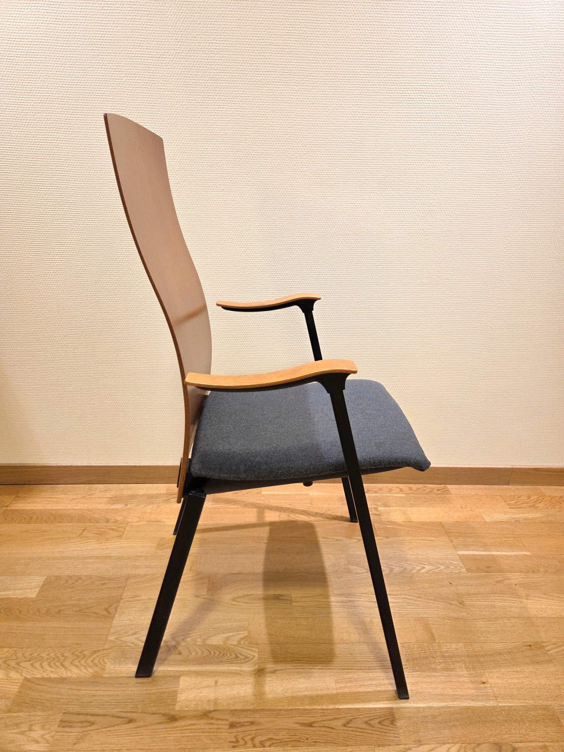 Seat in fabric (blue). Backrest in wood. Legs in metal (black).