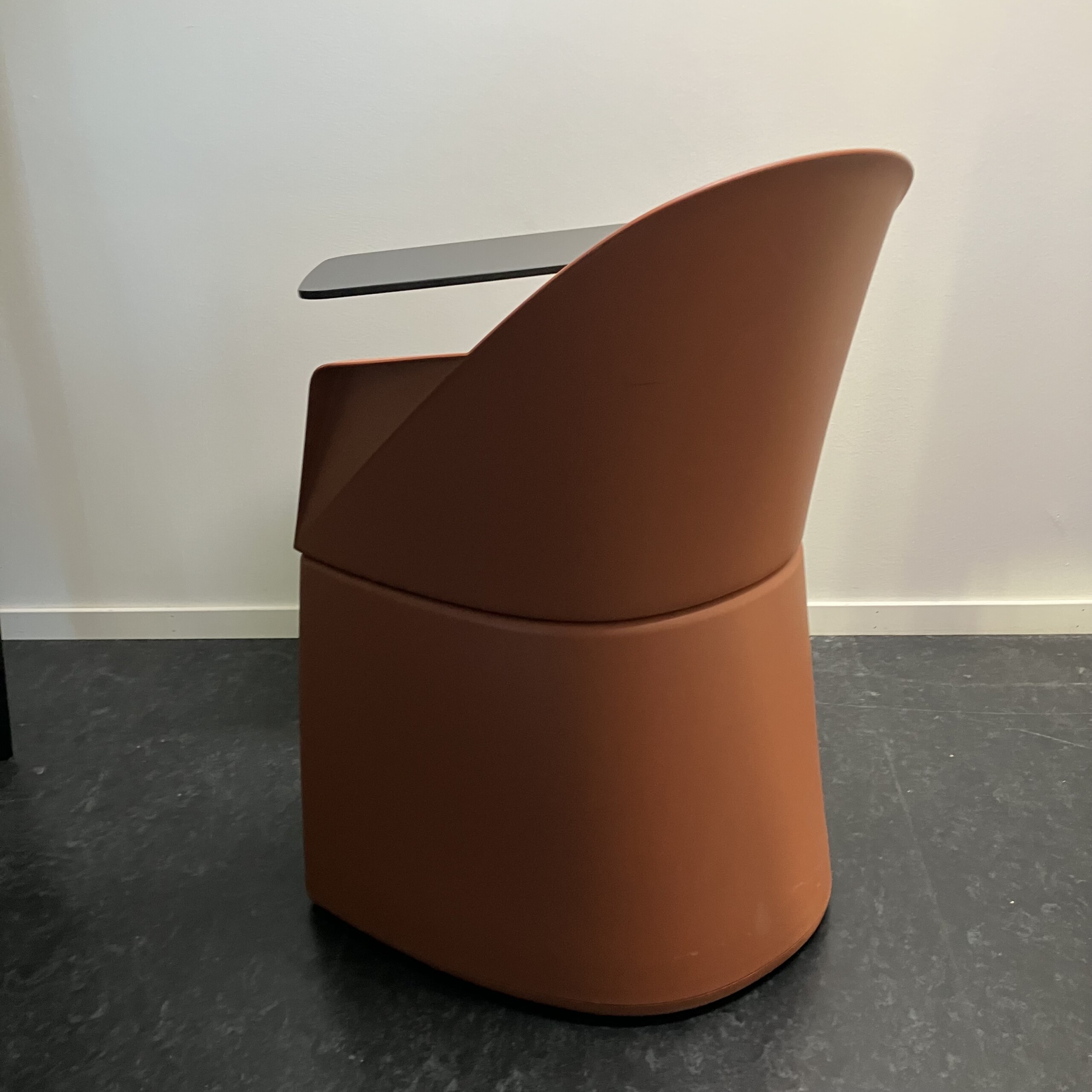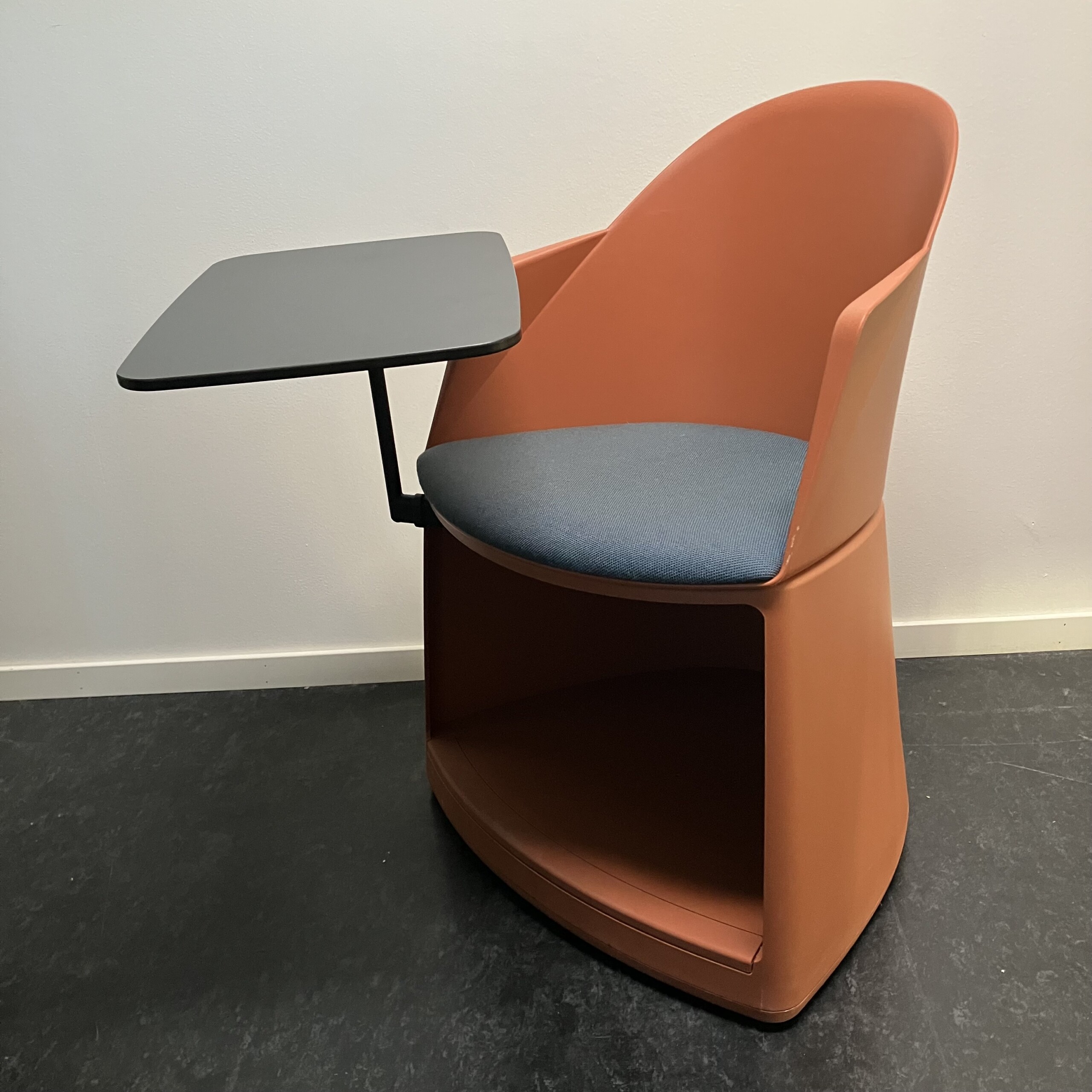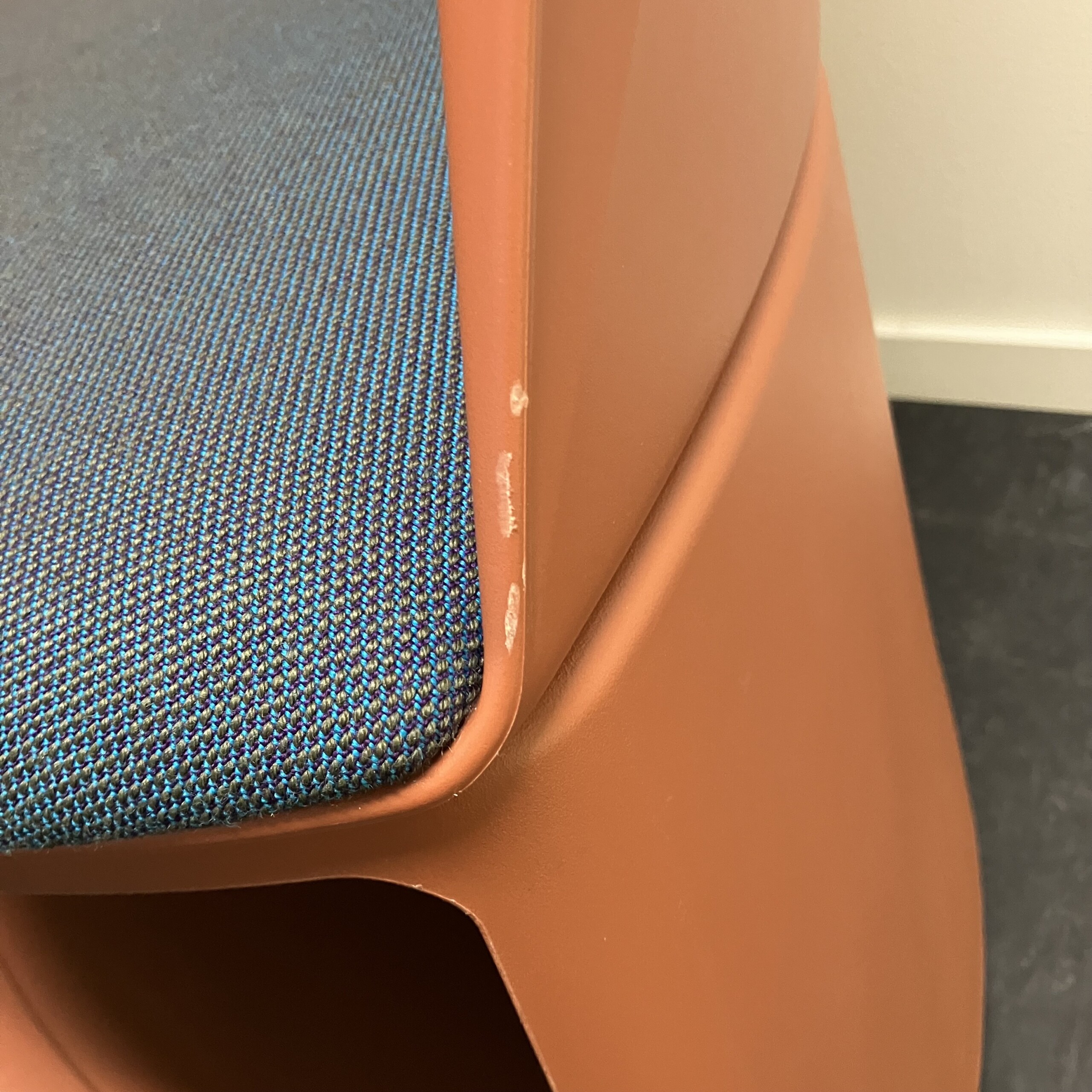 Seat in fabric (turquoise). Backrest in plastic (orange). Sledgebase in plastic (orange).