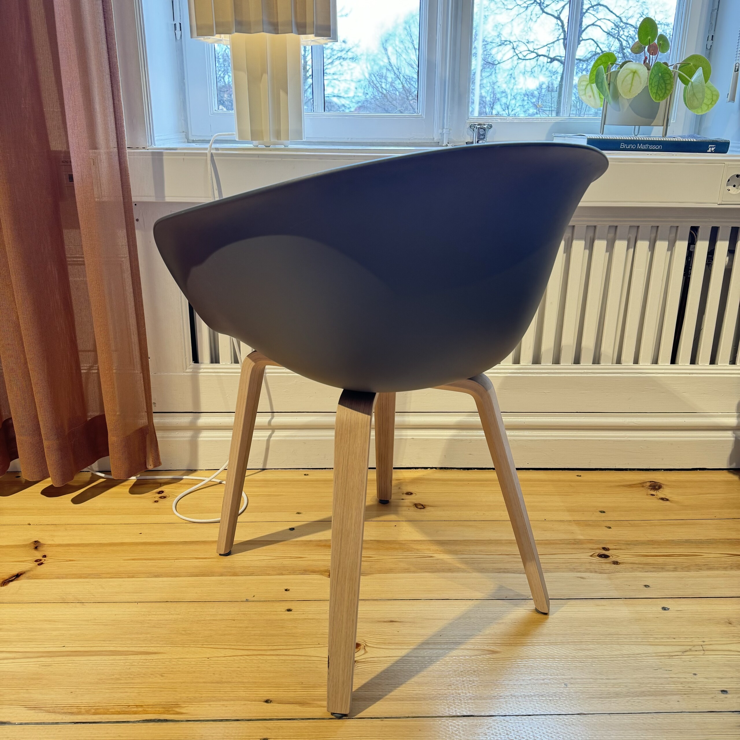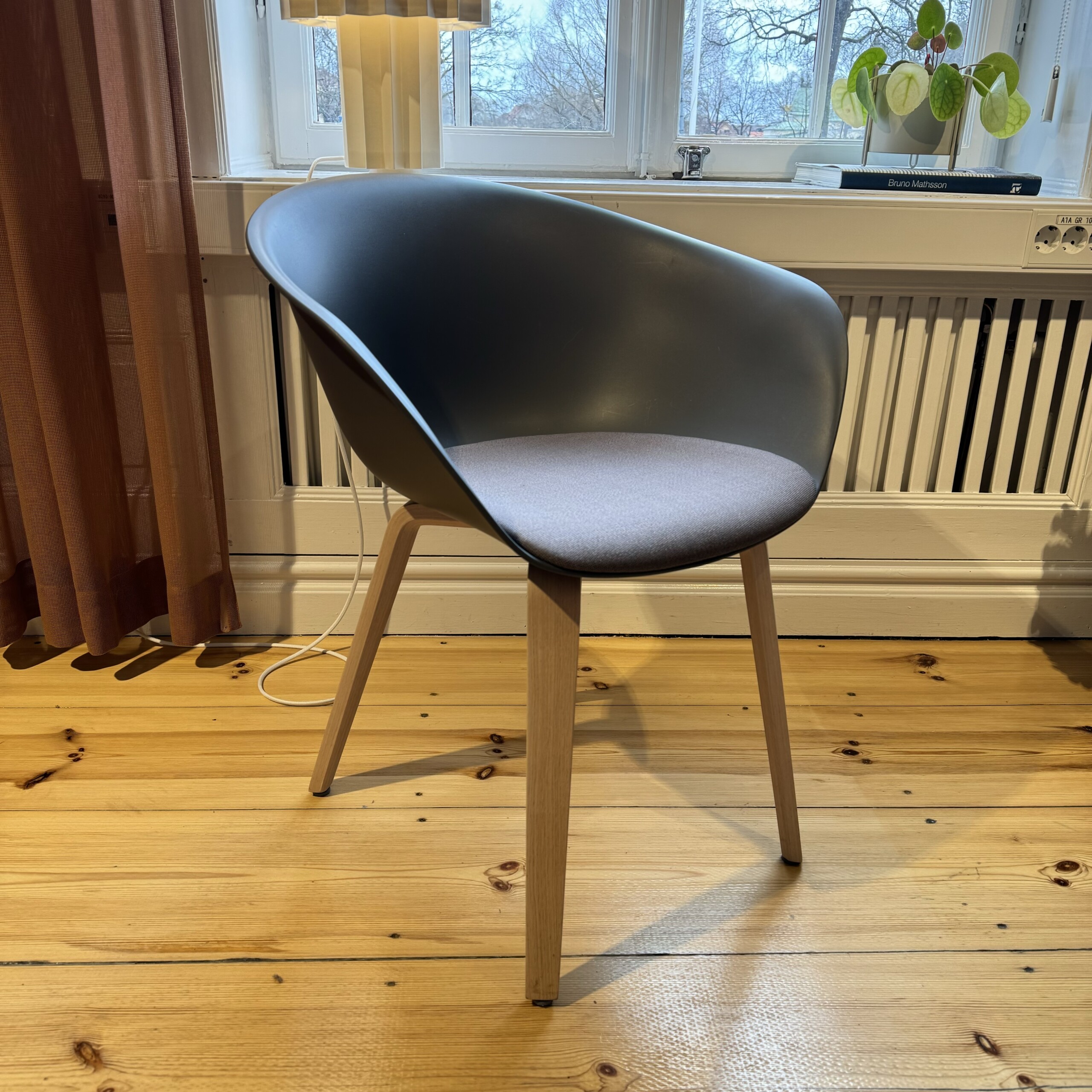Seat in fabric (grey). Backrest in plastic (grey). Legs in wood (oak).