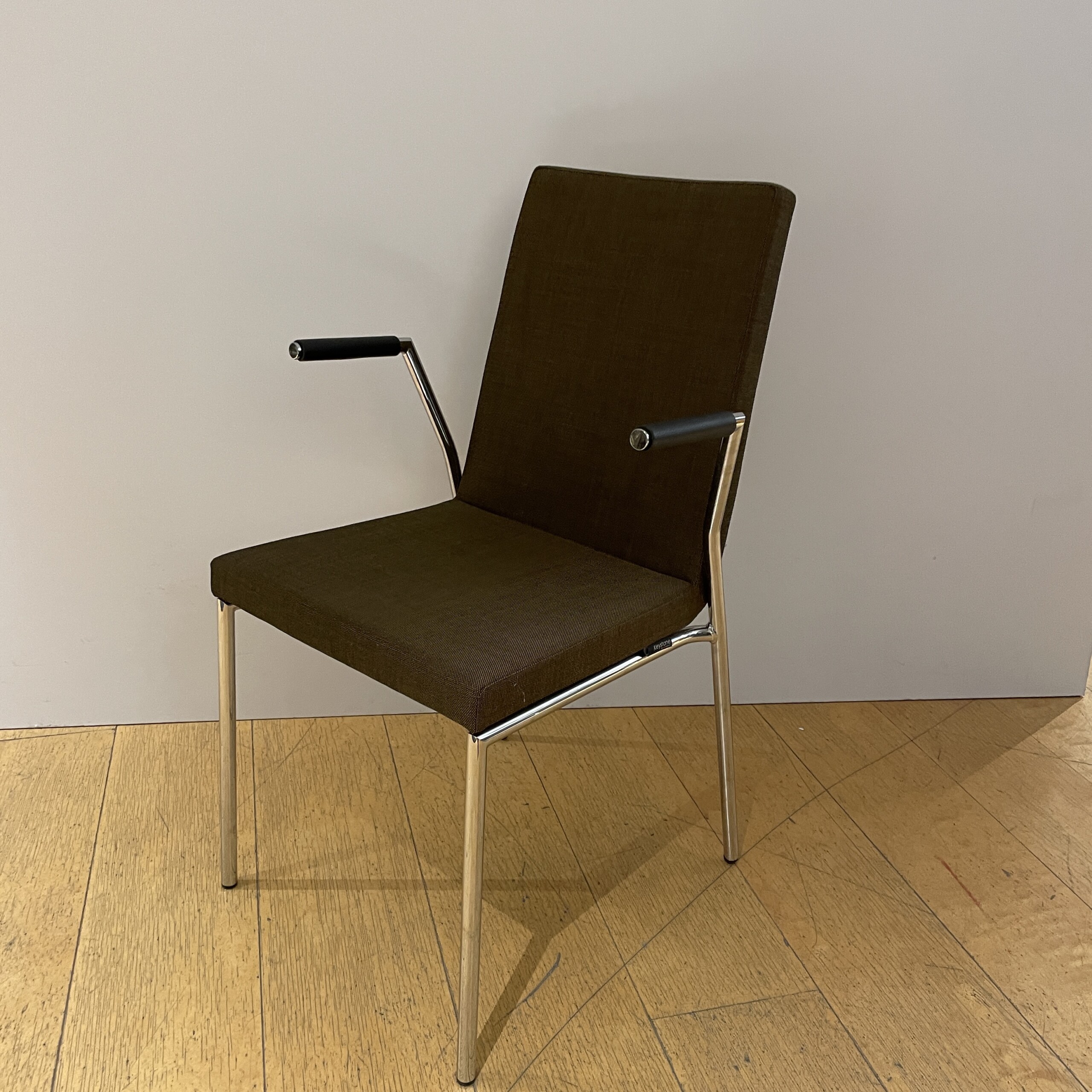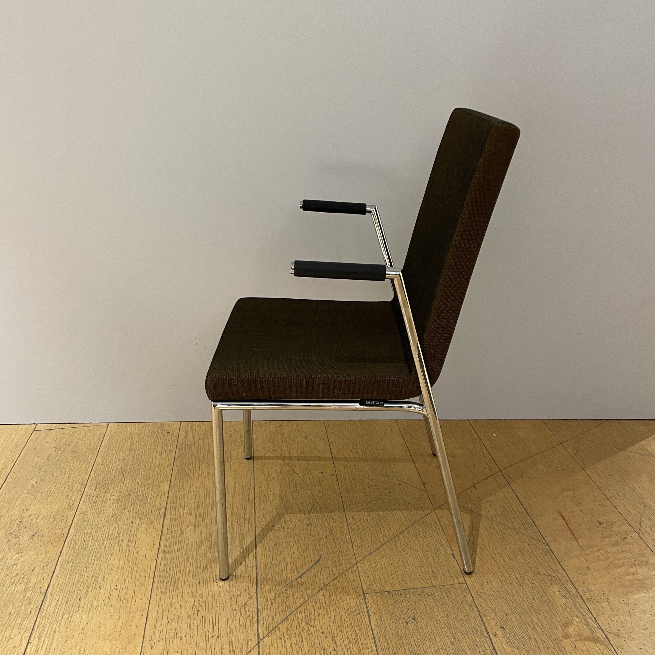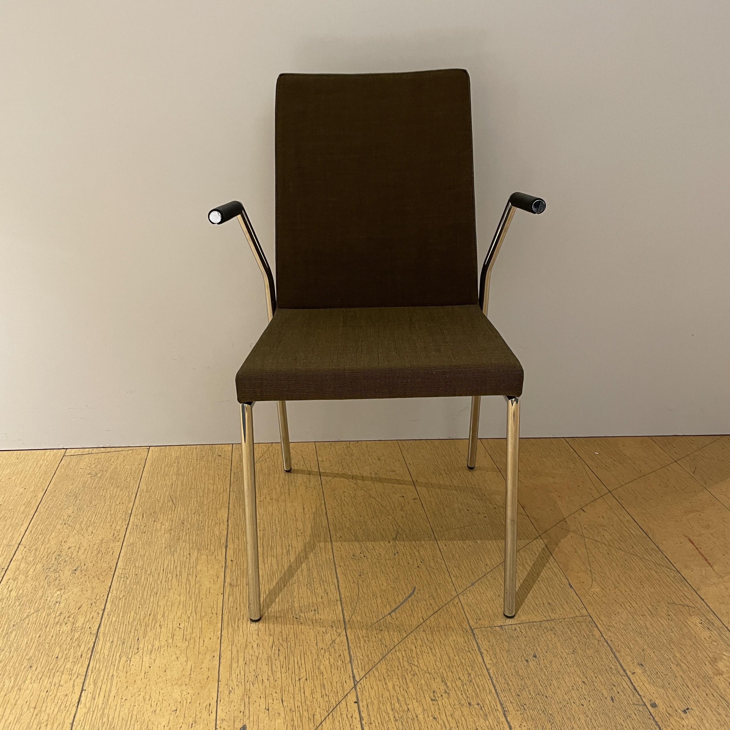 Seat and backrest in fabric (brown). Legs in metal (chrome).