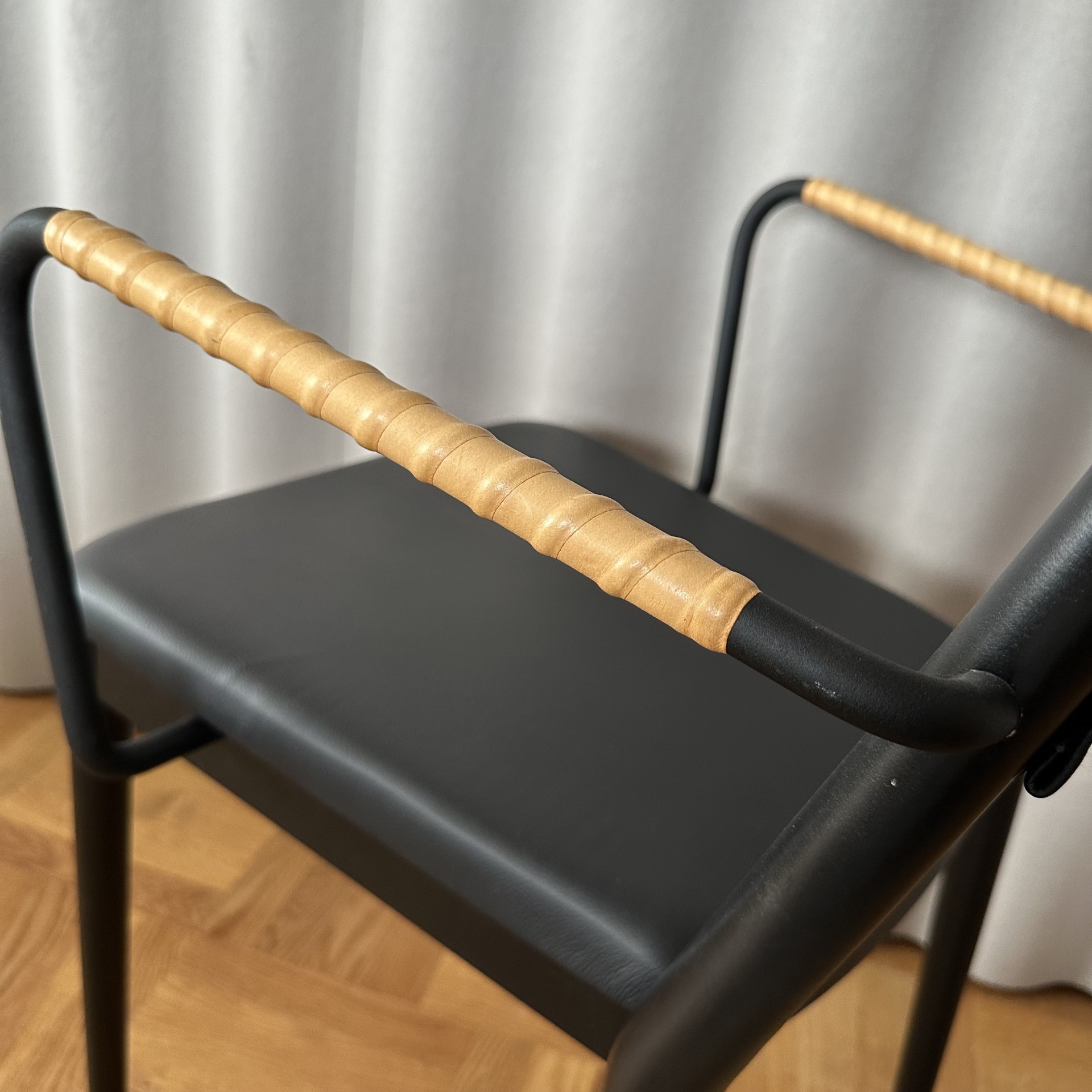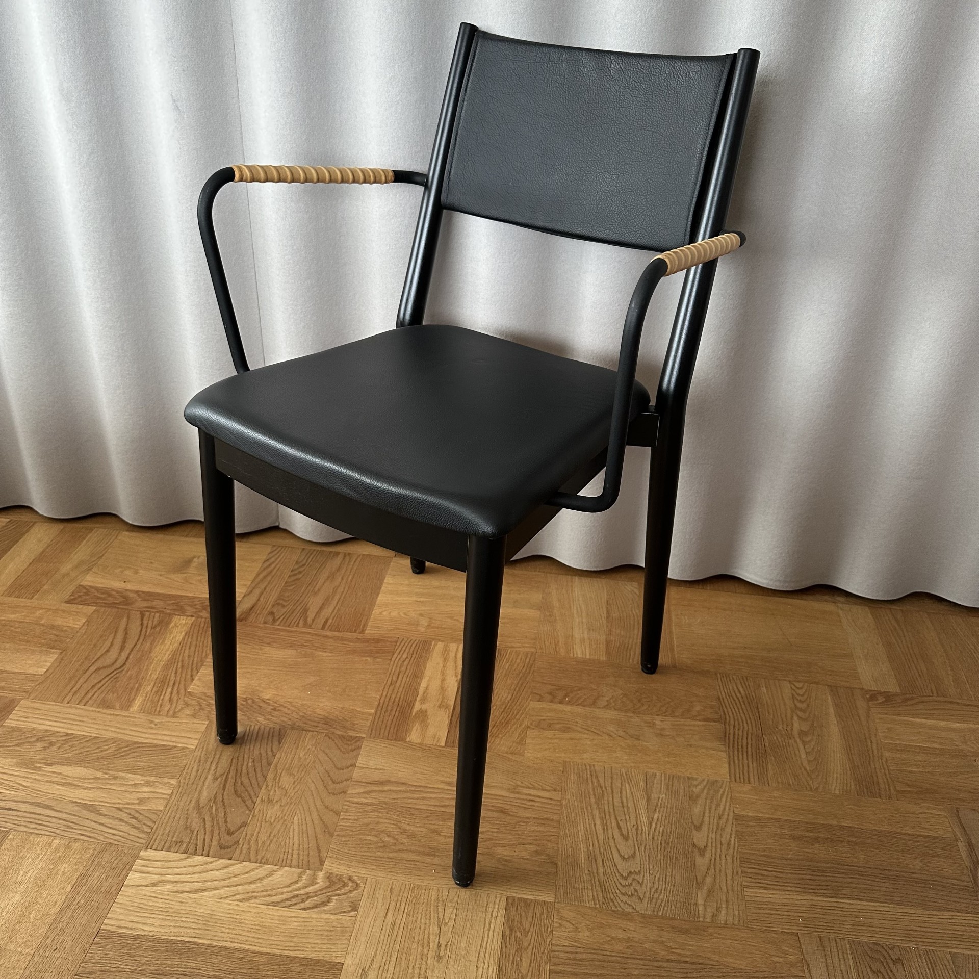 Seat and backrest in leather (black). Legs in wood (black).