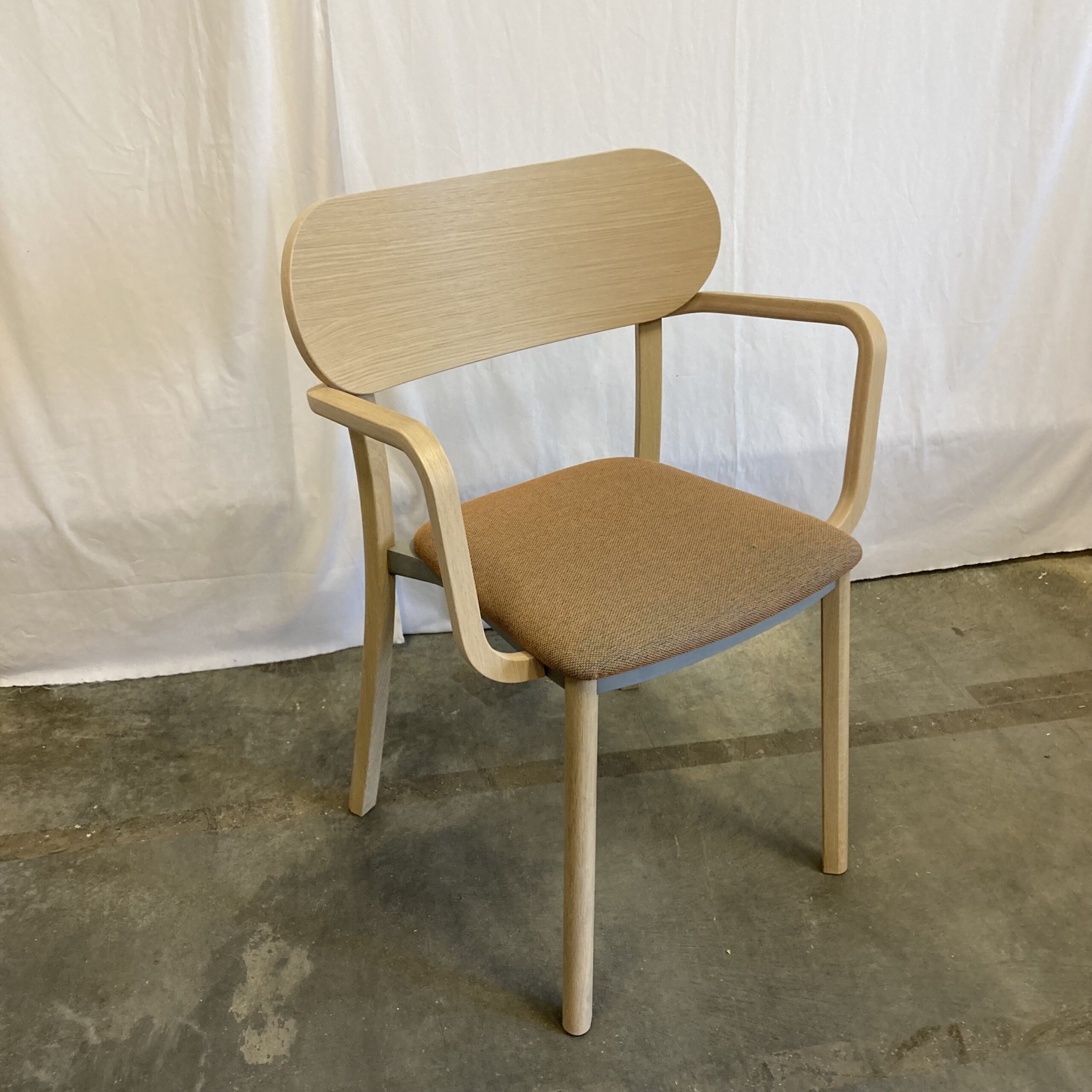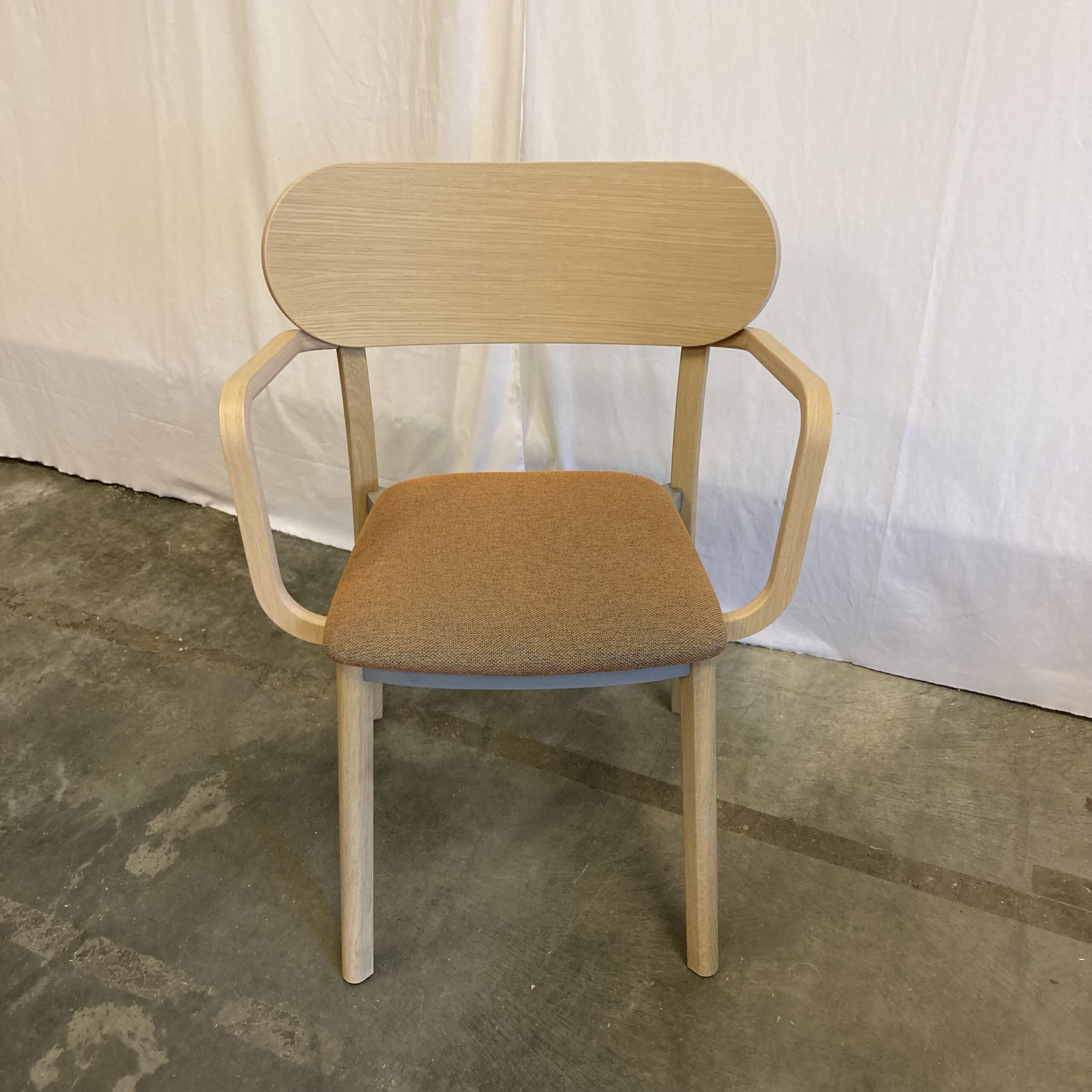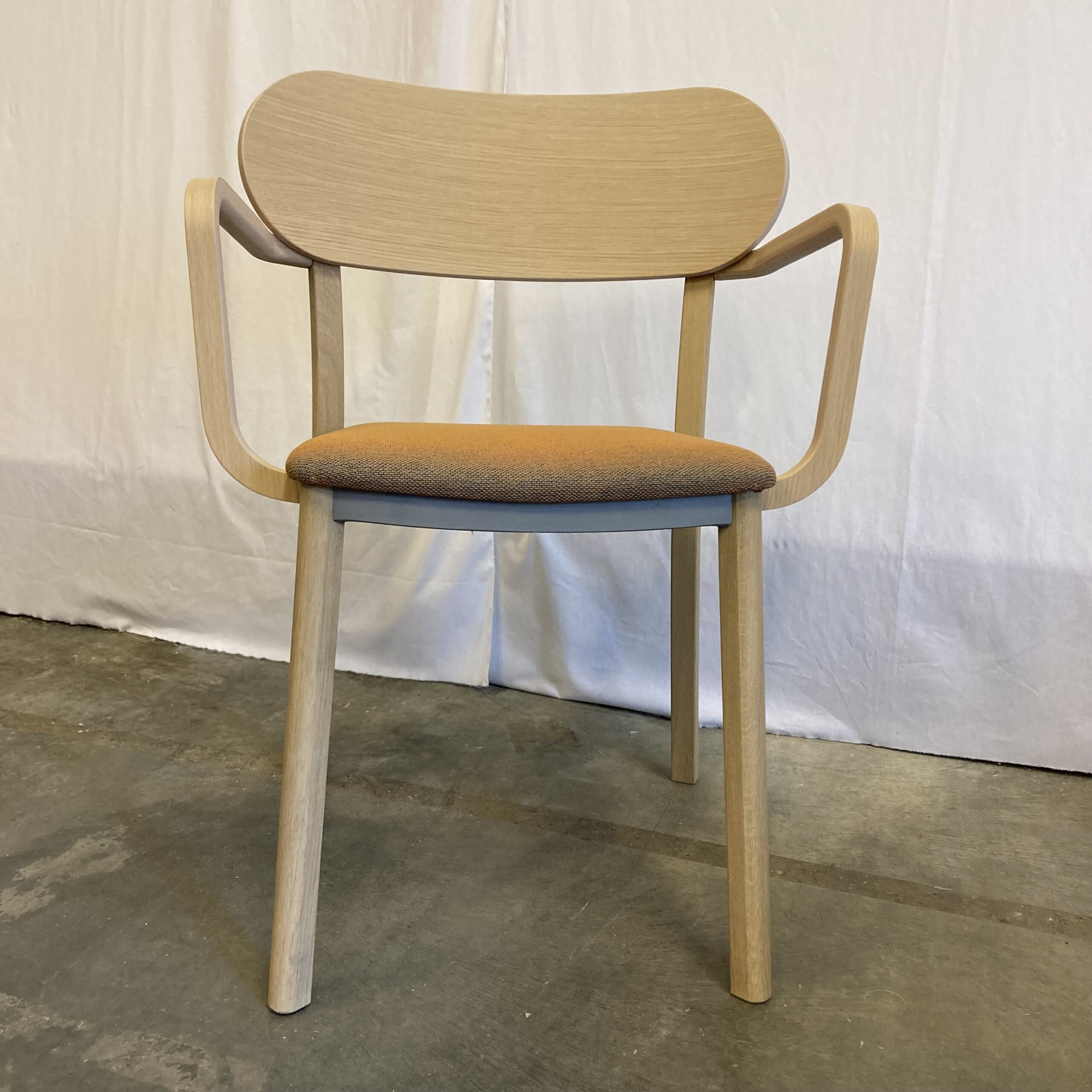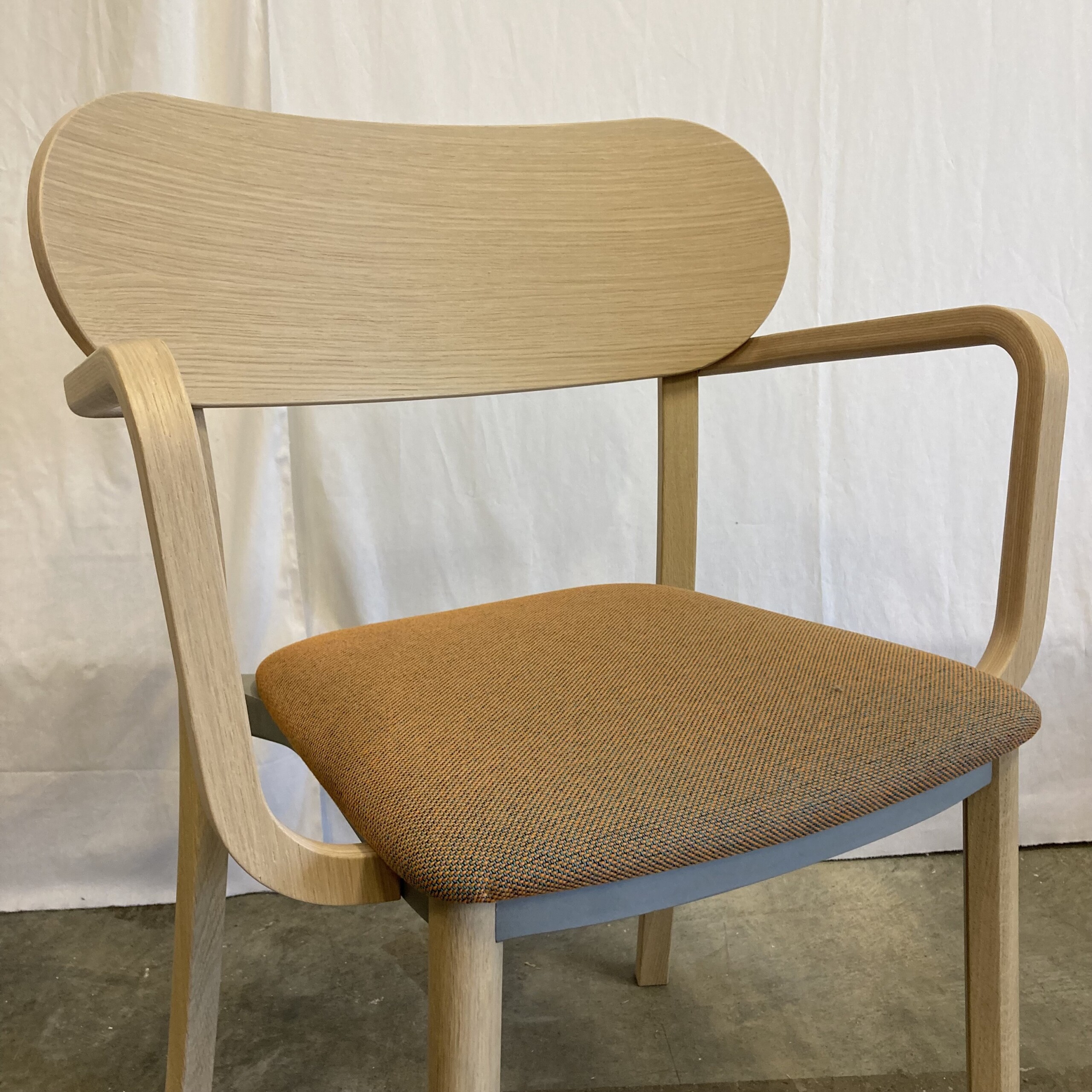 Seat in fabric (orange). Backrest in wood (oak). Legs in wood (oak).