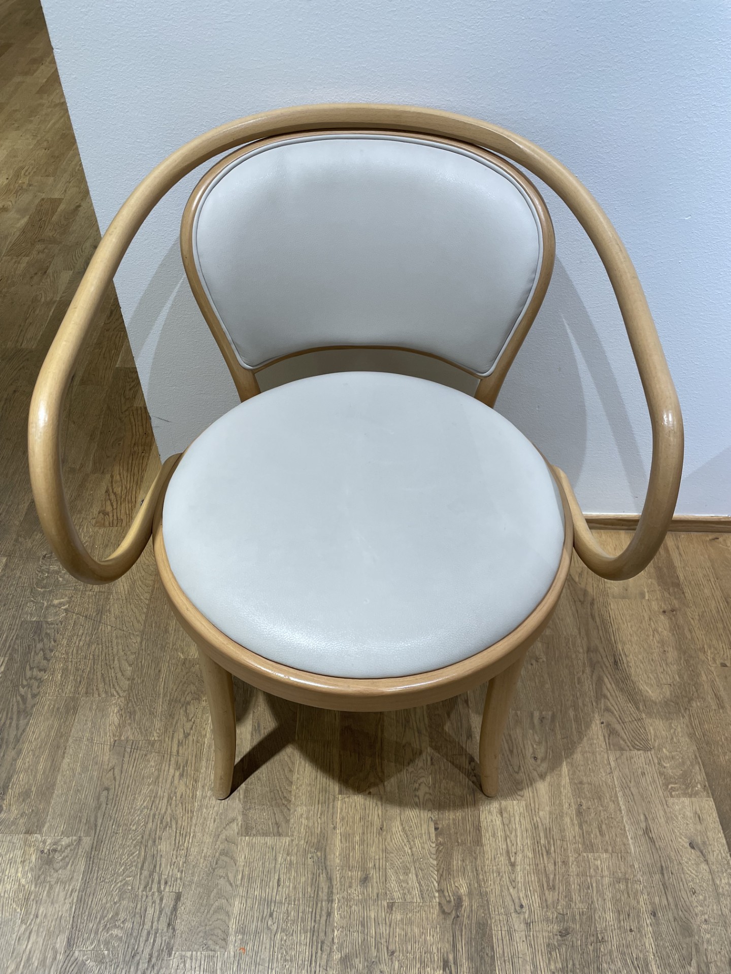 Seat and backrest in leather. Legs in wood.