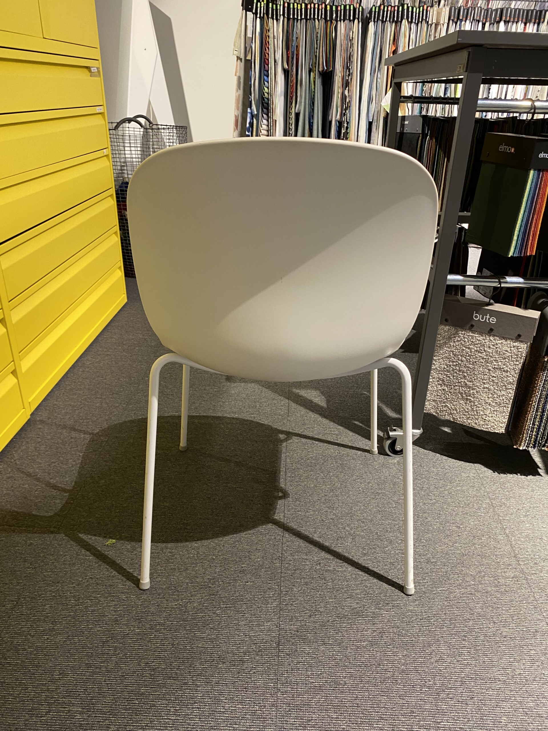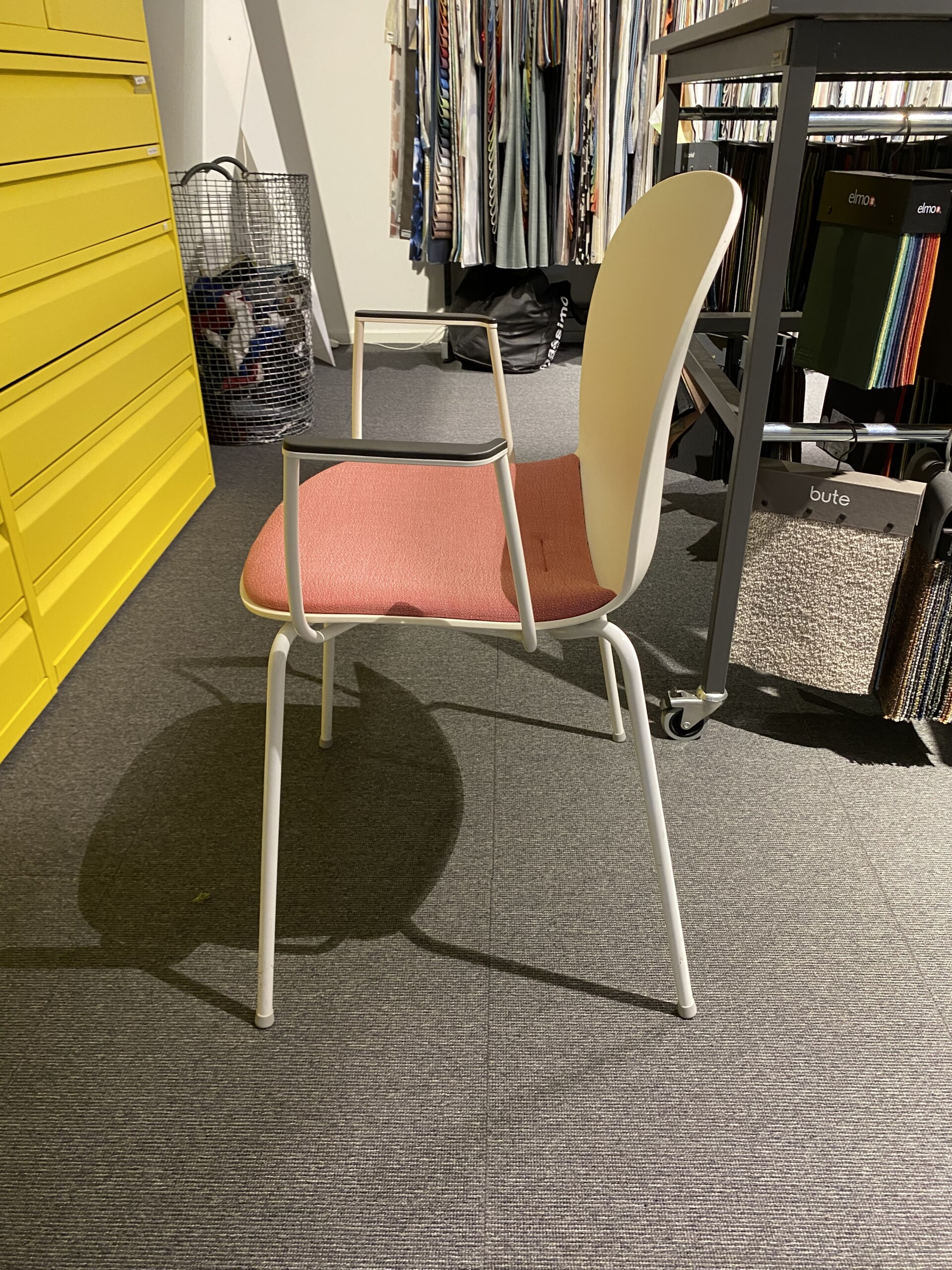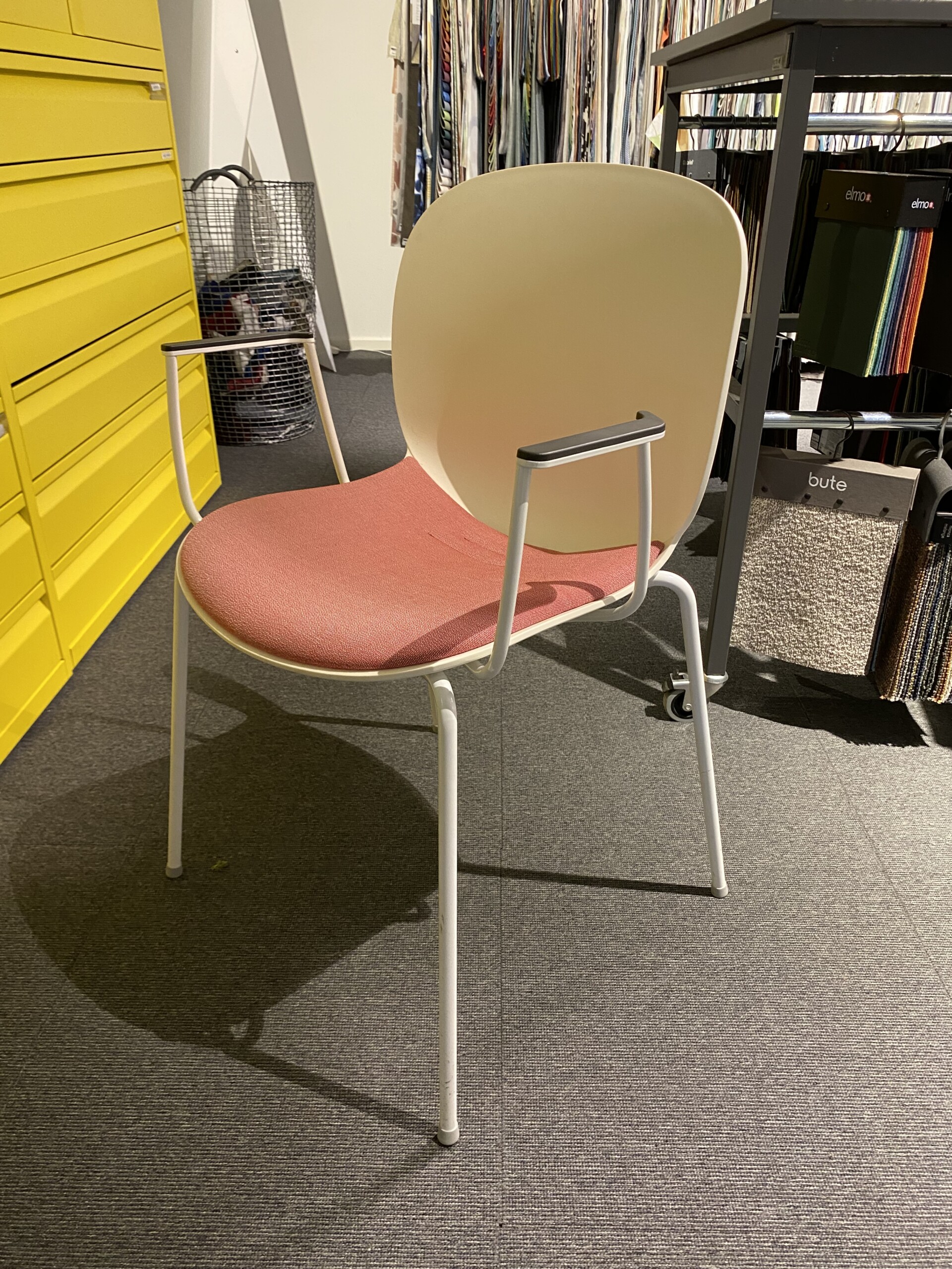 Seat in fabric (pink). Backrest in plastic (white). Legs in metal (white).