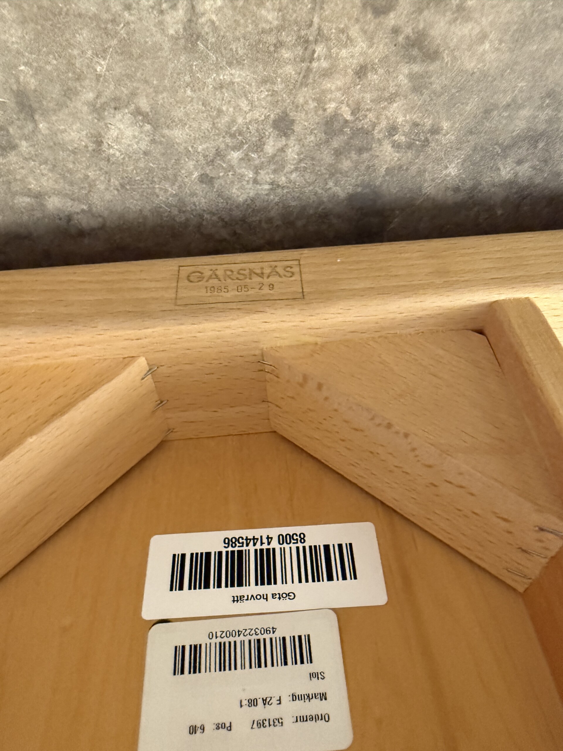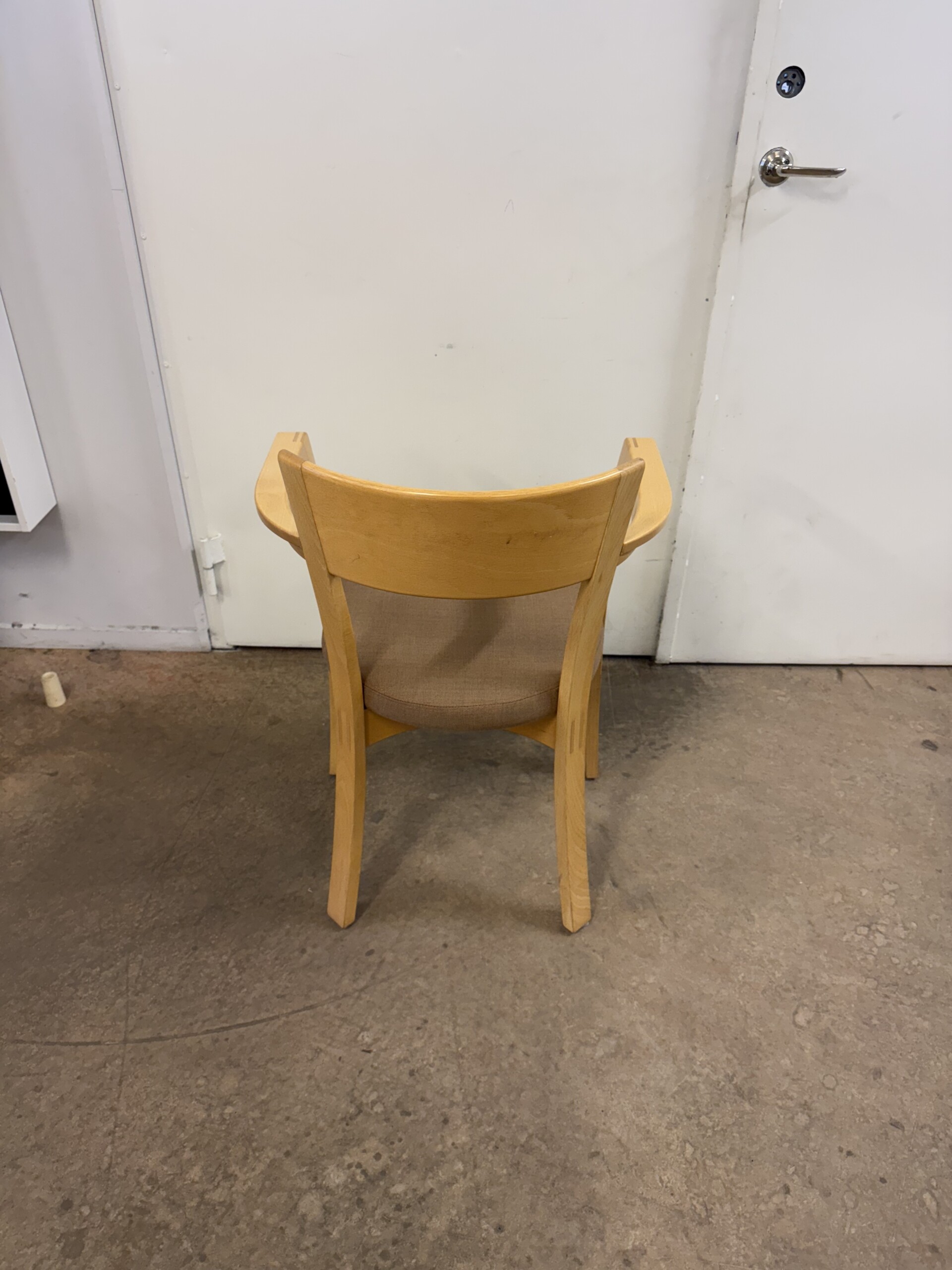 Seat in fabric (beige). Backrest in wood (bok). Legs in wood (bok).