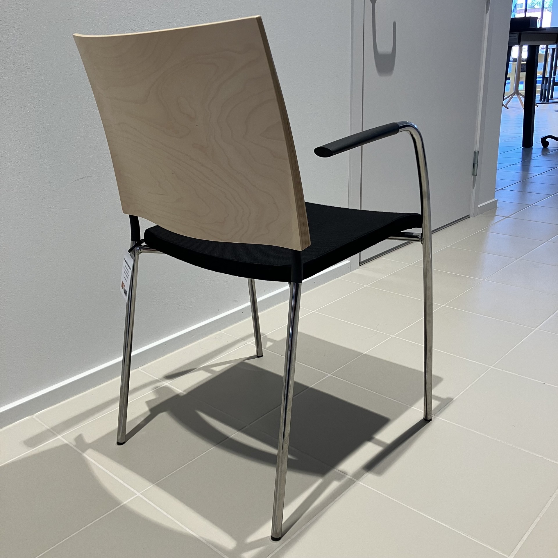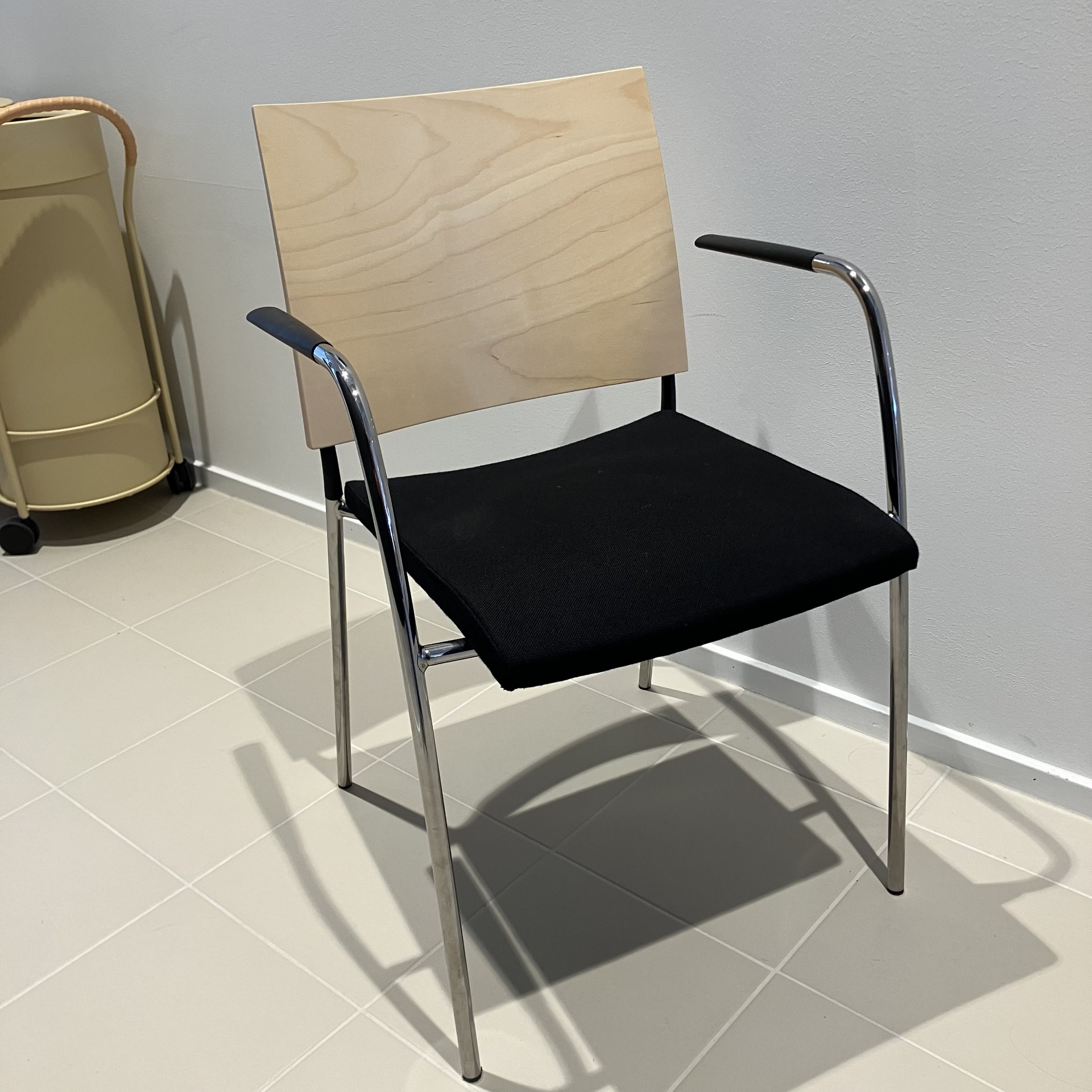 Seat in fabric (black). Backrest in wood (birch). Legs in metal (chrome).
