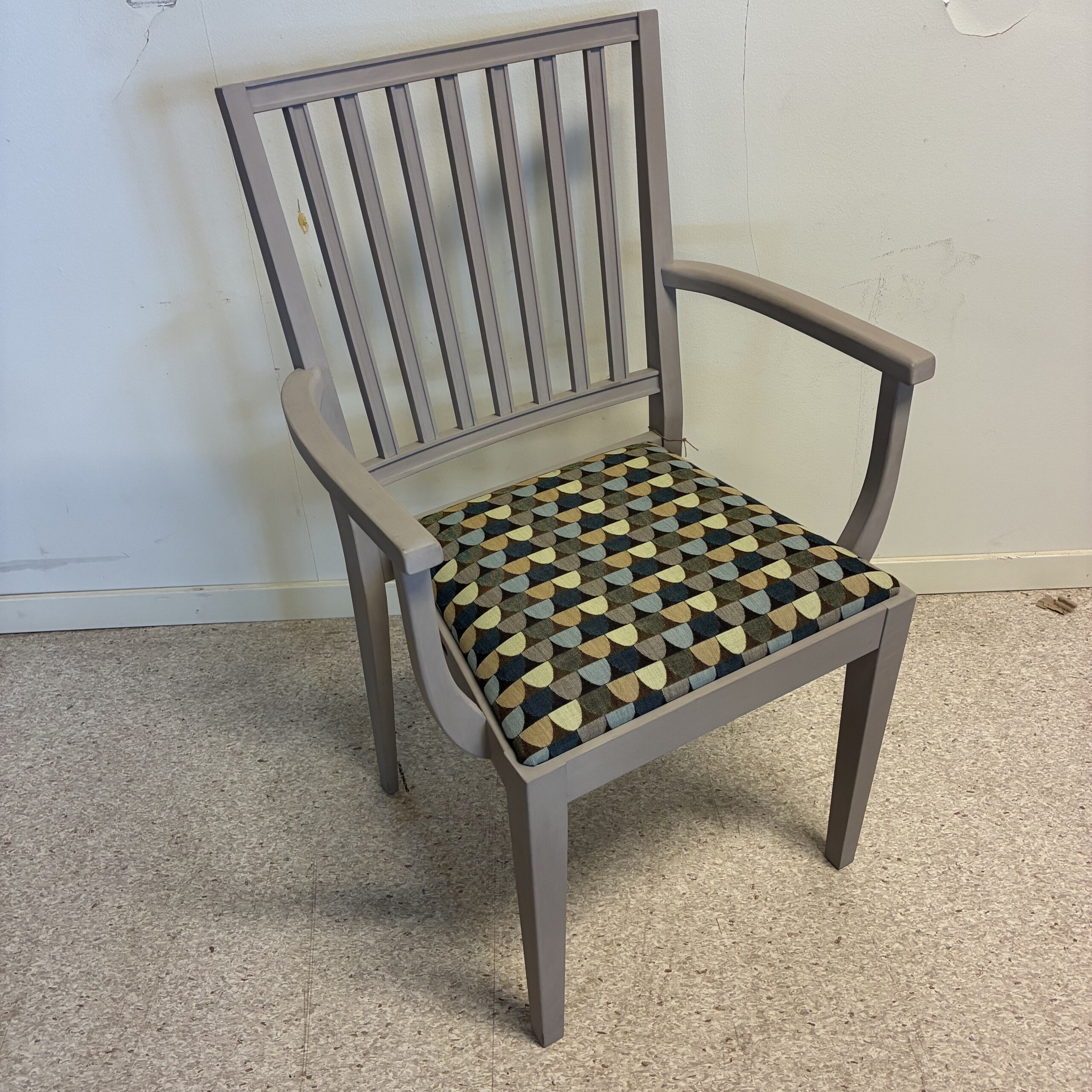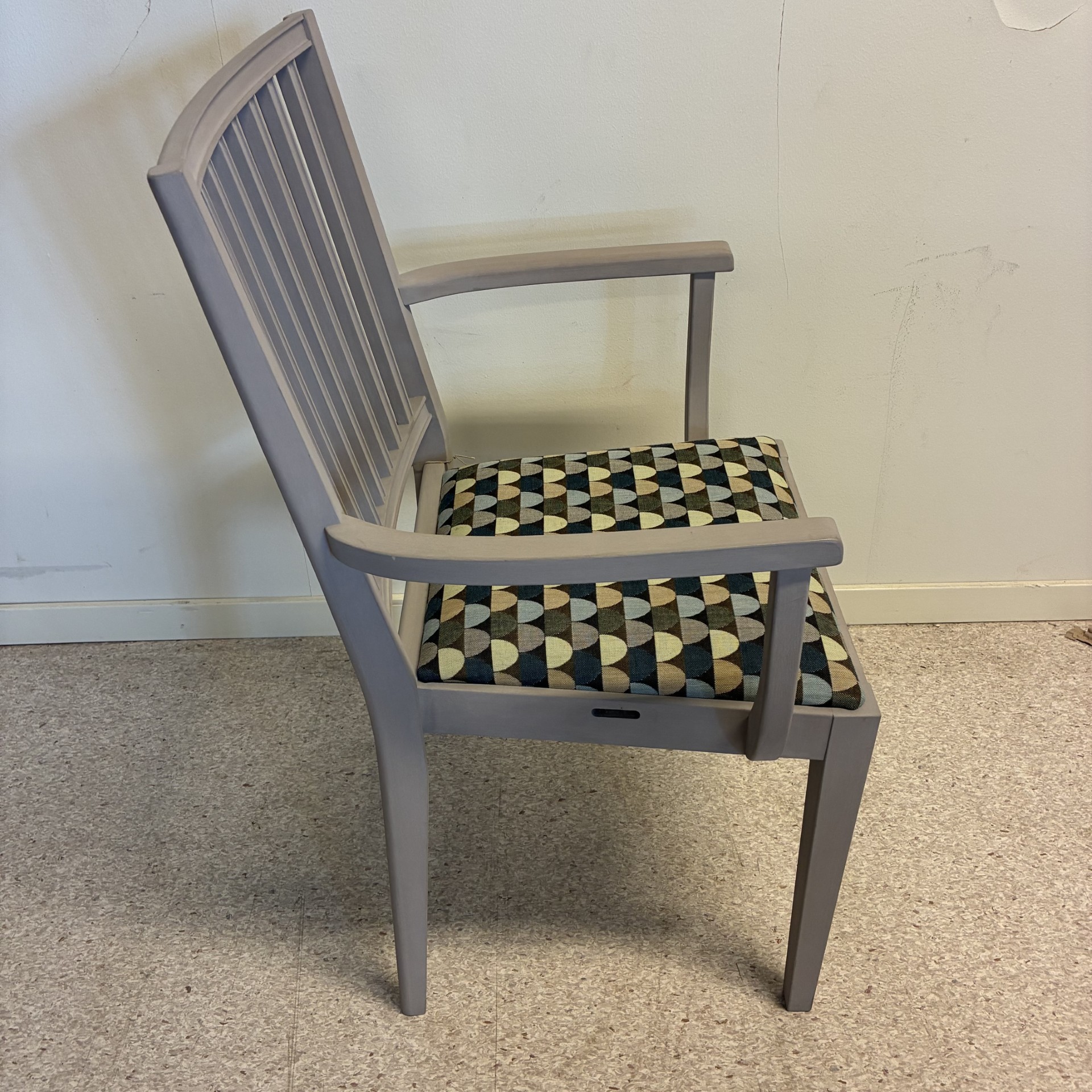 Seat in fabric. Backrest in wood (grey). Legs in wood (grey).