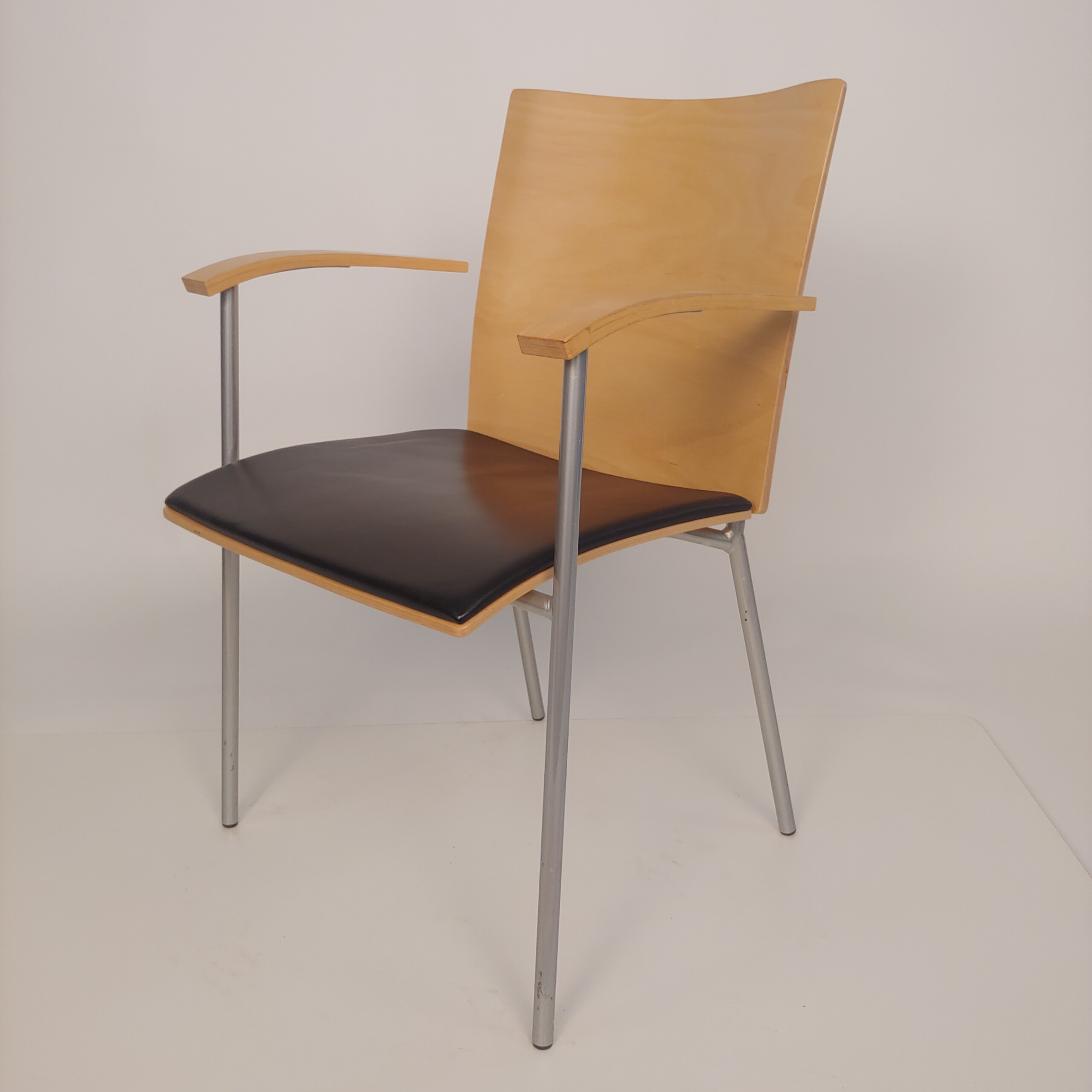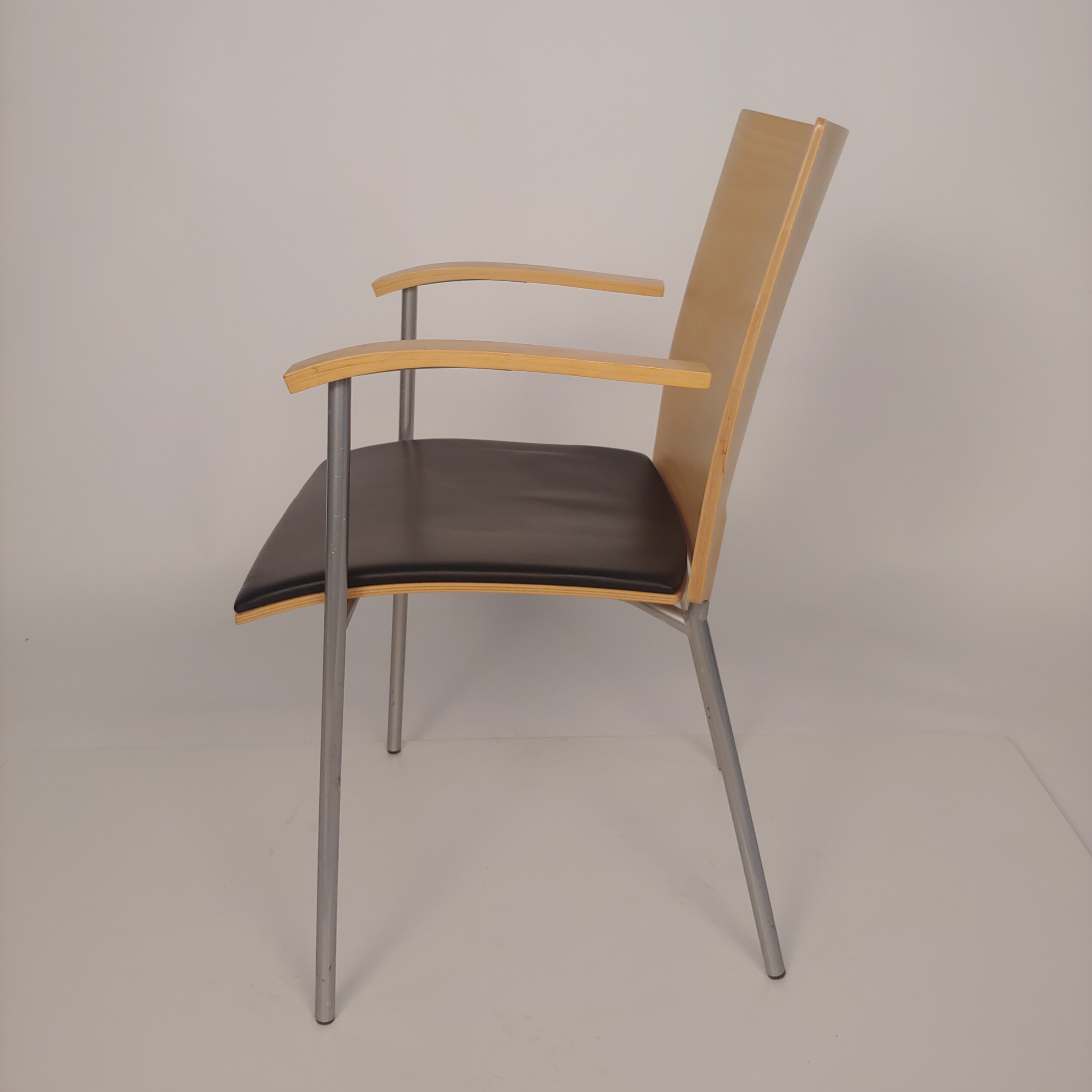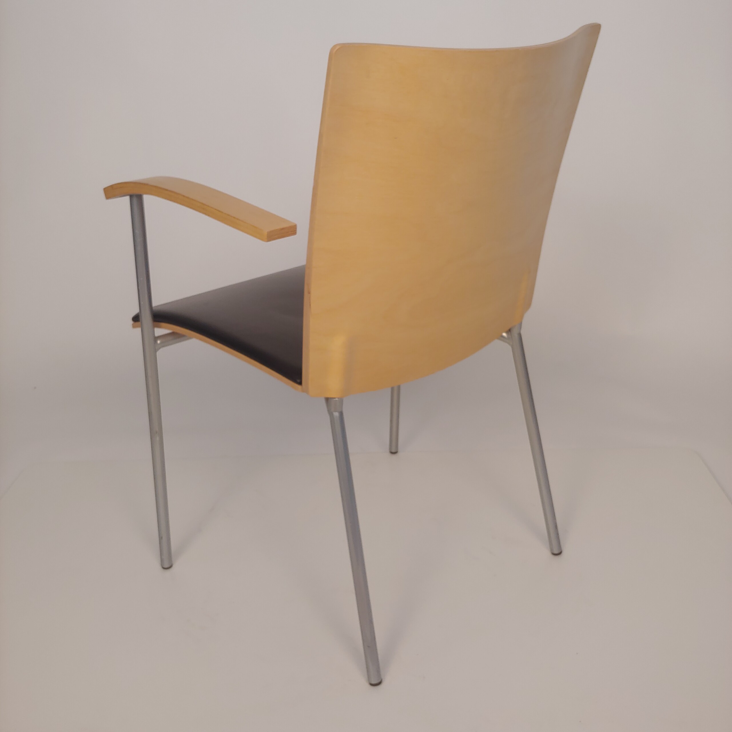 Seat in leather (black). Backrest in wood (birch). Legs in metal (silver).