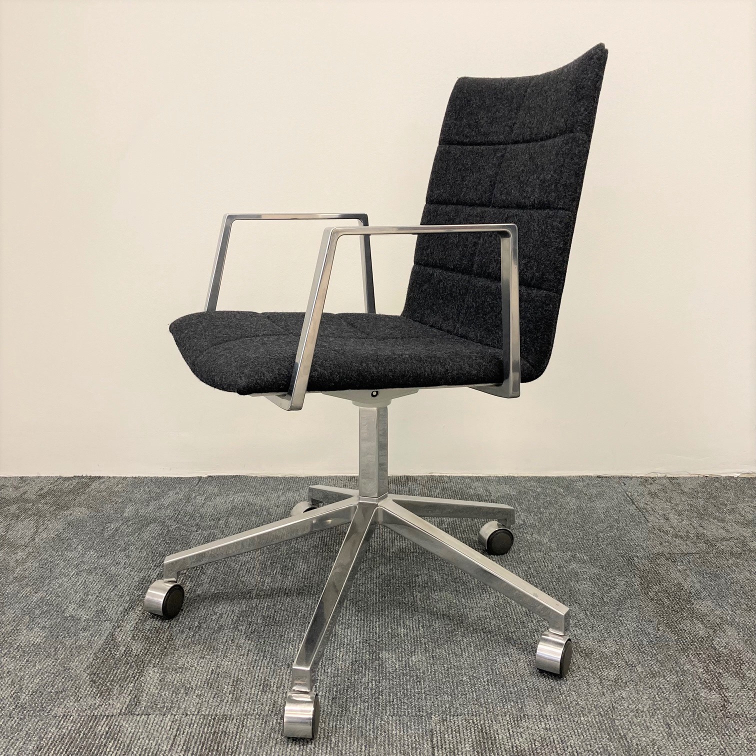 Seat and backrest in fabric (grey). Star base in metal (aluminium). Adjustable height.
