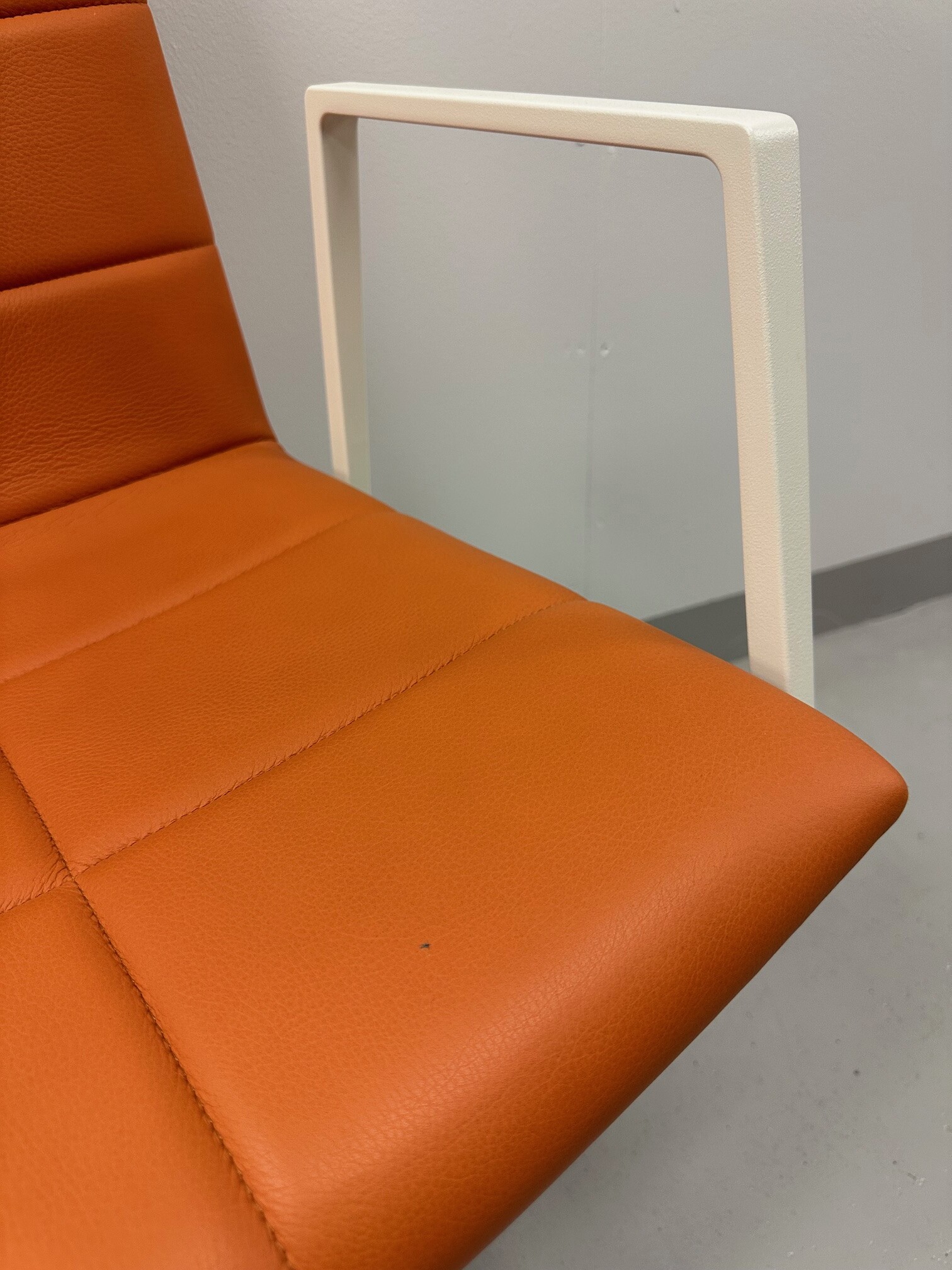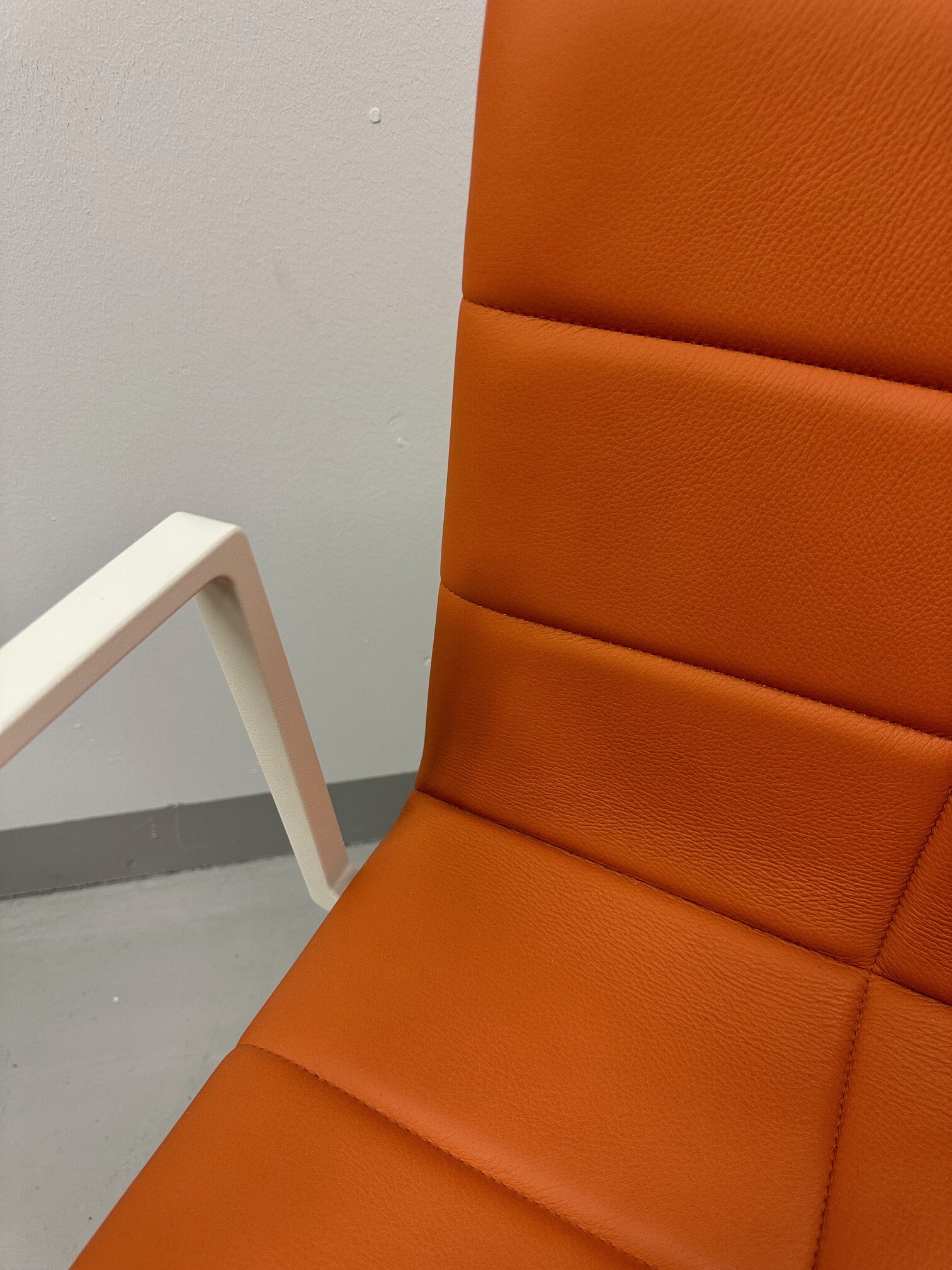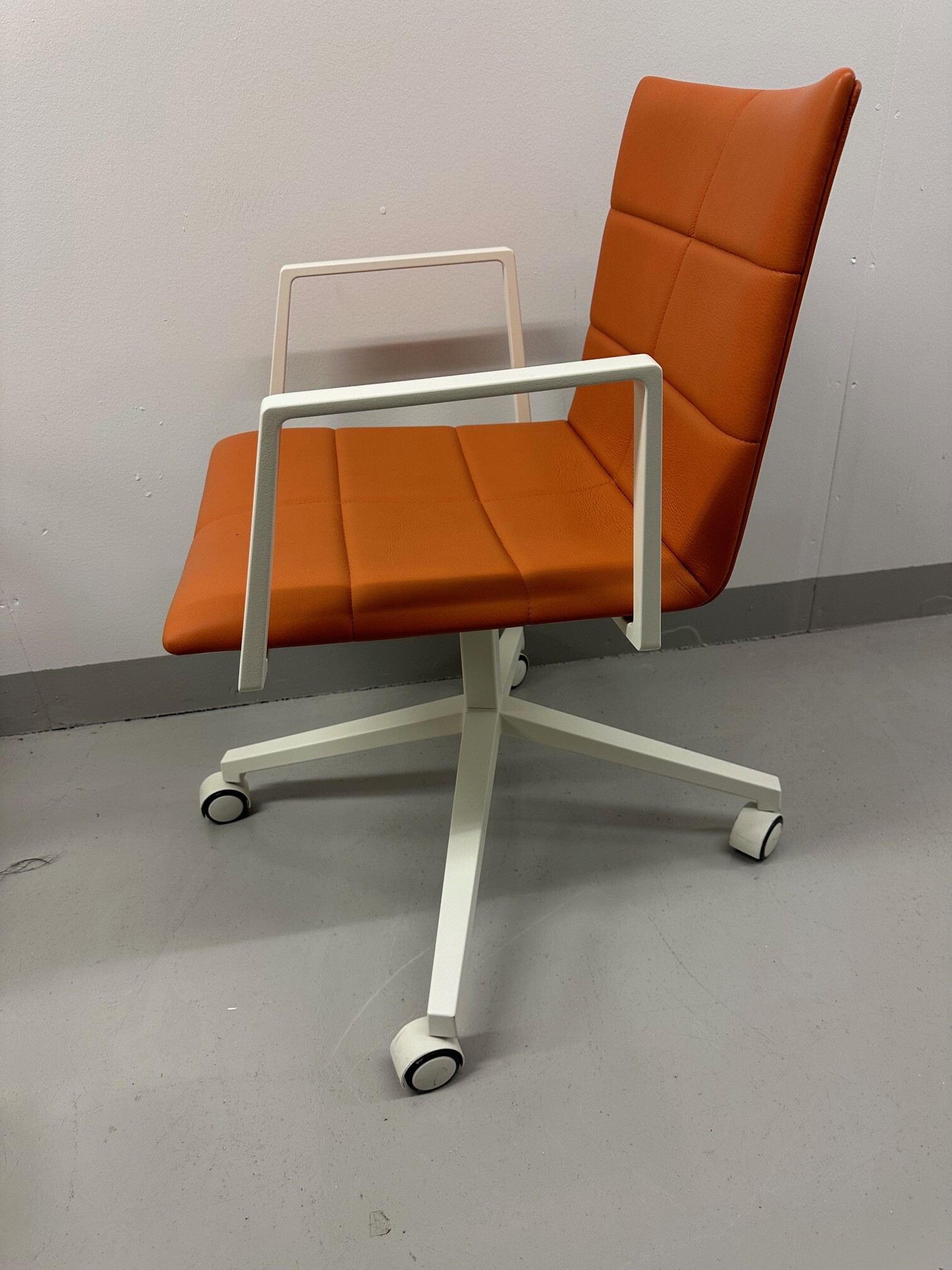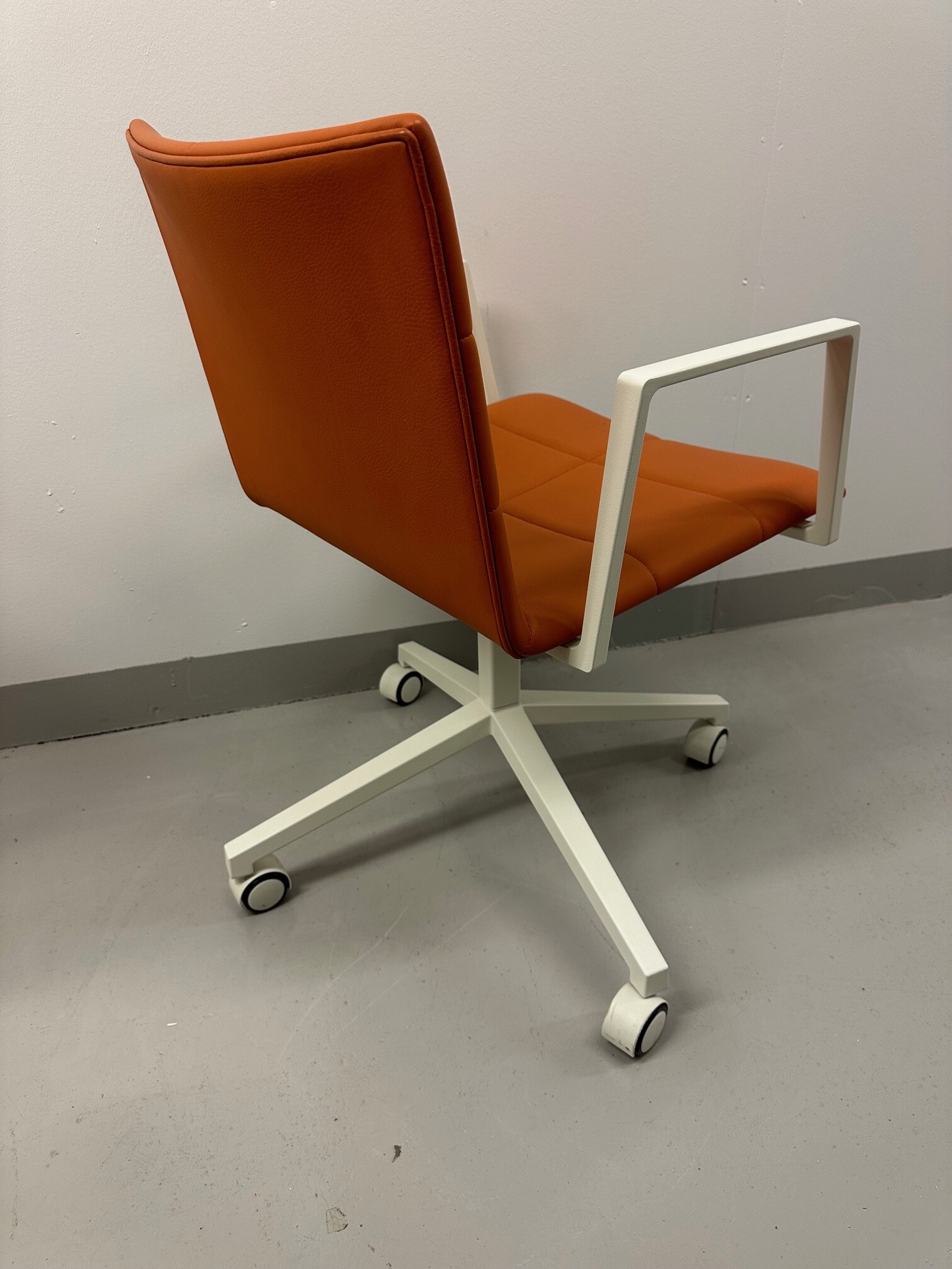 Seat and backrest in leather (orange). Star base in metal (white).