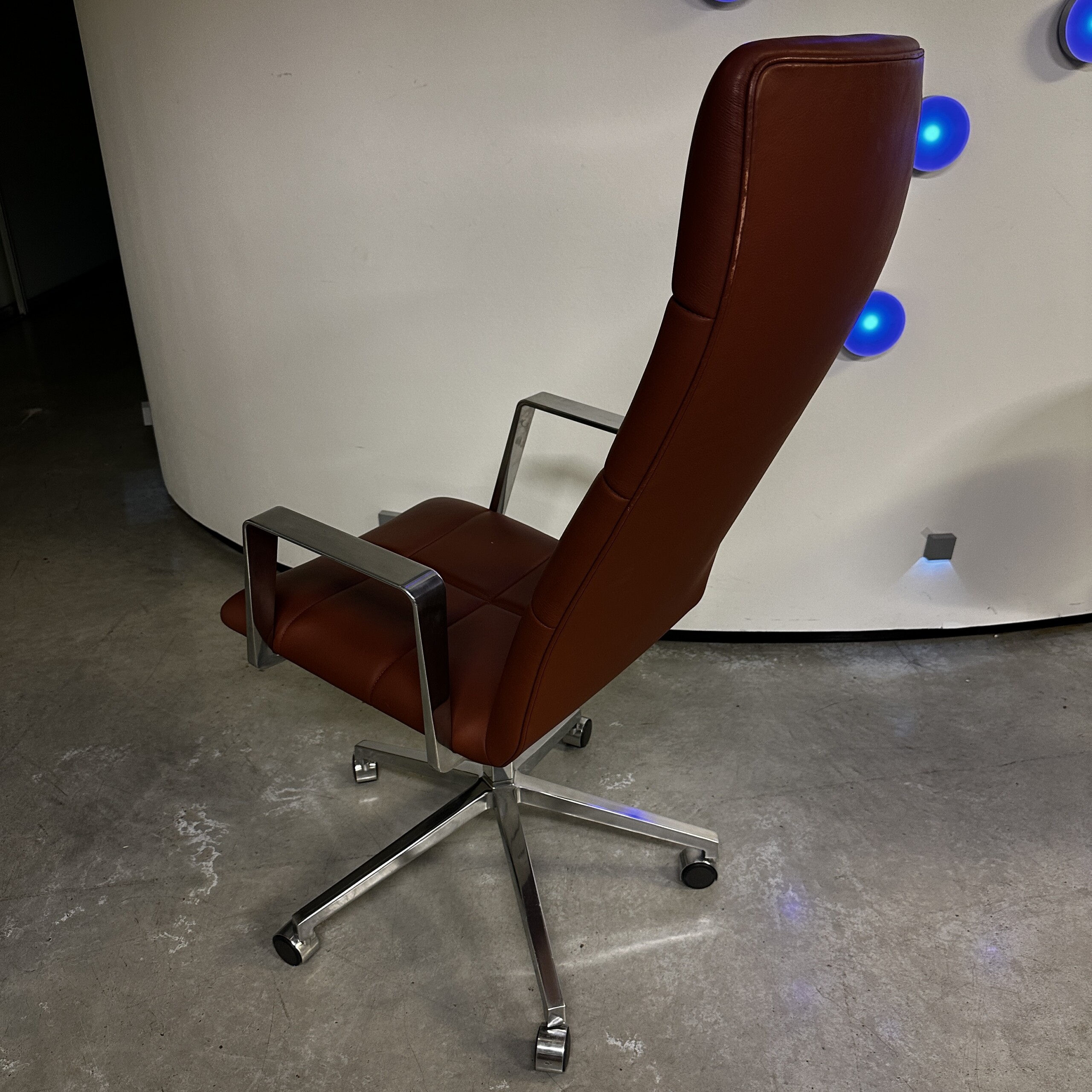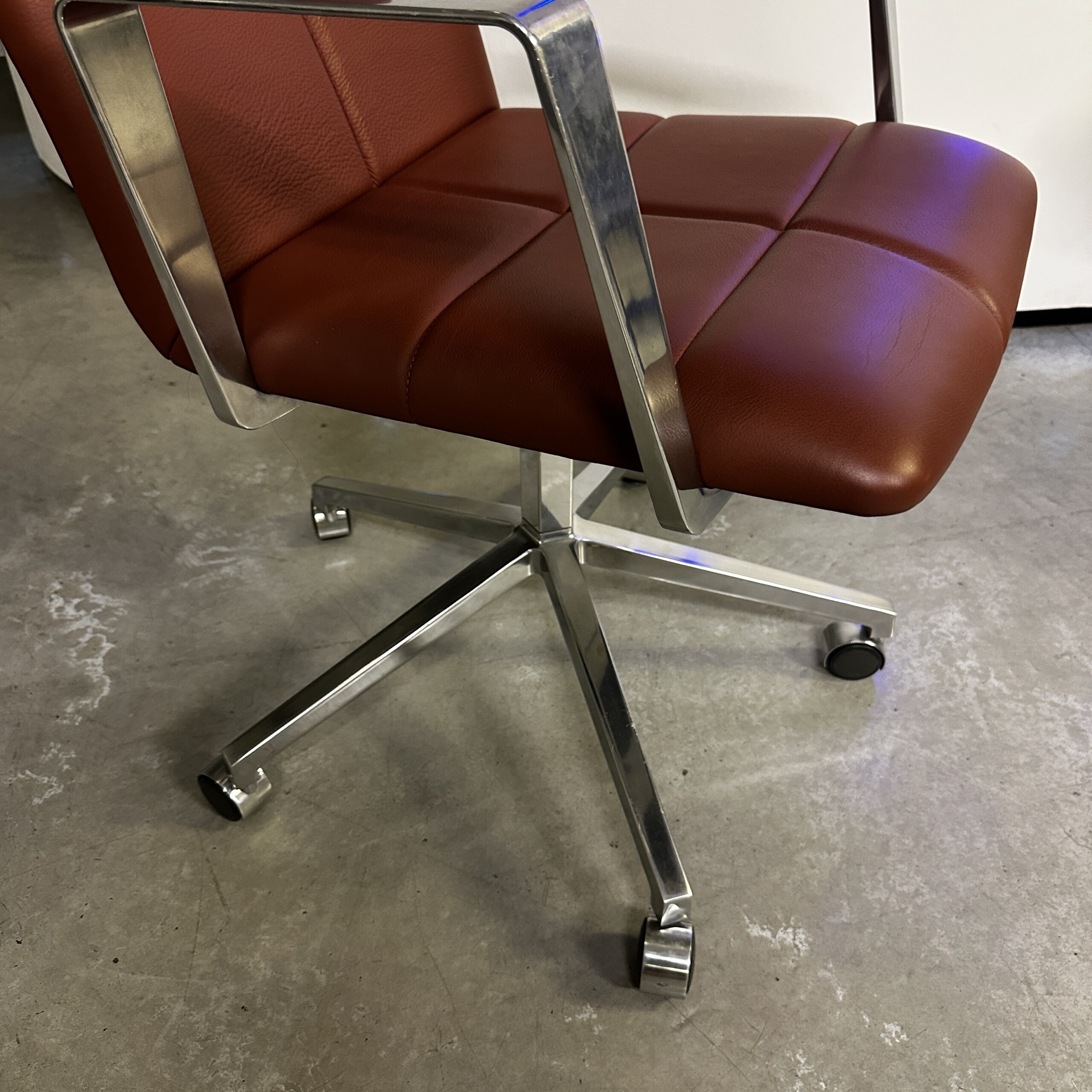 Seat and backrest in leather (brown). Star base in metal (aluminium). Adjustable height.