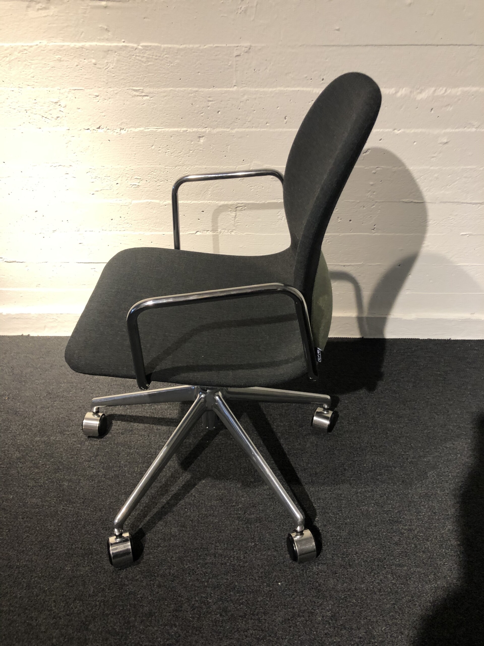 Seat and backrest in fabric (green). Star base in metal (chrome). Adjustable height.