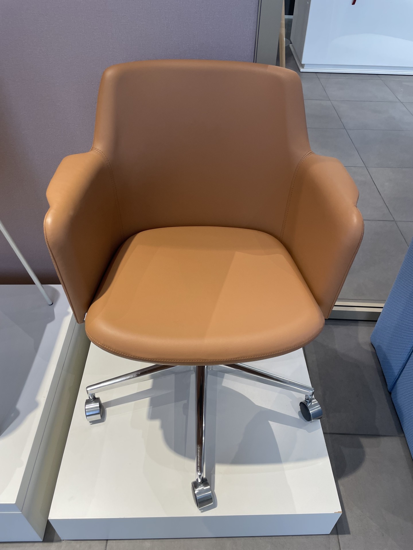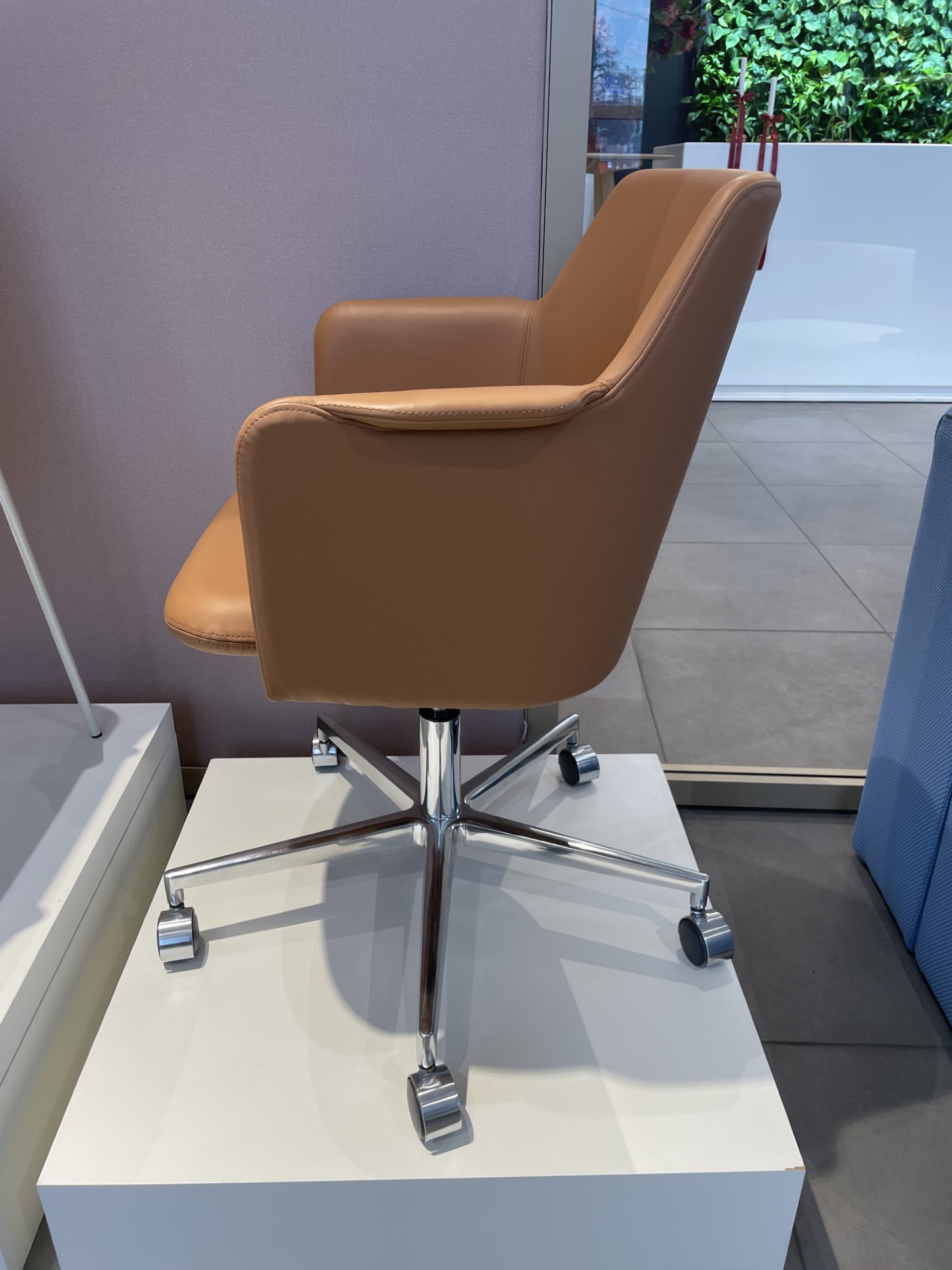Seat and backrest in leather (beige). Star base in metal (chrome).