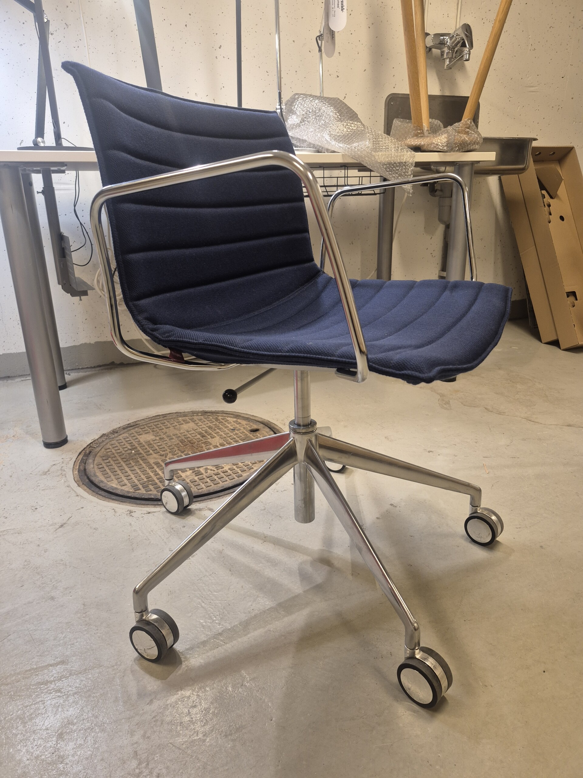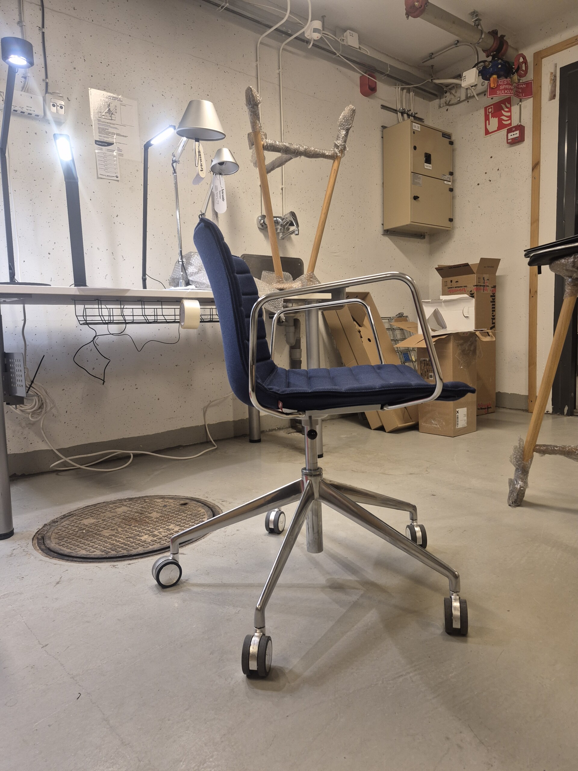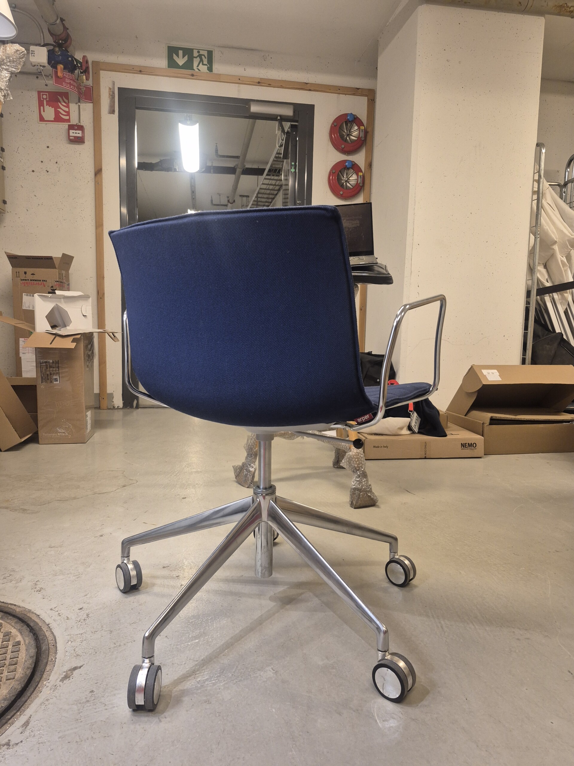 Seat and backrest in fabric (blue). Star base in metal (aluminium). Adjustable height.