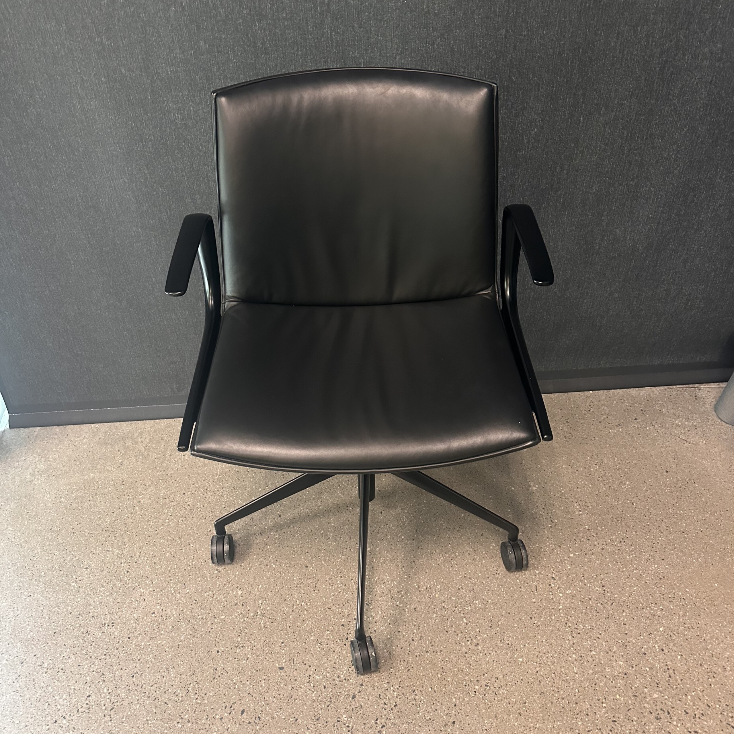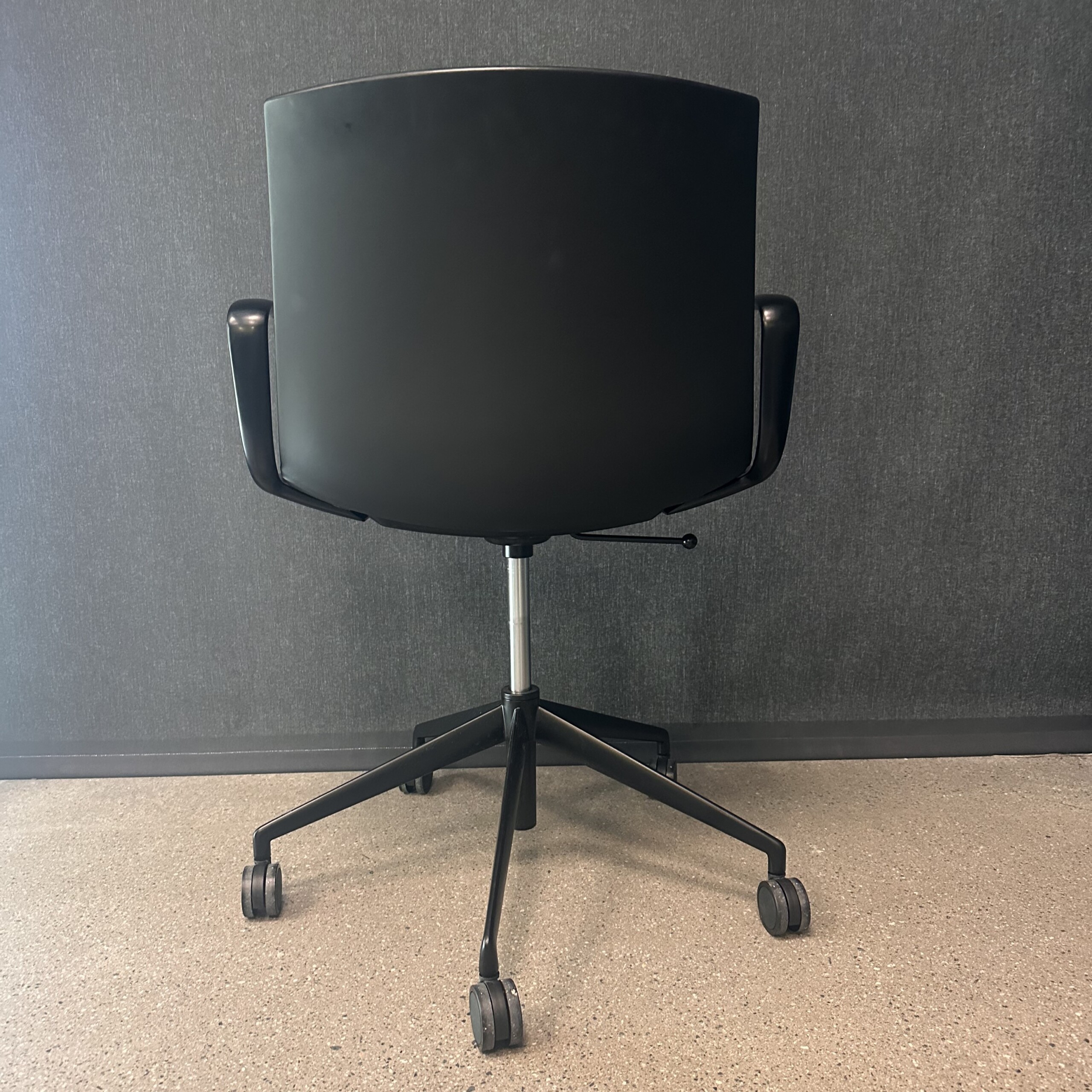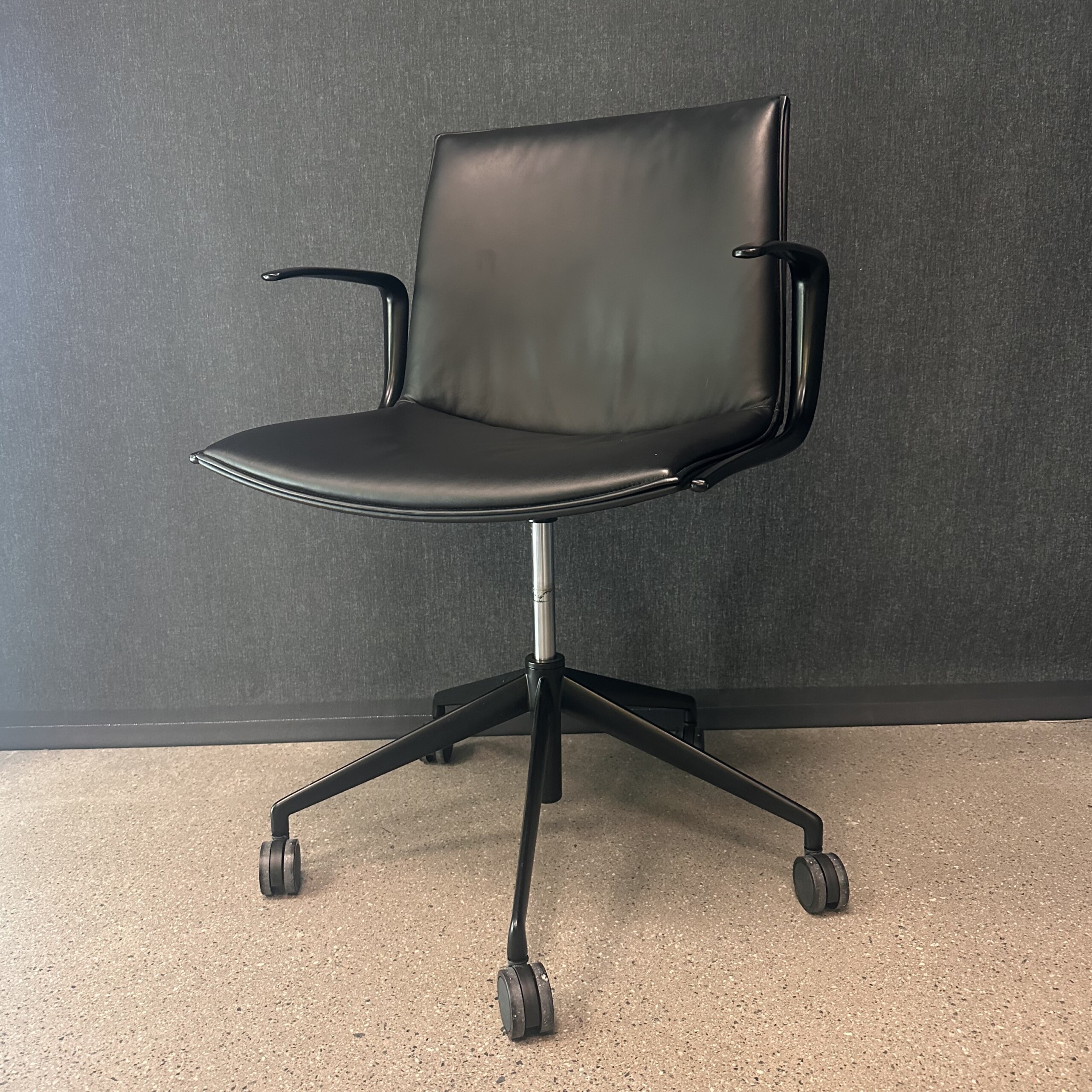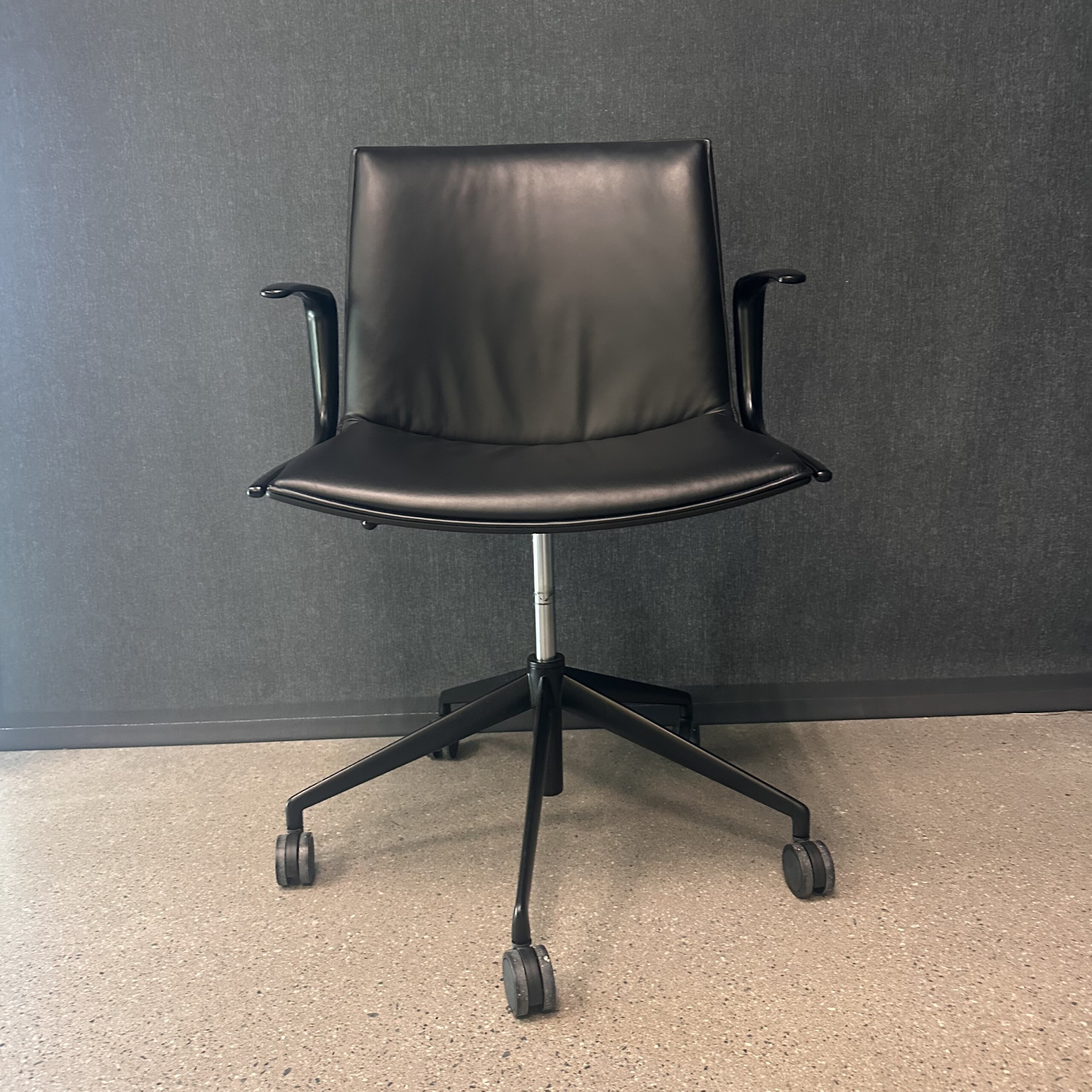 Seat and backrest in leather (black). Star base in metal (black). Adjustable height.