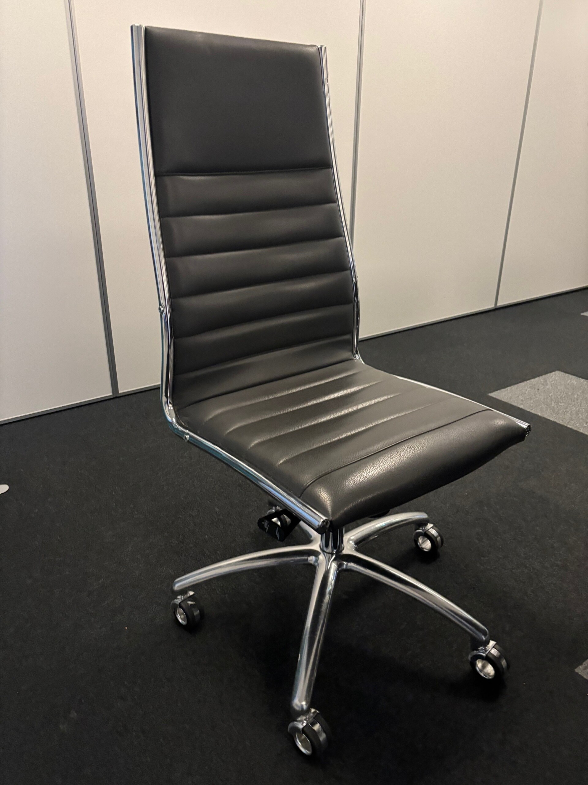 Seat and backrest in leather (black). Star base in metal (chrome). Adjustable height.
