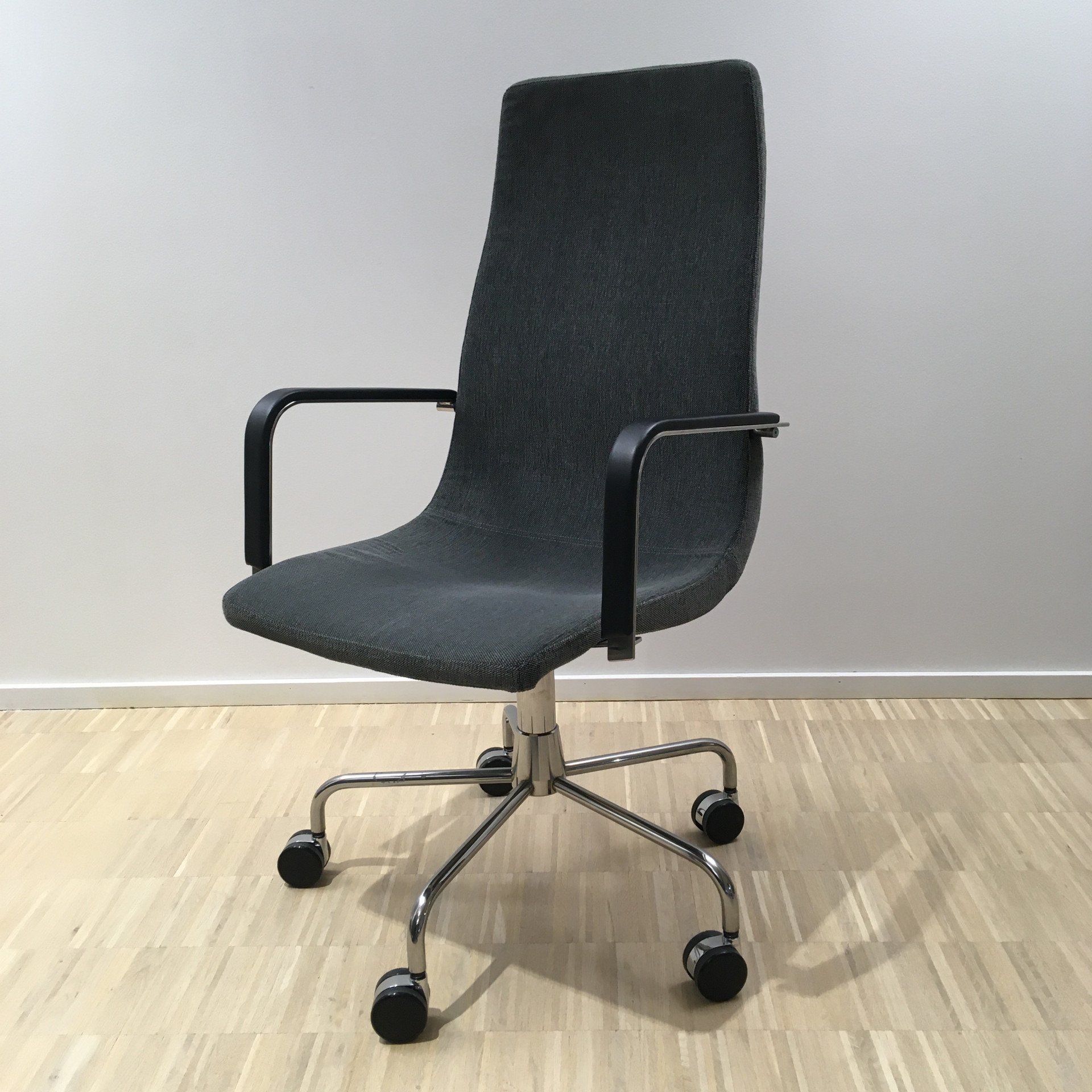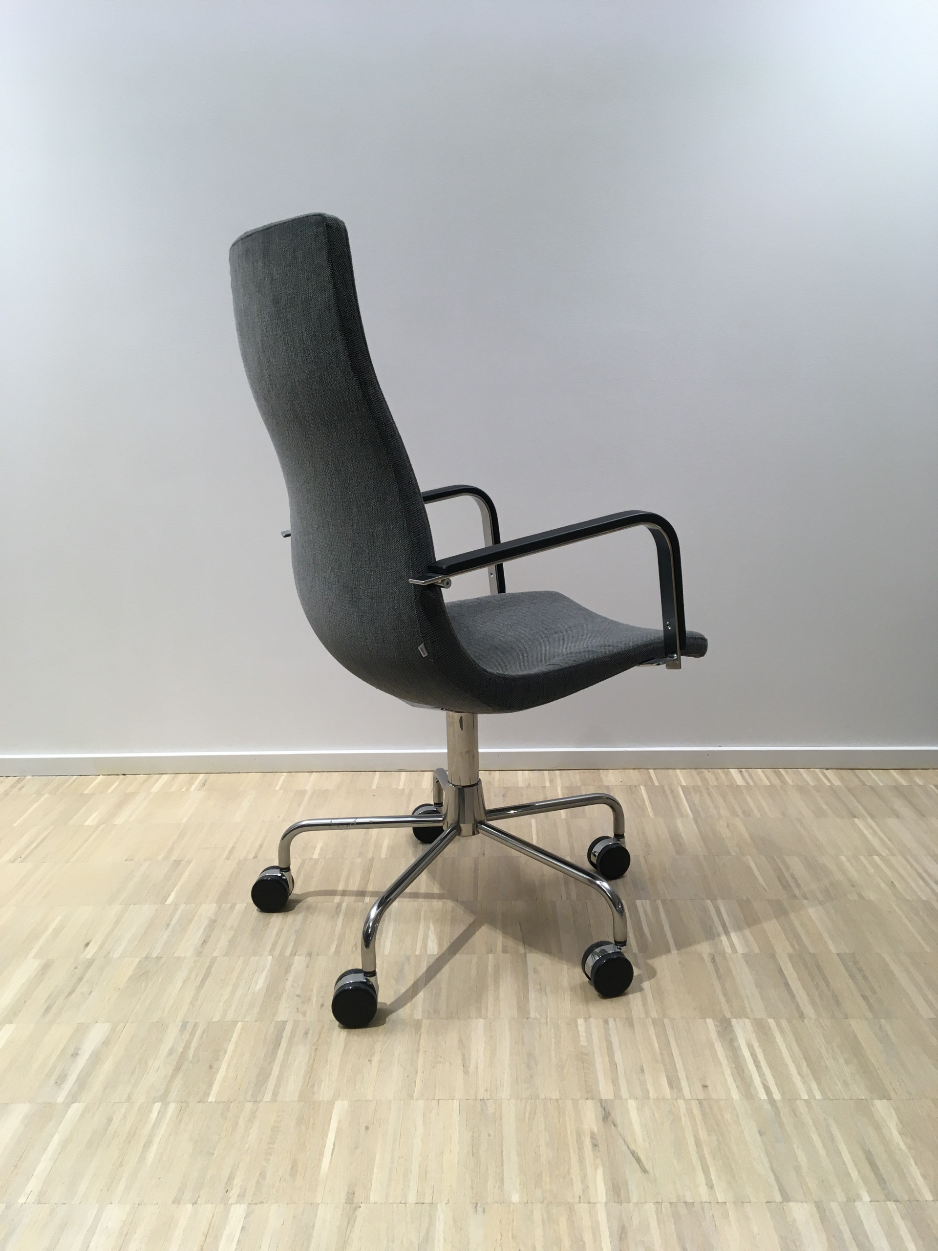 Seat and backrest in fabric (grey). Star base in metal (aluminium).