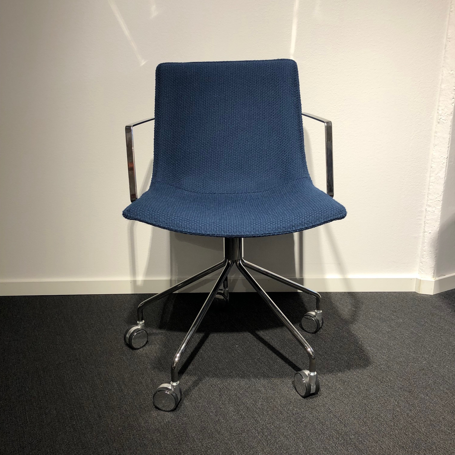 Seat and backrest in fabric (blue). Star base in metal (chrome).