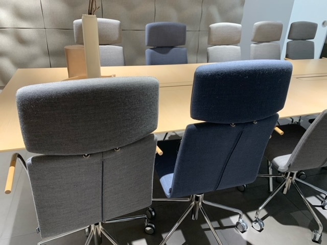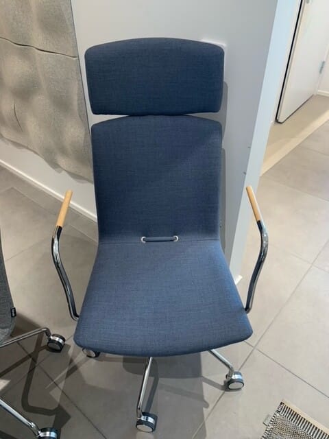 Seat and backrest in fabric (blue). Star base in metal (chrome). Adjustable height.