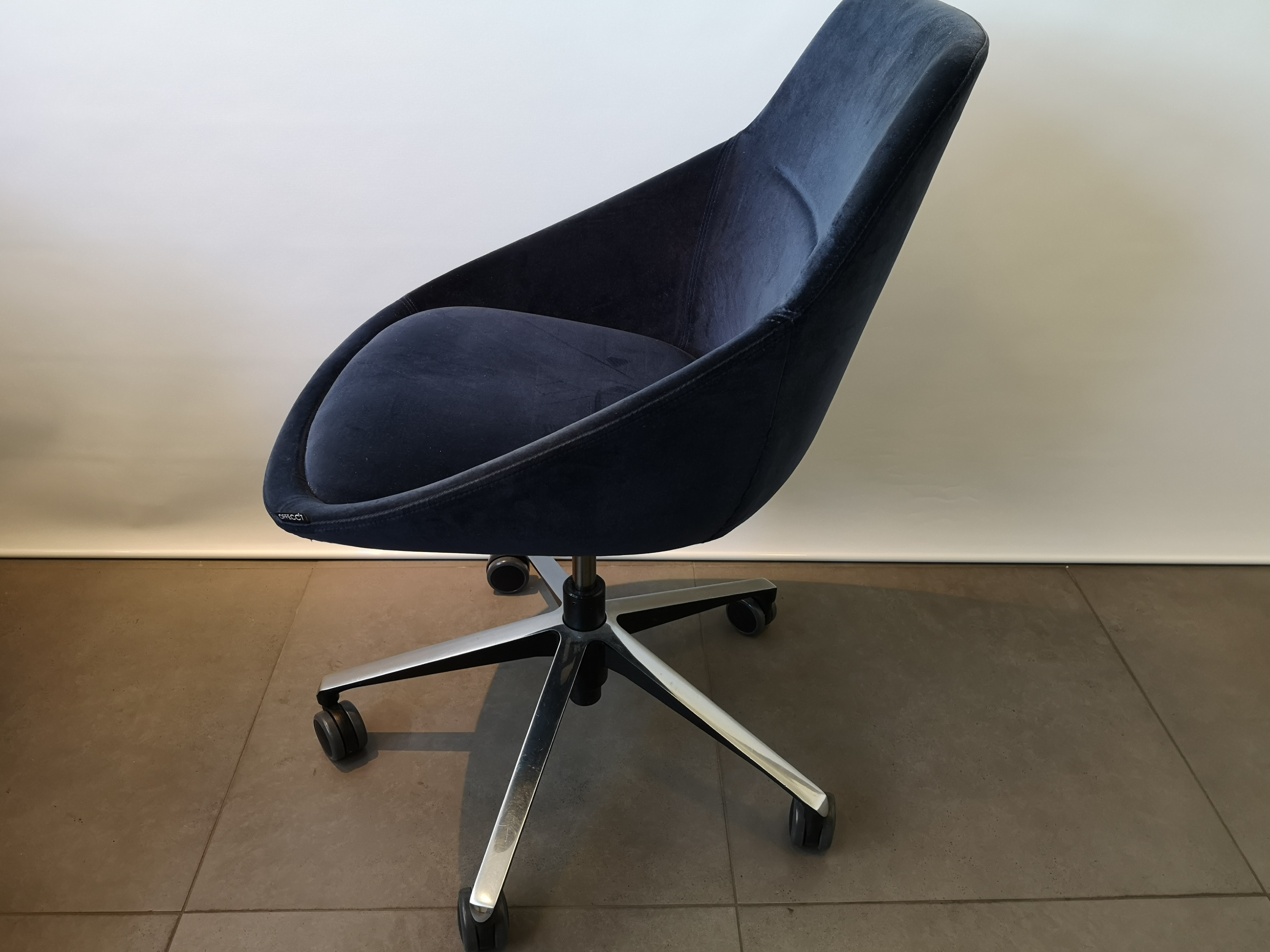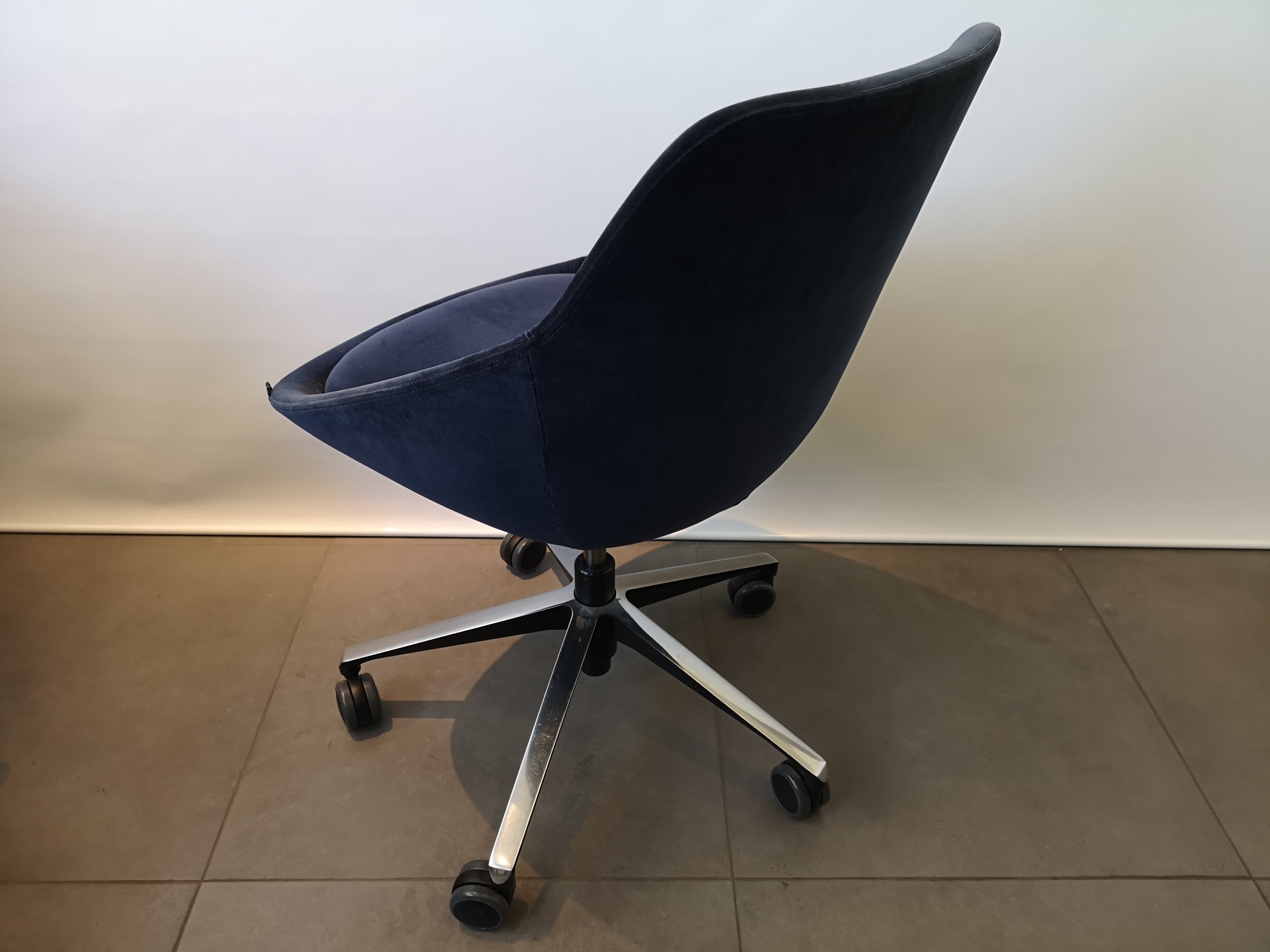 Seat and backrest in fabric (blue). Star base in metal (chrome). Adjustable height.