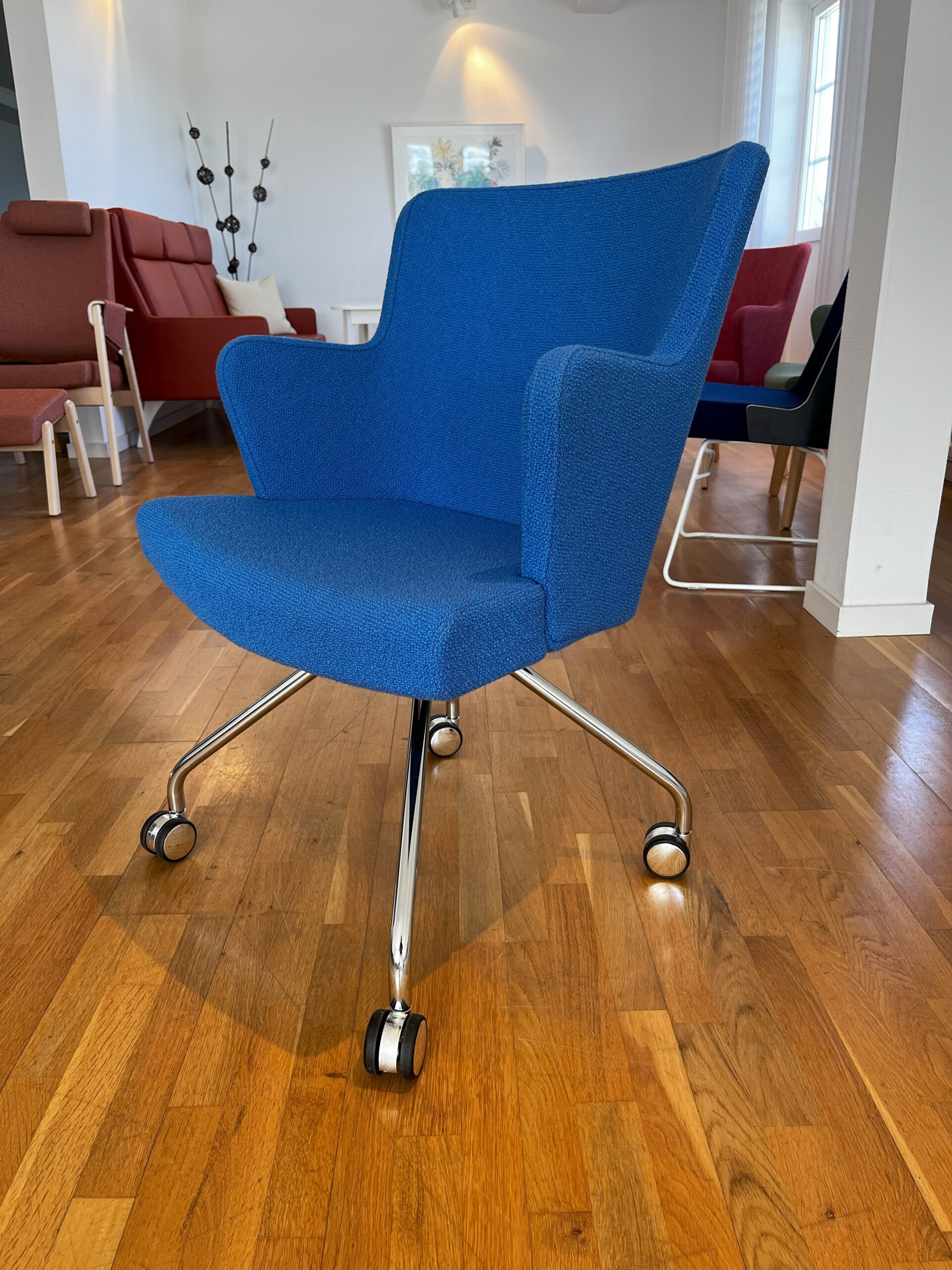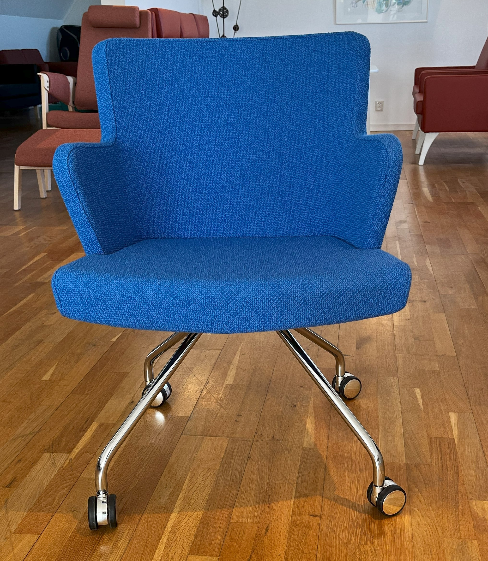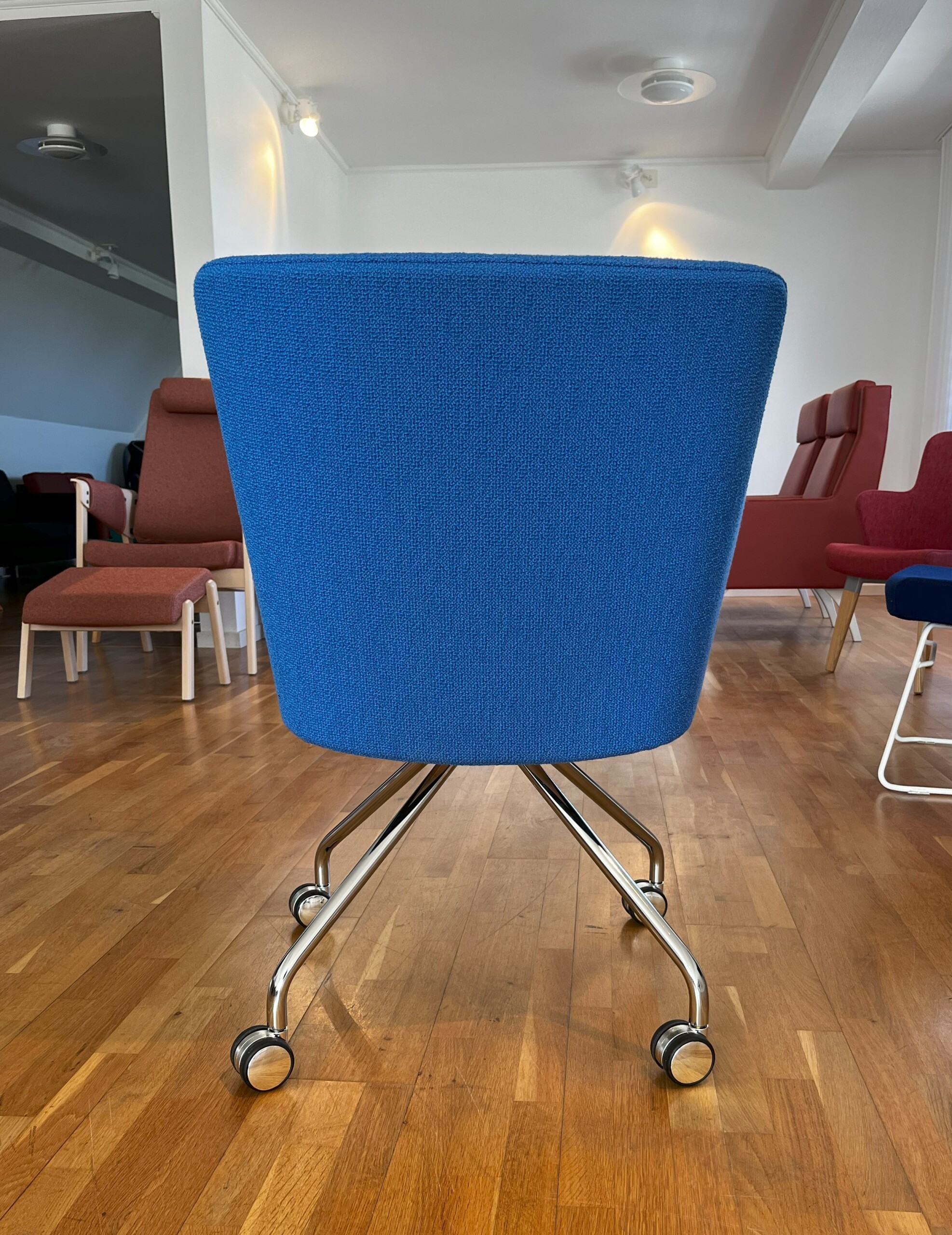 Seat and backrest in fabric (blue). Star base in metal (chrome).