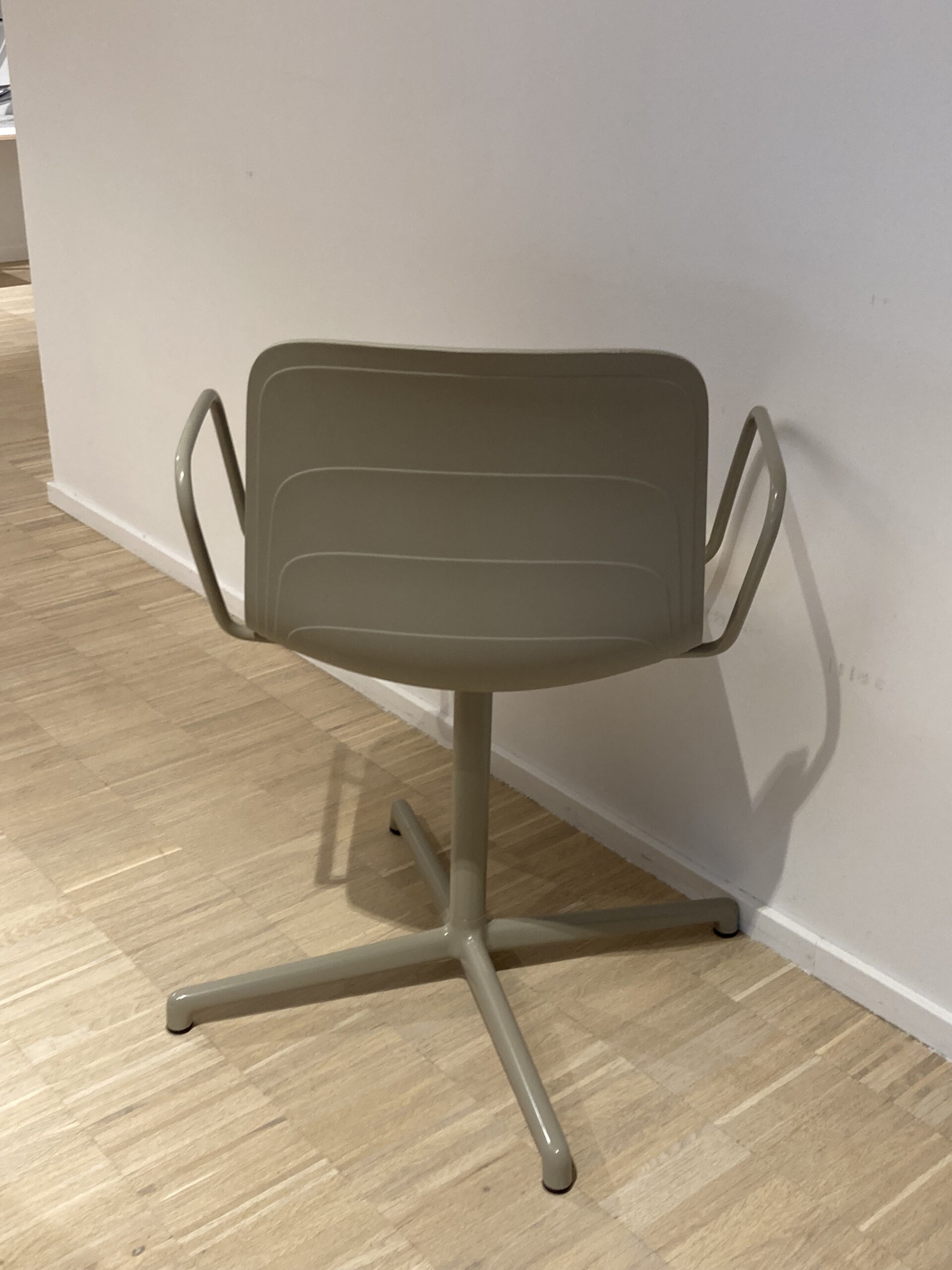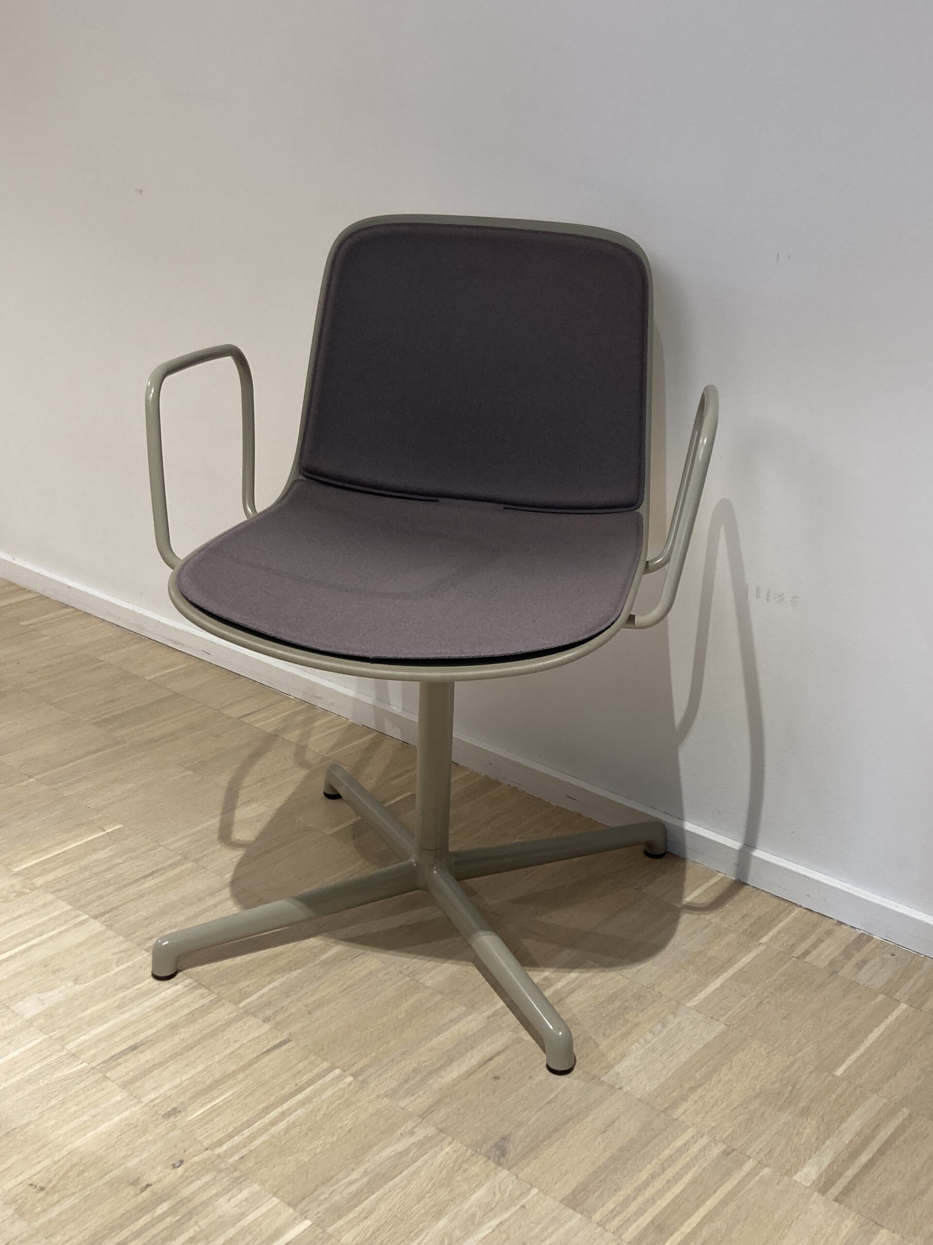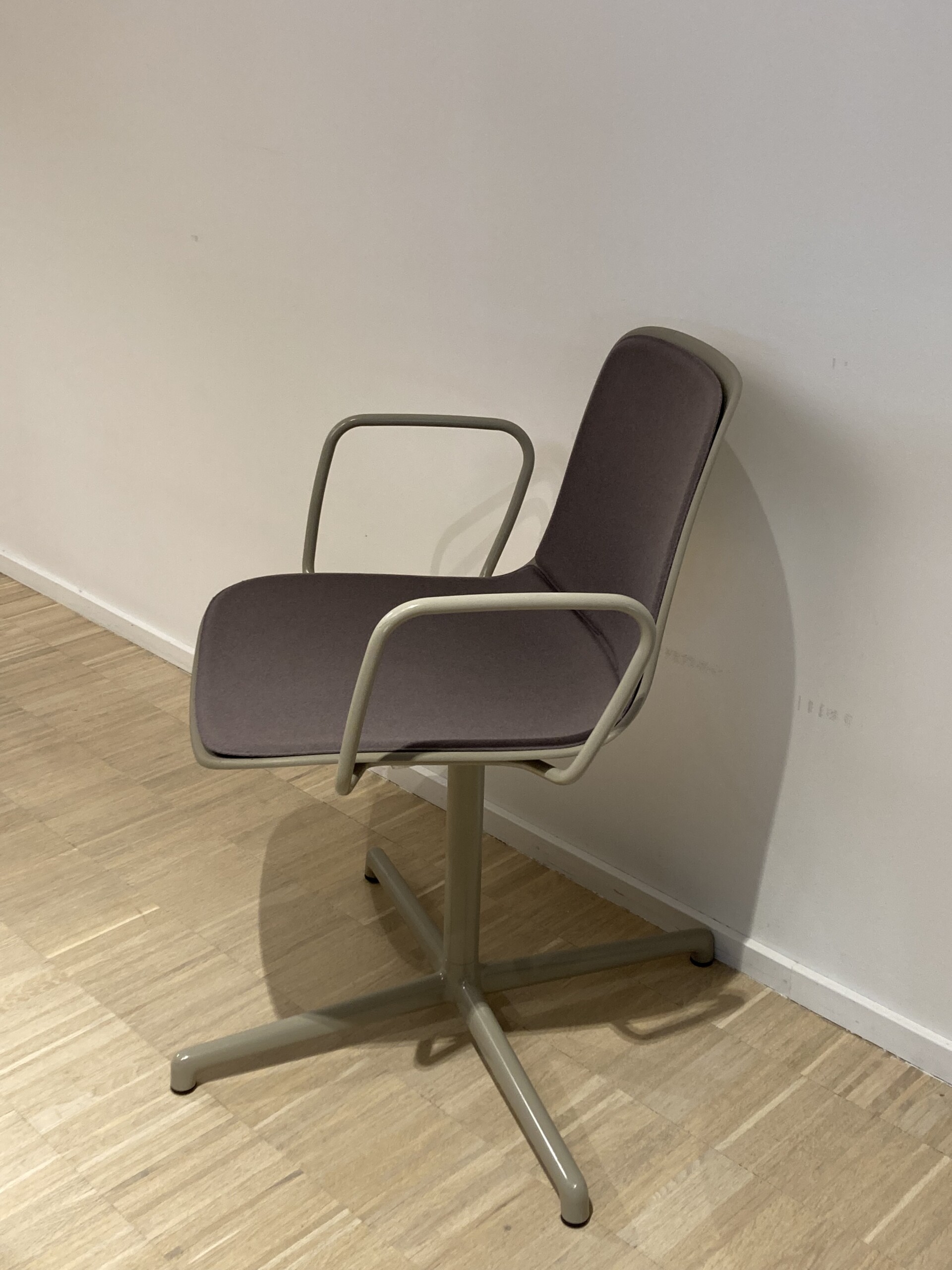 Seat in fabric (purple). Backrest in plastic (grey). Star base in metal (grey).