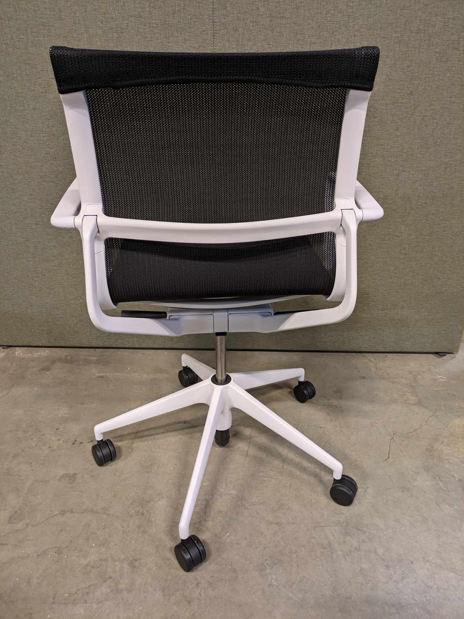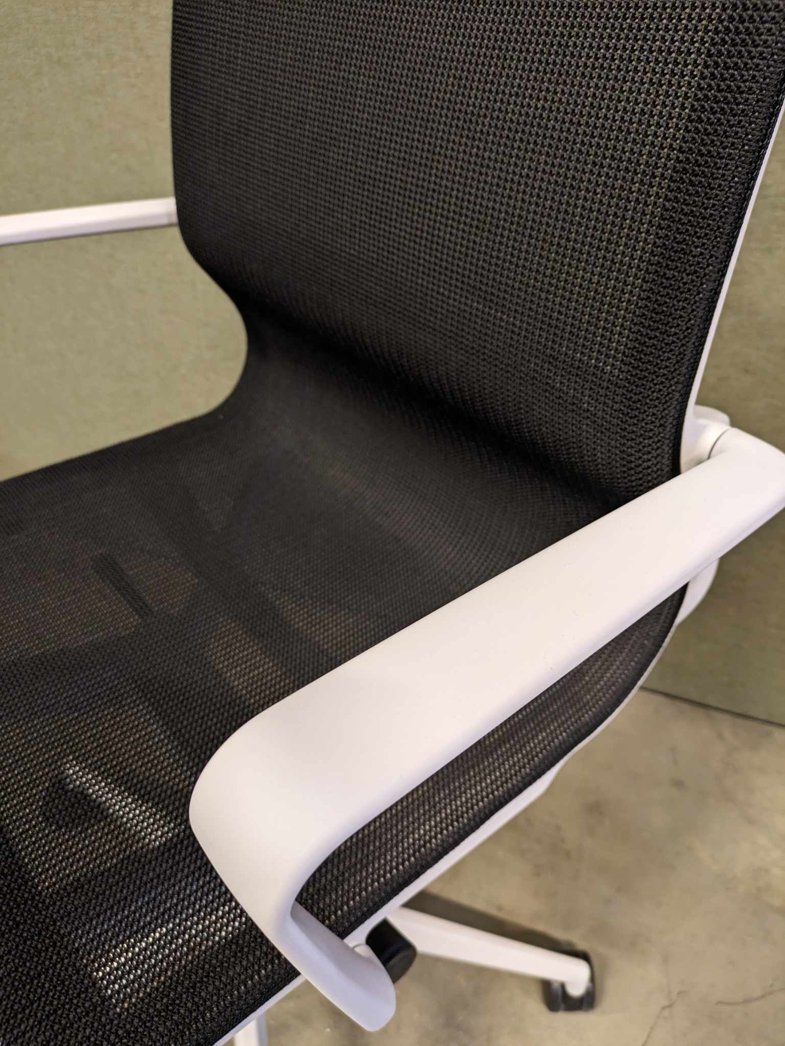 Seat and backrest in mesh (black). Legs in metal (white). Adjustable height.