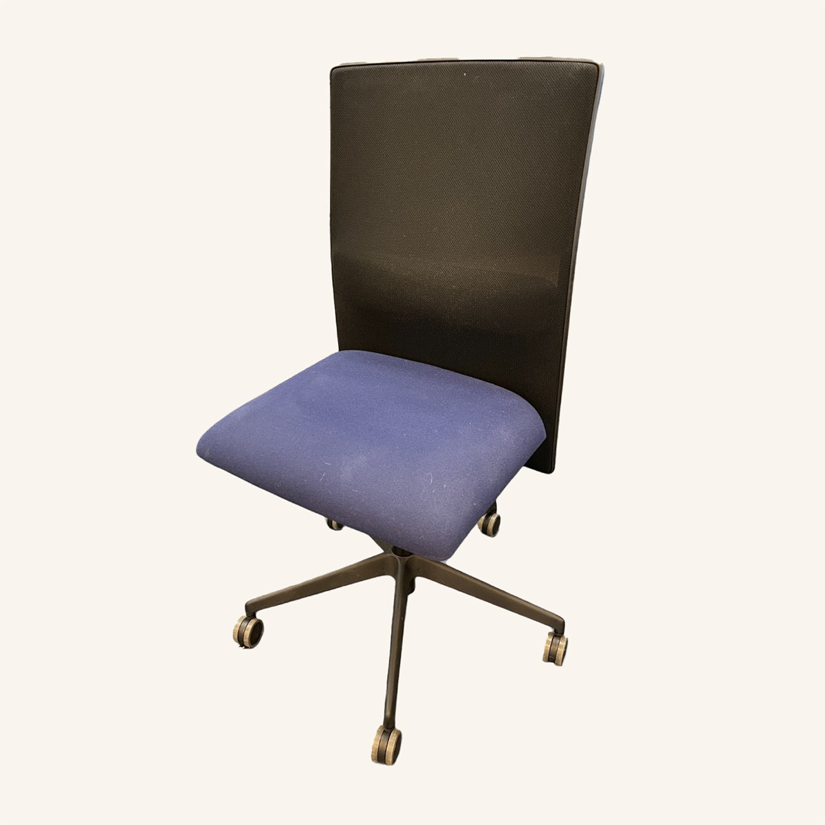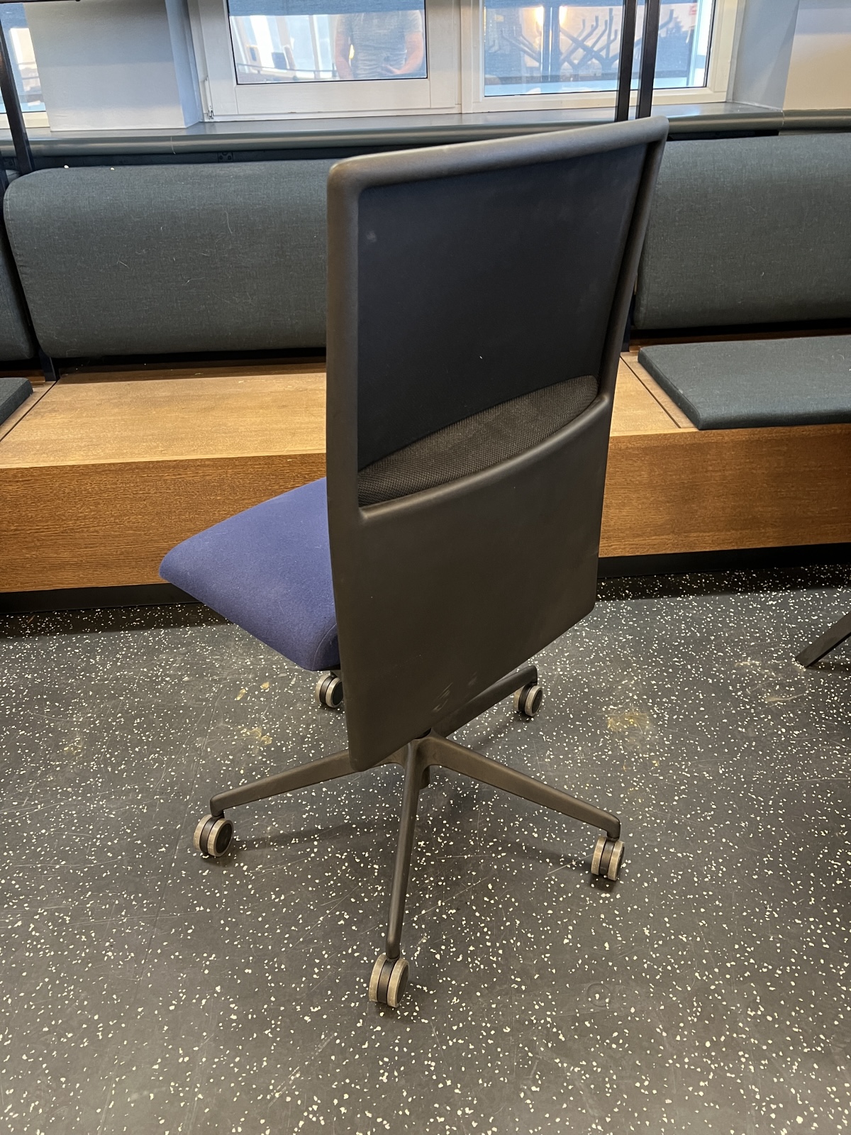 Seat in fabric (blue). Backrest in mesh (black). Star base in plastic (black). Adjustable height.