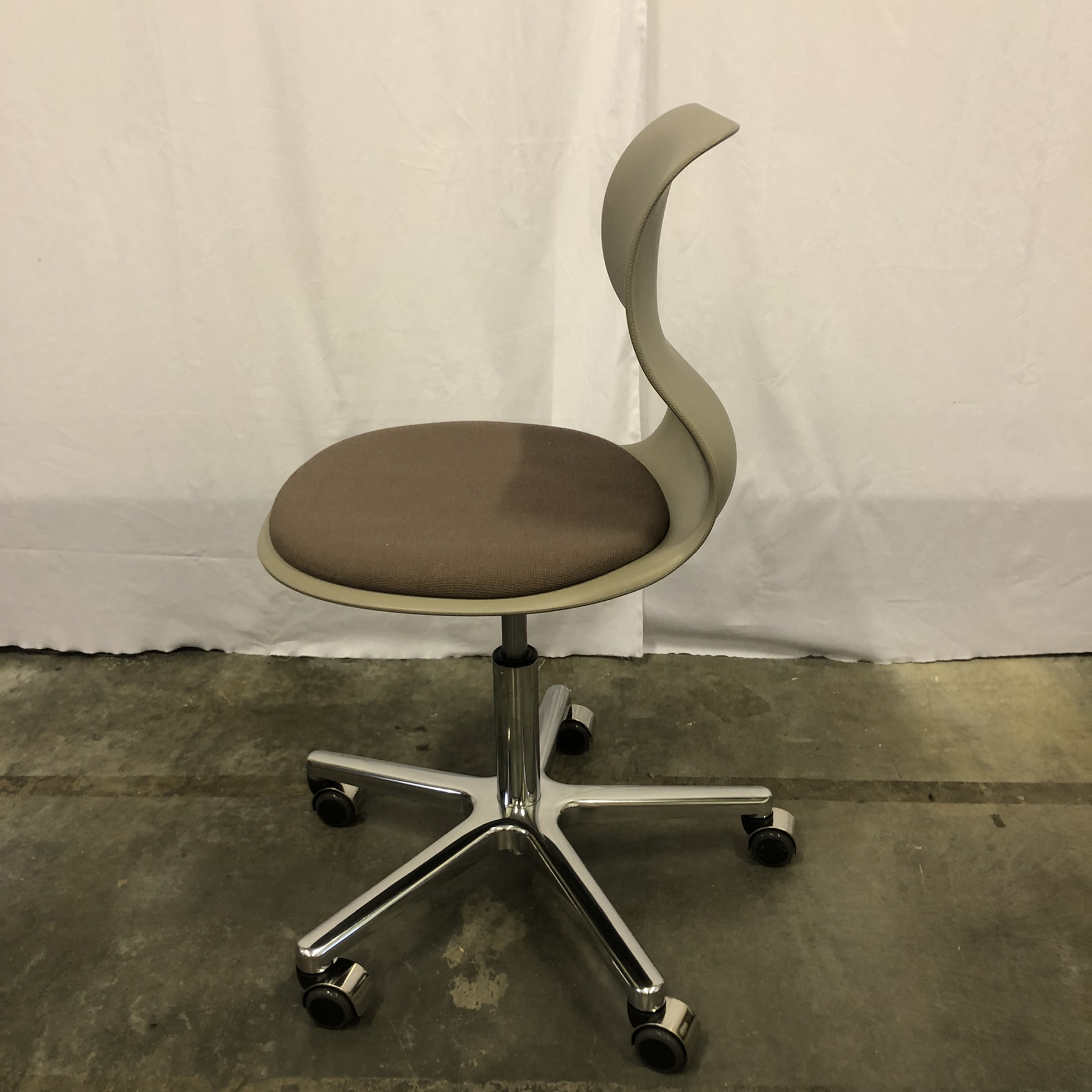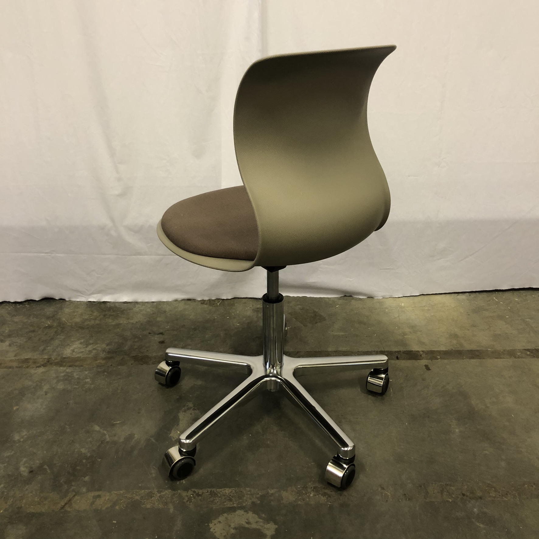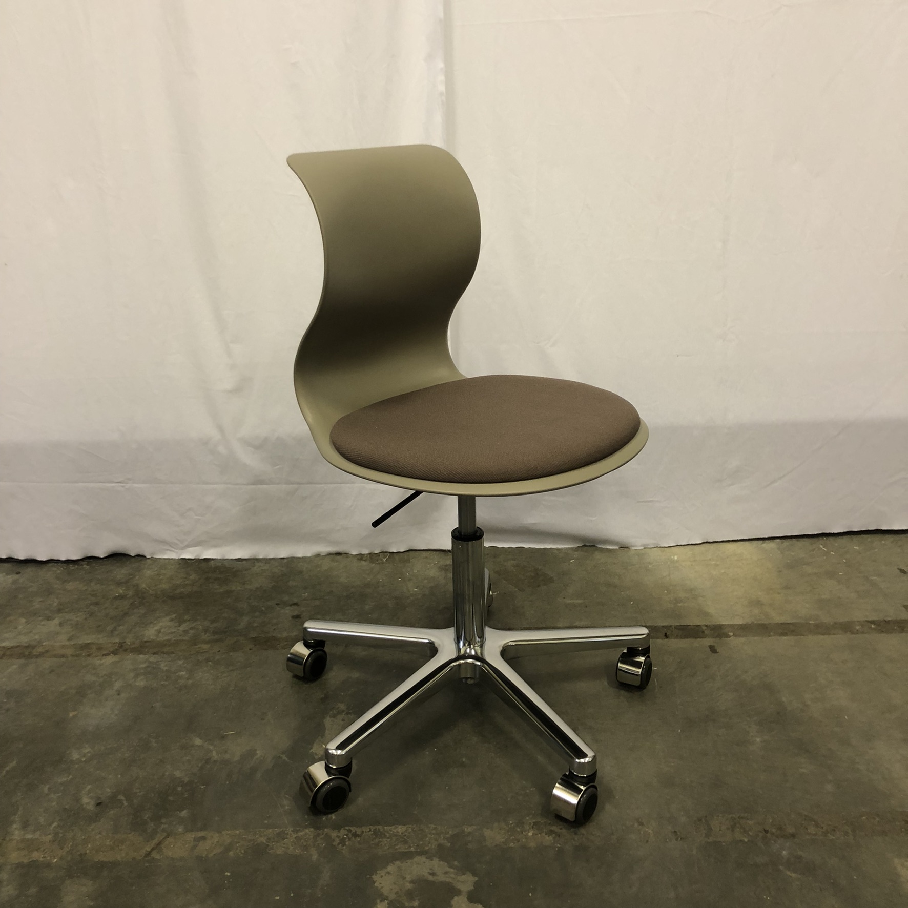 Seat in fabric (brown). Backrest in plastic (green). Star base in metal (chrome).