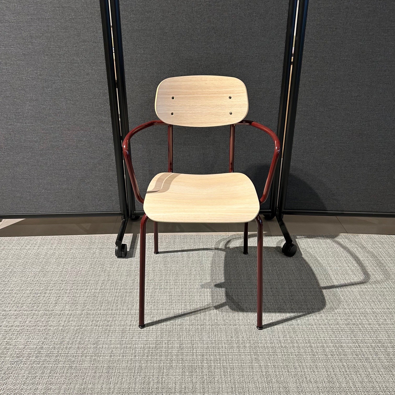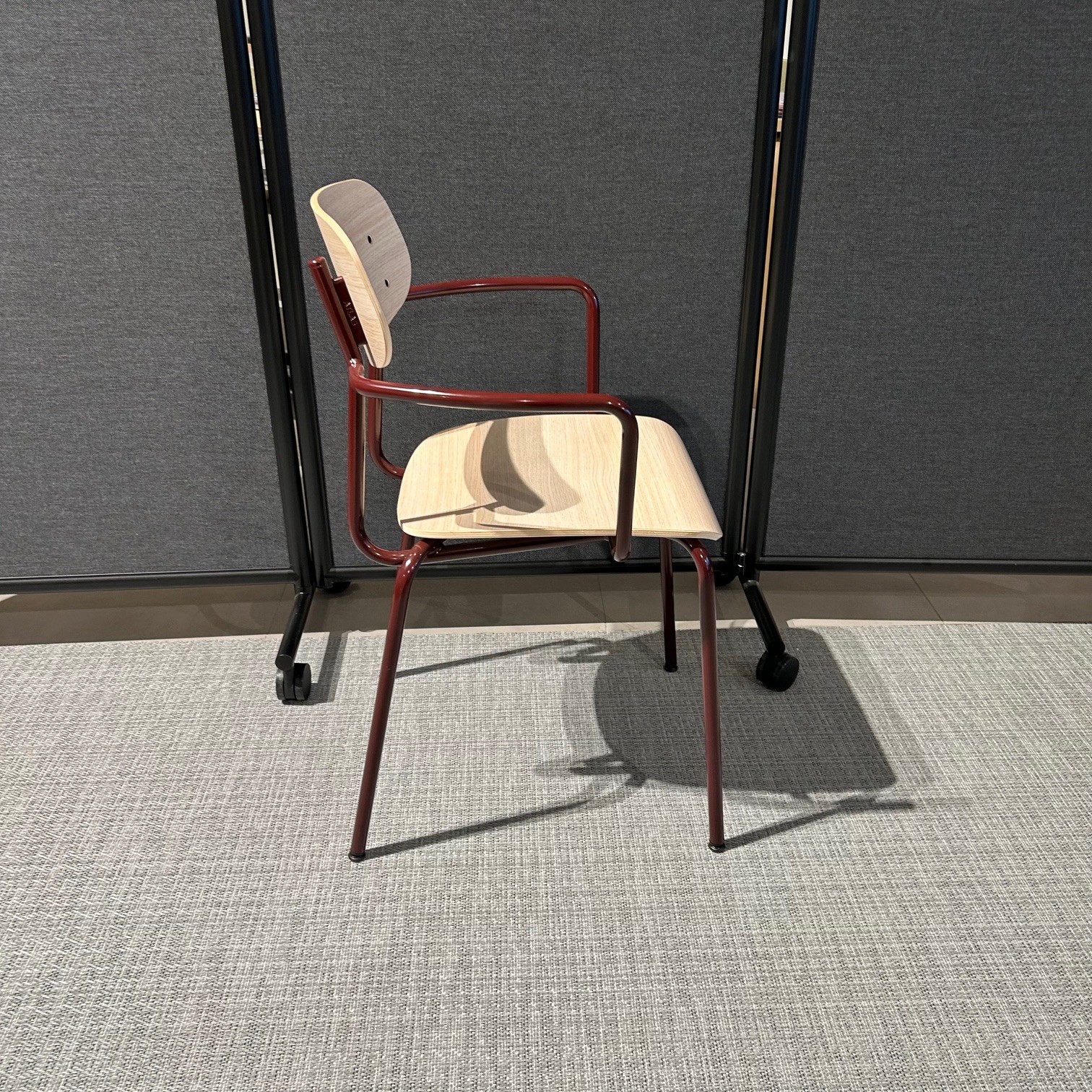 Seat and backrest in laminat (oak). Legs in metal (red).
